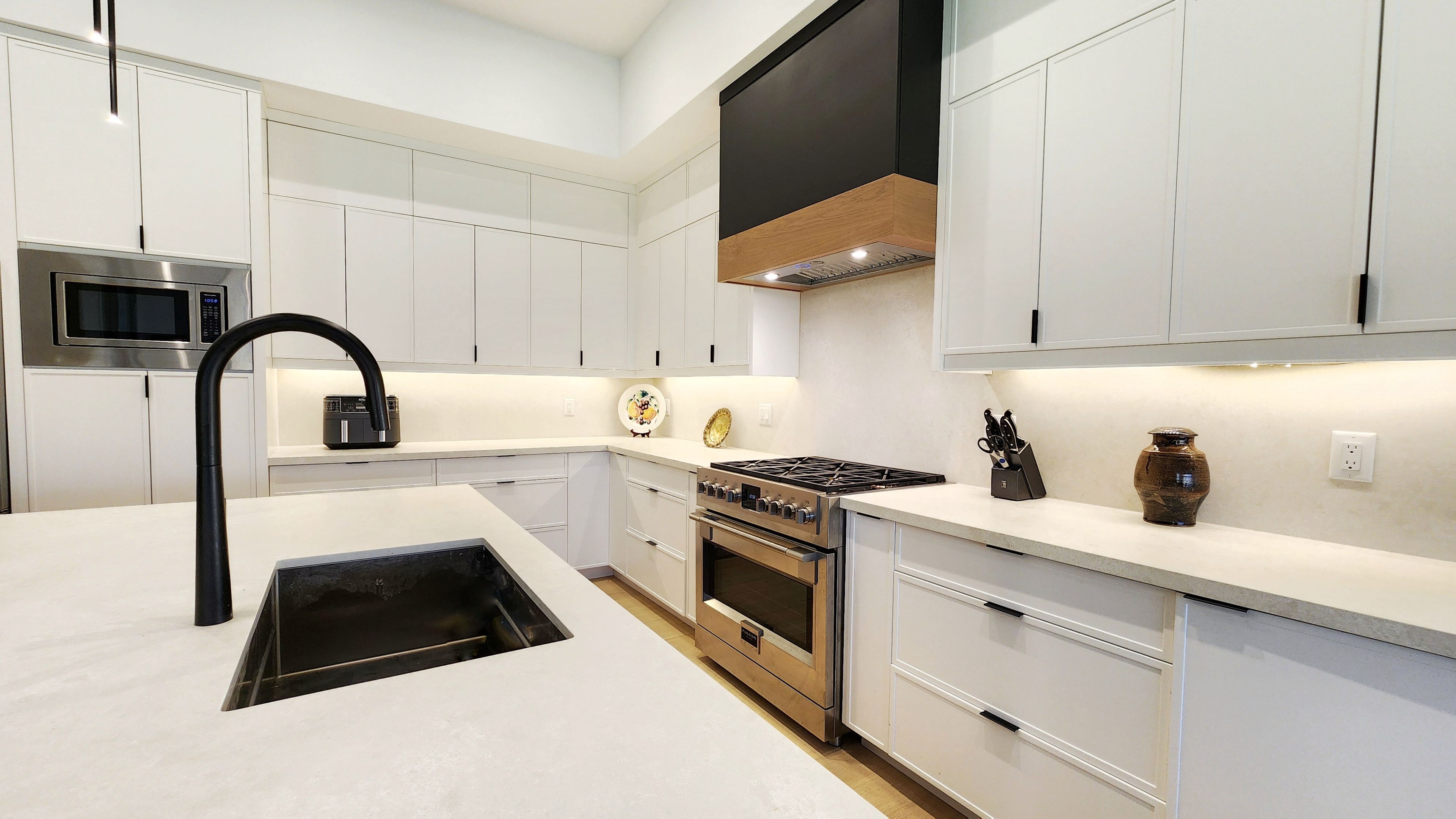 • Custom kitchen features built-in appliances and spacious island for gatherings.