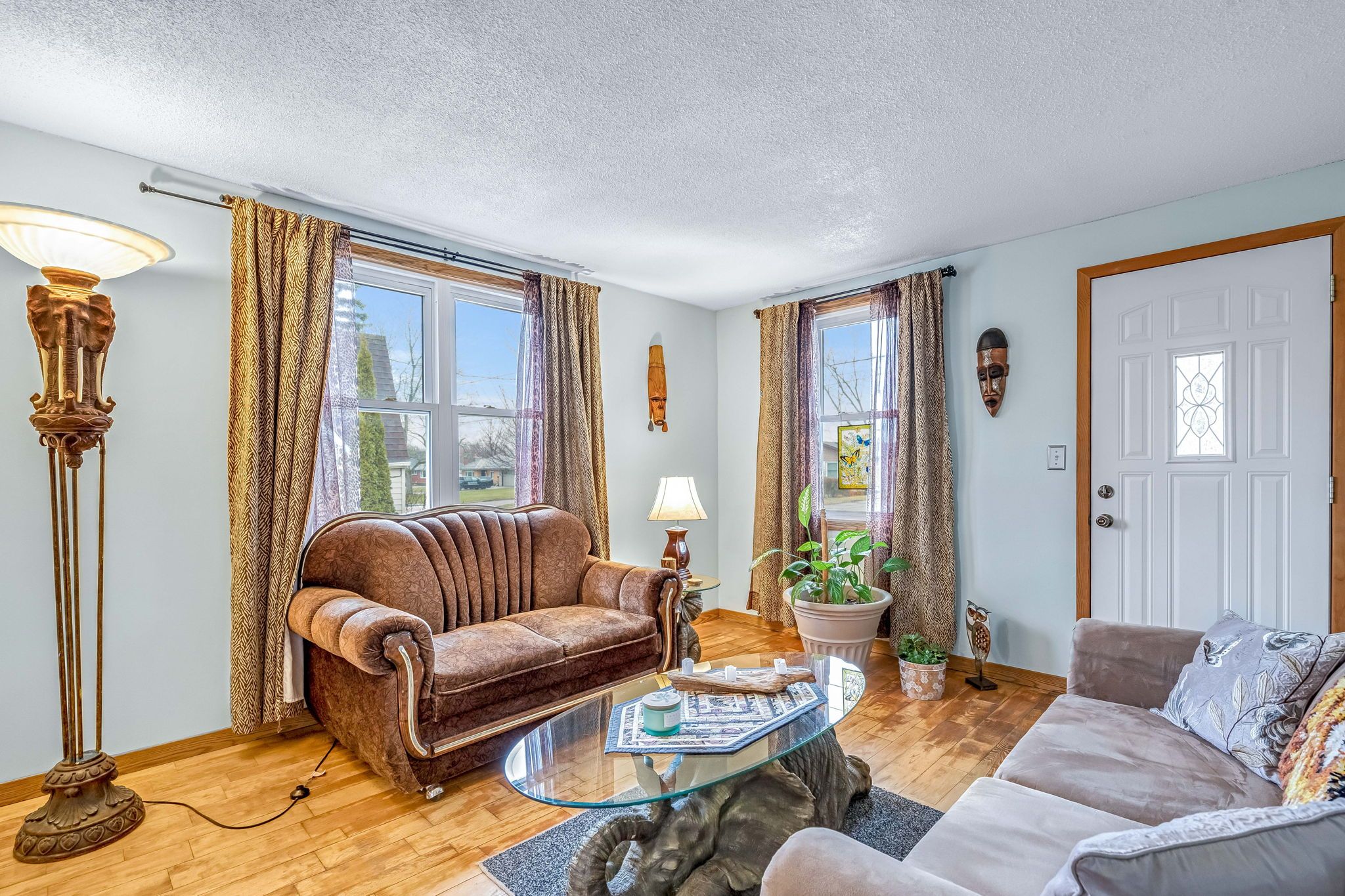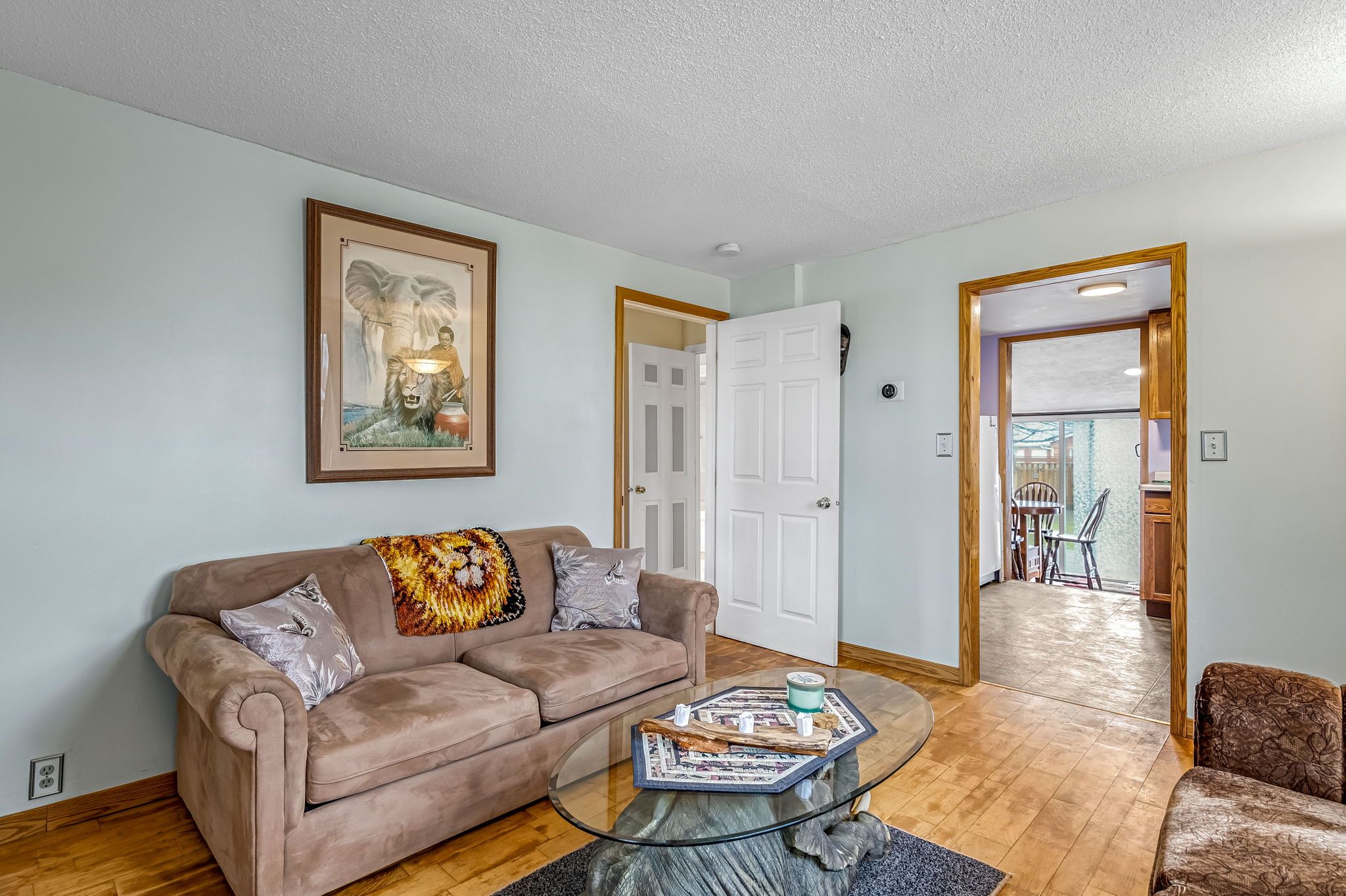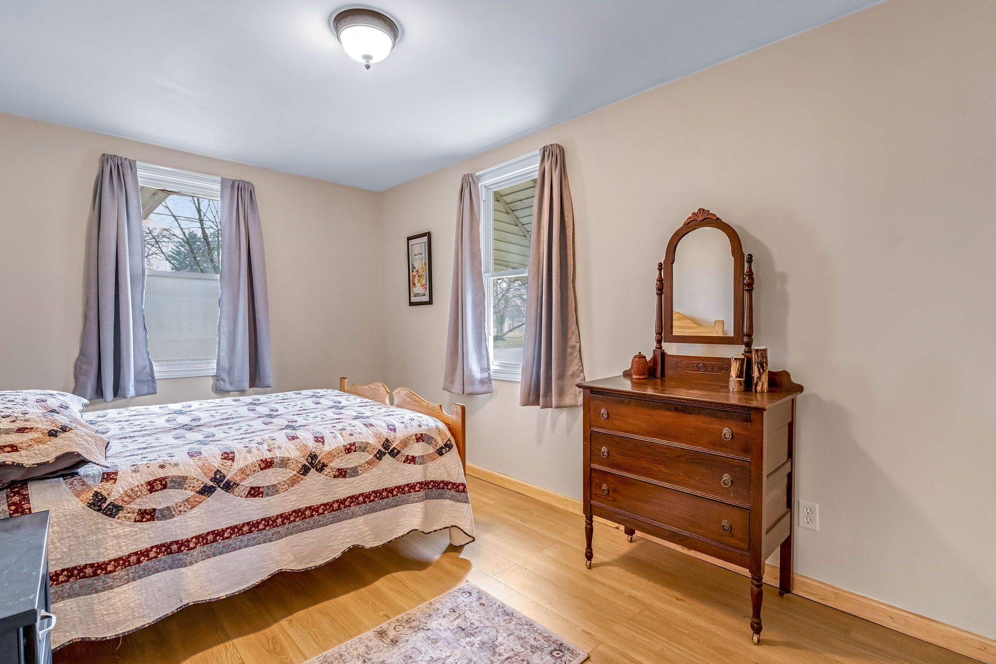 • Spacious primary bedroom with a bright living room featuring hardwood flooring.