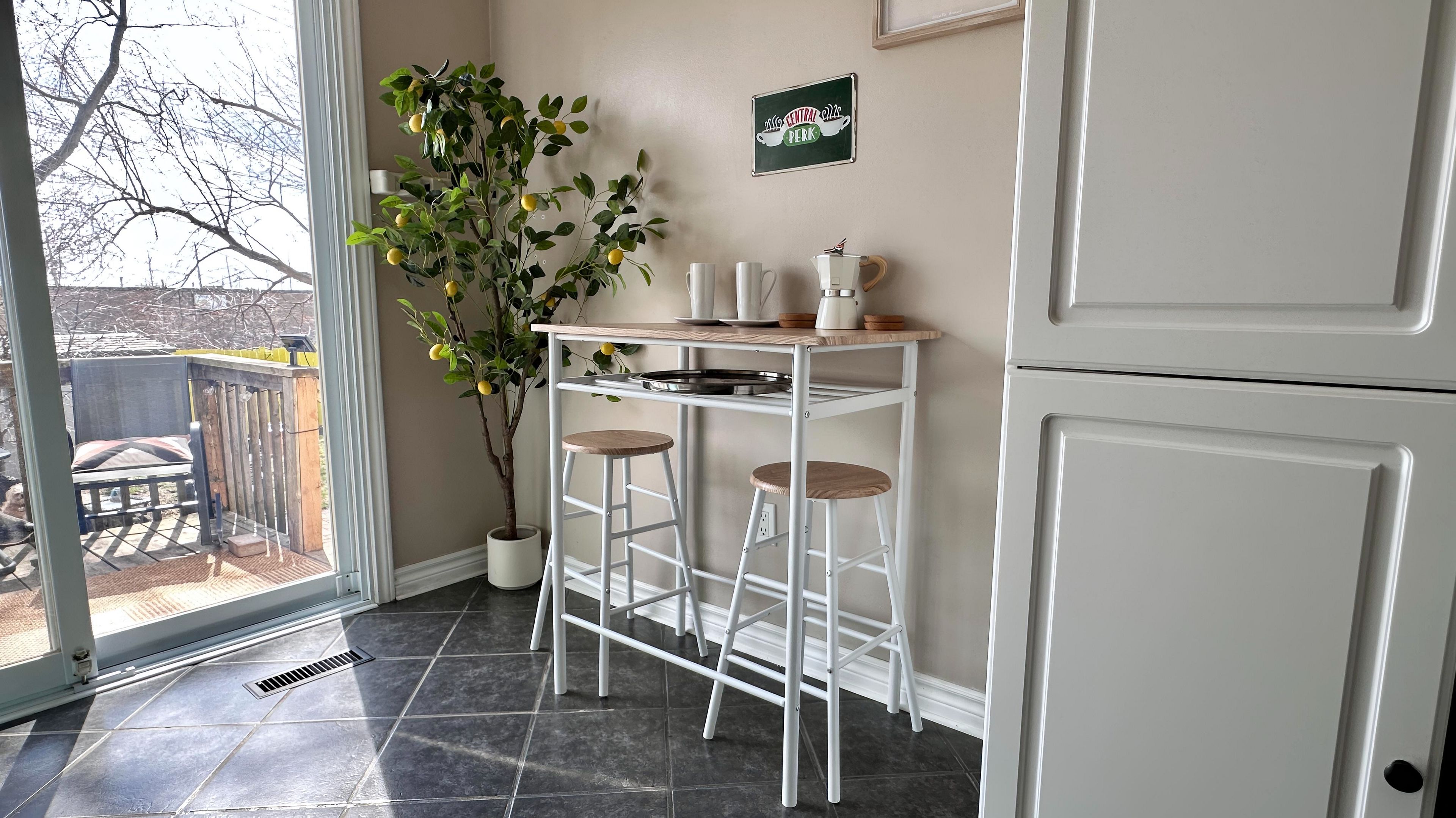 • Bright kitchen with sliding doors leading to a large, private backyard.