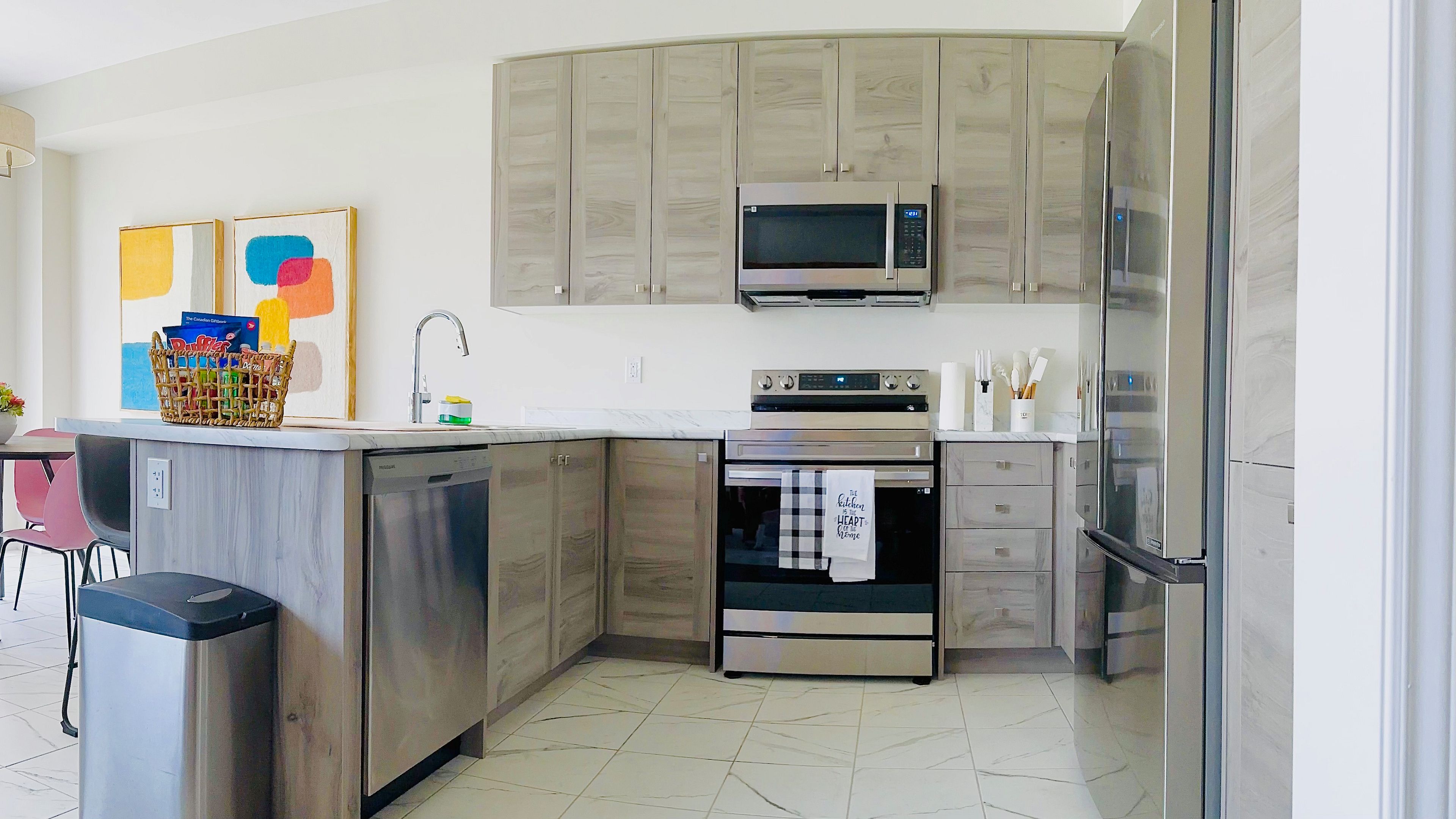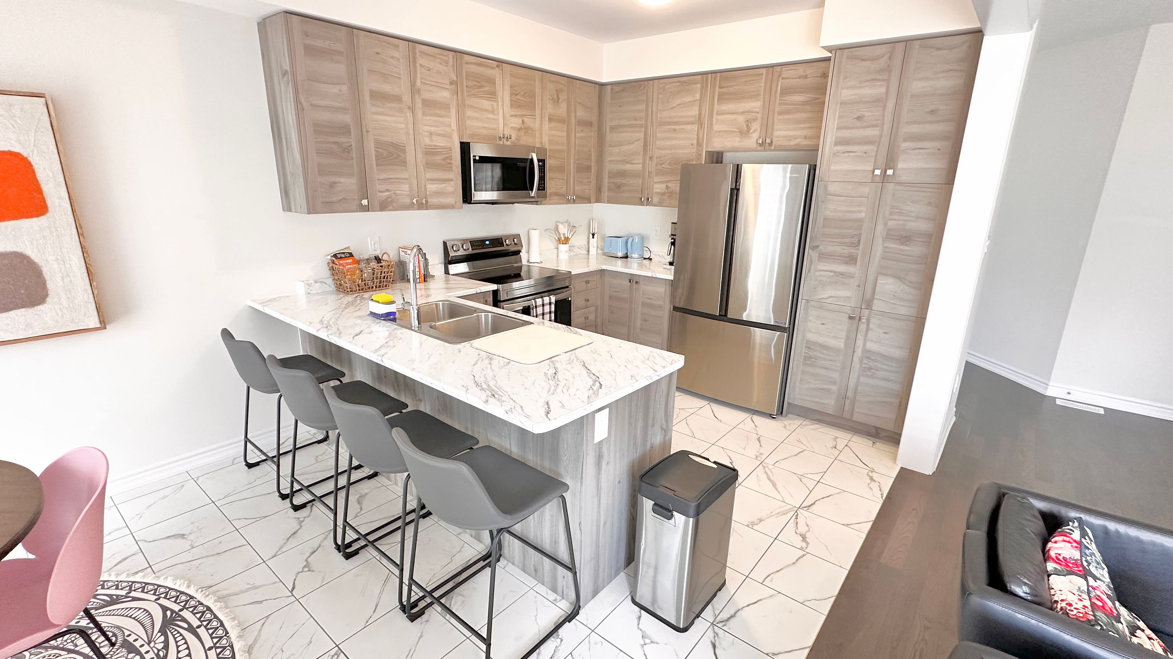 • Stylish kitchen with ceramic tiles and a cozy eat-in area.