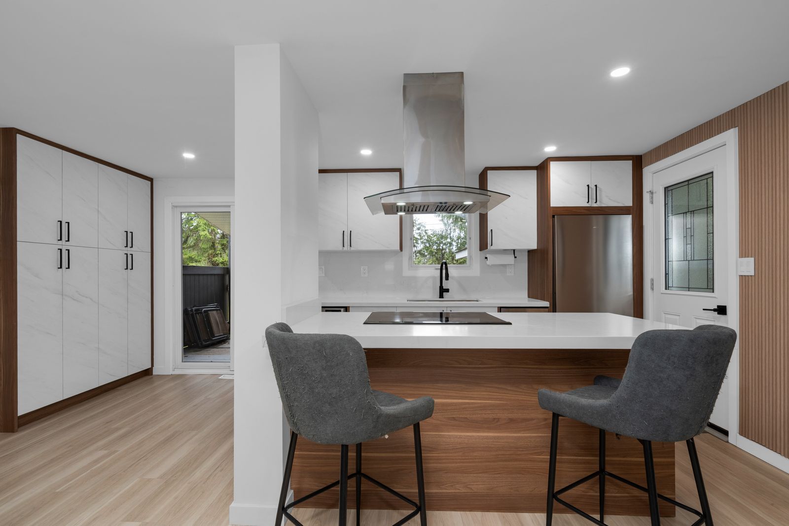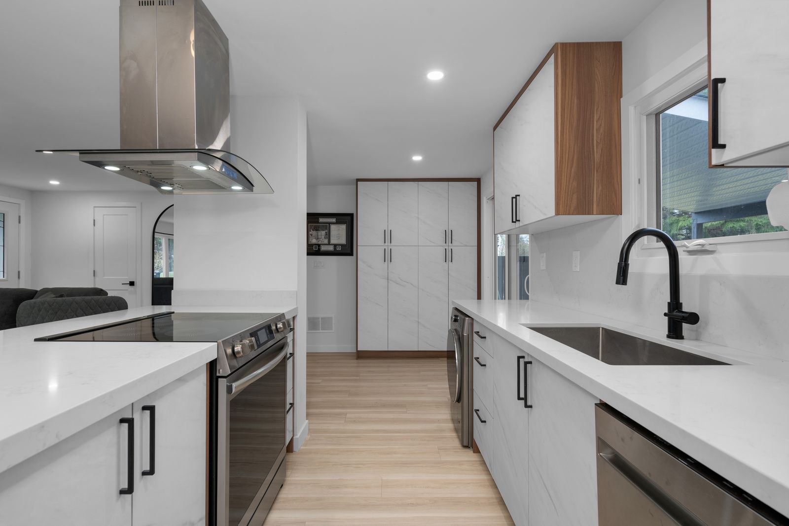• Stylish kitchen with quartz countertops and stainless steel appliances.