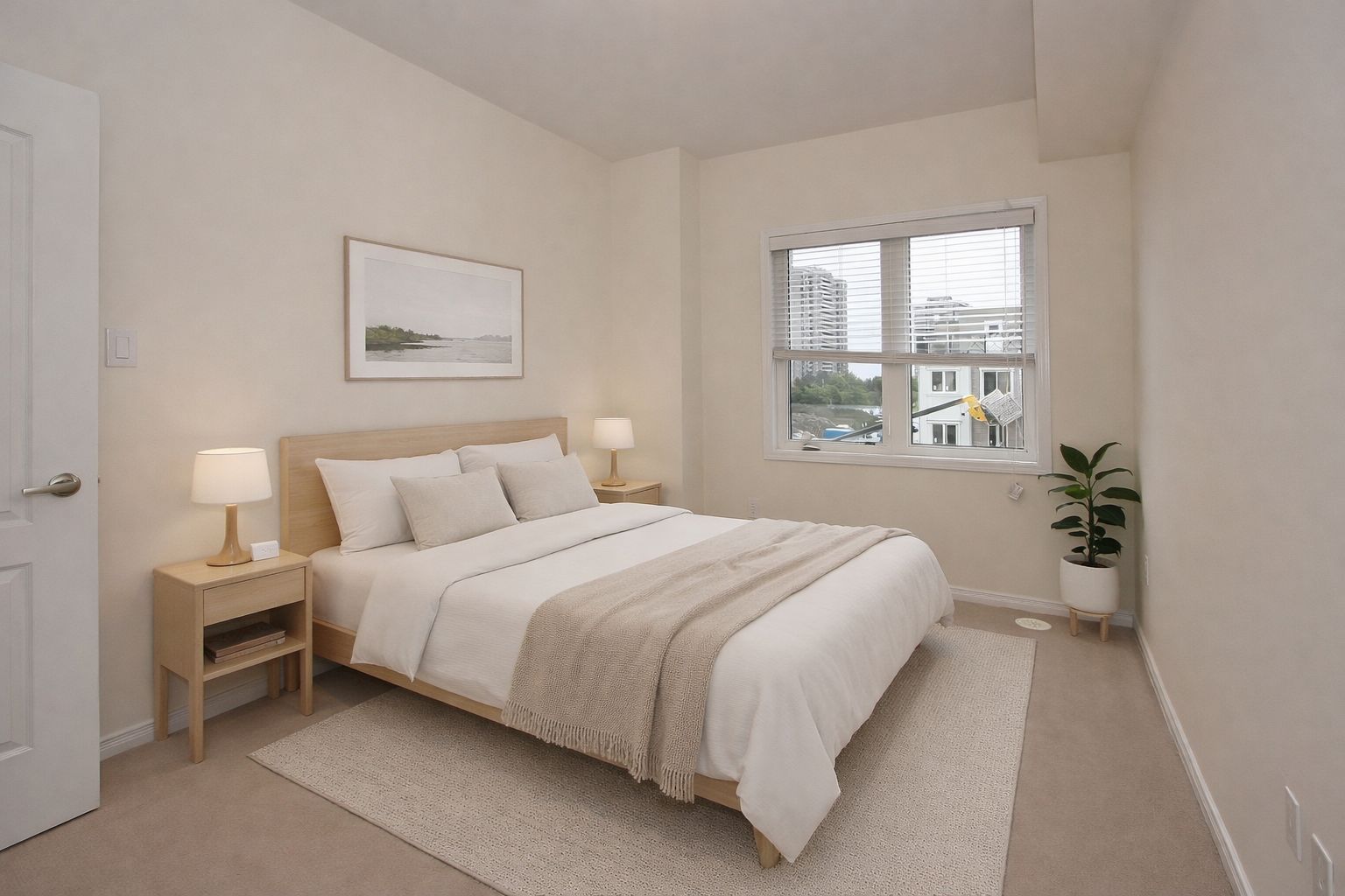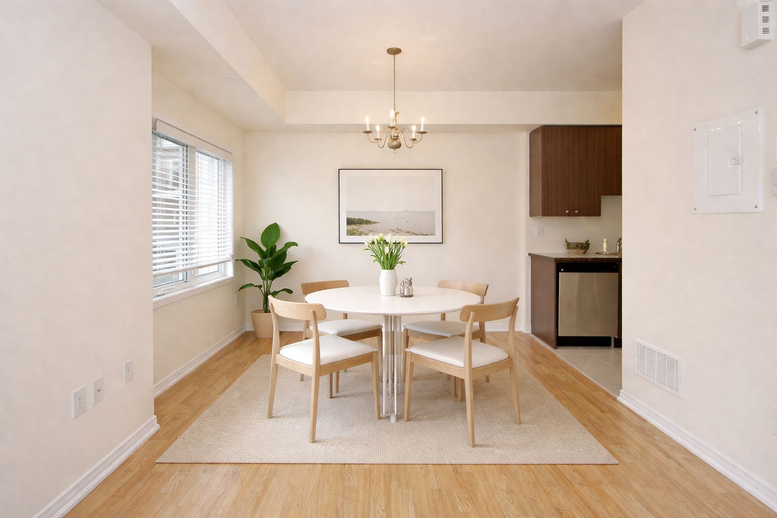 Bright and well-located townhome offering one of the best exposures in the complex, privately positioned and not facing the cemetery. This home features 906 sq ft of interior living space plus a spacious 244 sq ft rooftop terrace - perfect for outdoor relaxation and entertaining. Enjoy a functional 2-bedroom, 2-bathroom layout with 9-foot smooth ceilings and laminate flooring on the main level. The modern kitchen is equipped with granite countertops and stainless steel appliances. Includes underground parking and a storage locker. Residents enjoy access to an outdoor pool and ample visitor parking. Conveniently located close to parks, schools, community centre, and shopping. Easy transit access with one bus to the subway. Recently renovated featuring new interior doors and knobs, fresh professional paint, and professionally cleaned carpets. Please note some photos have been virtually staged.