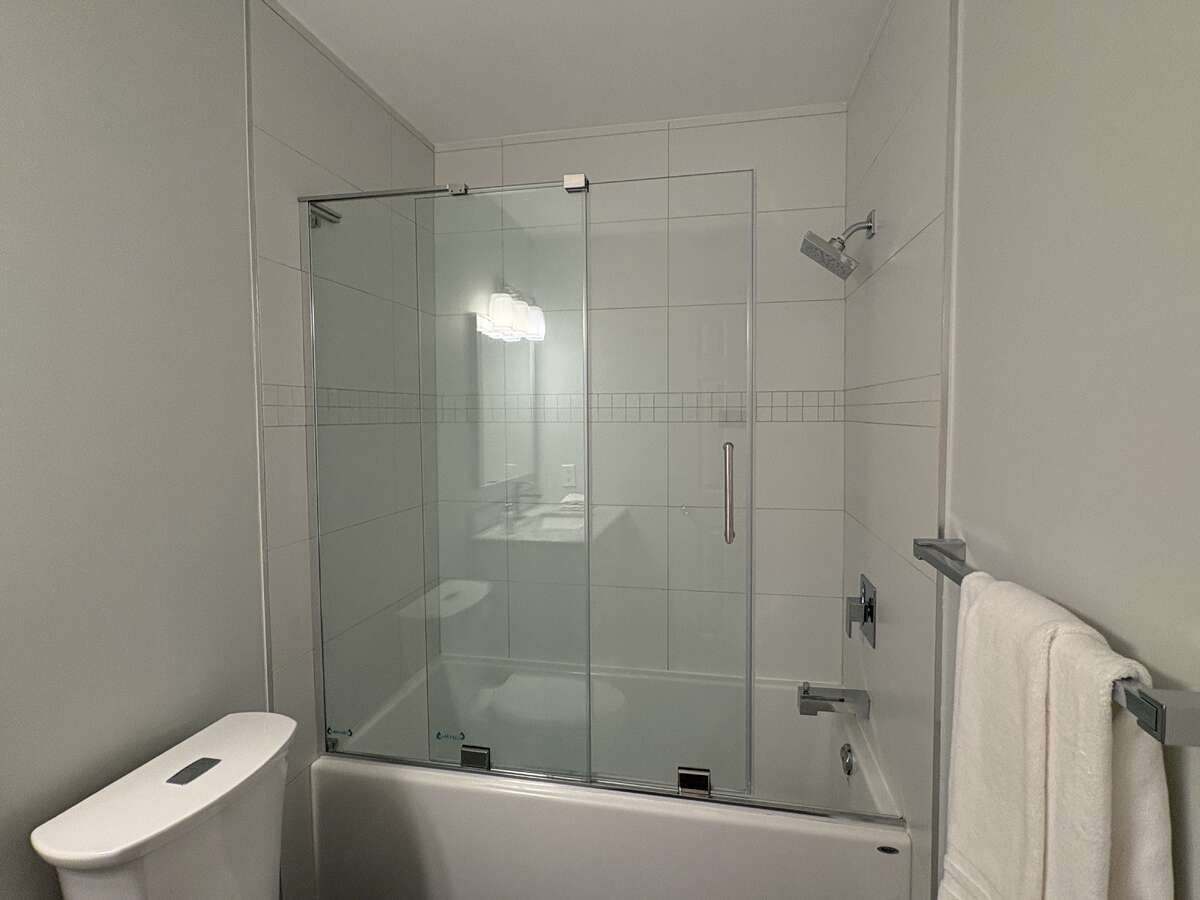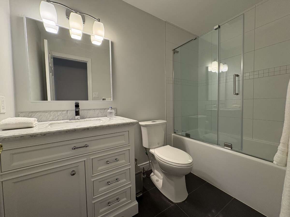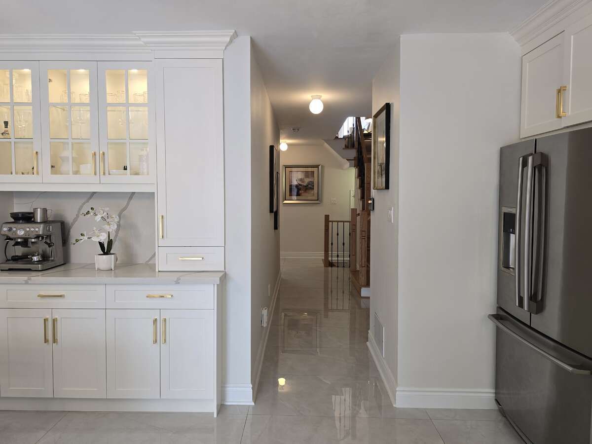• Modern kitchen with quartz countertops and ceramic tile flooring.