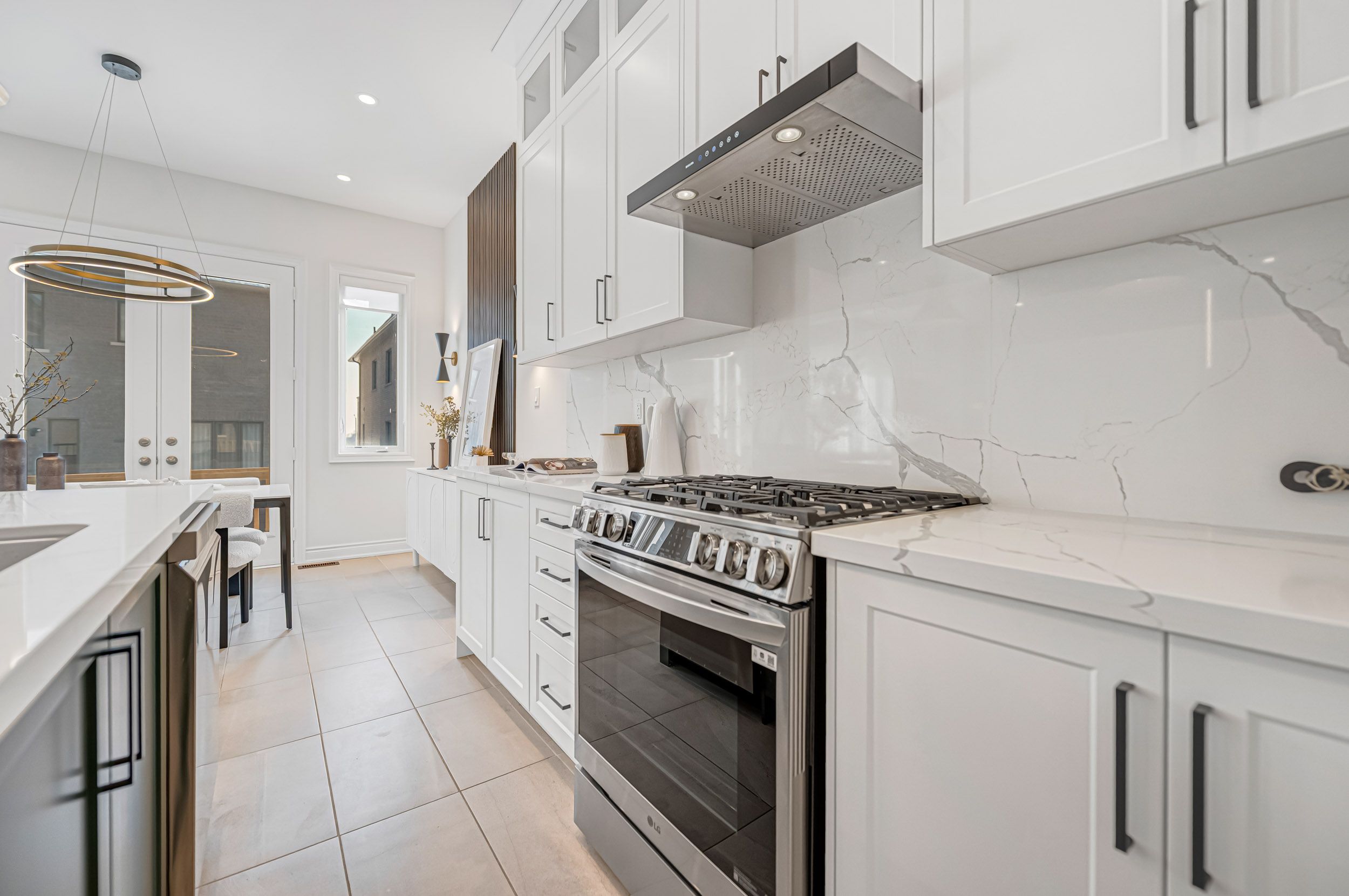 • Designer kitchen with custom cabinetry, quartz countertops, and modern appliances.