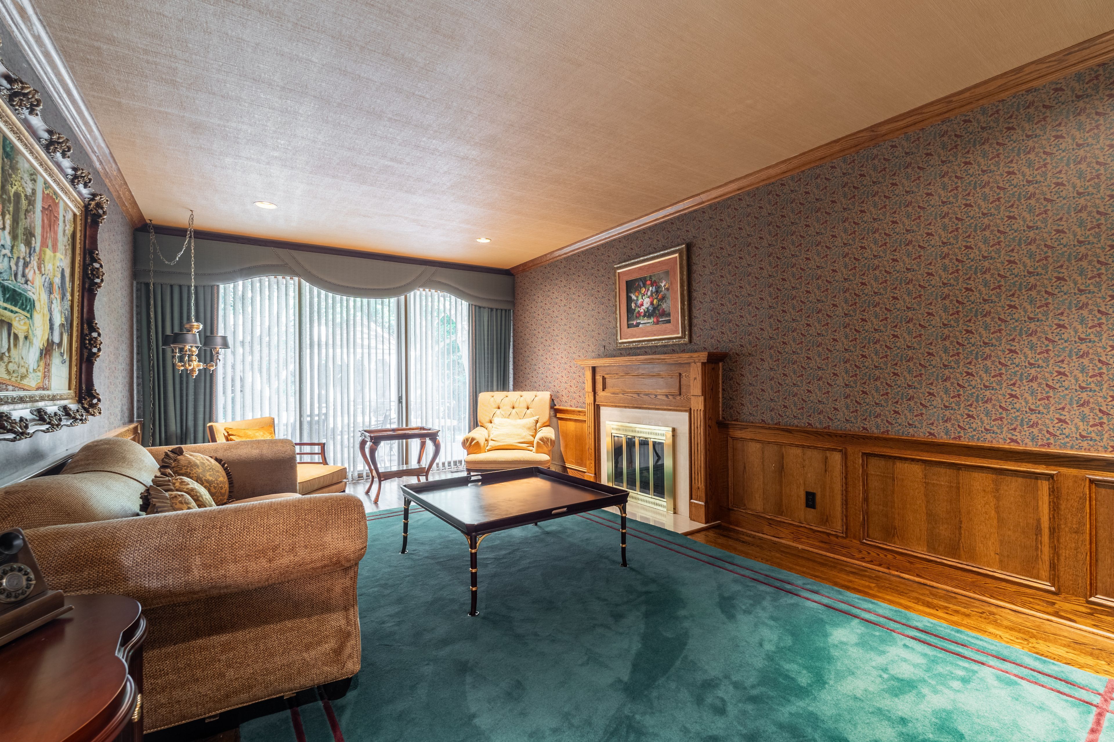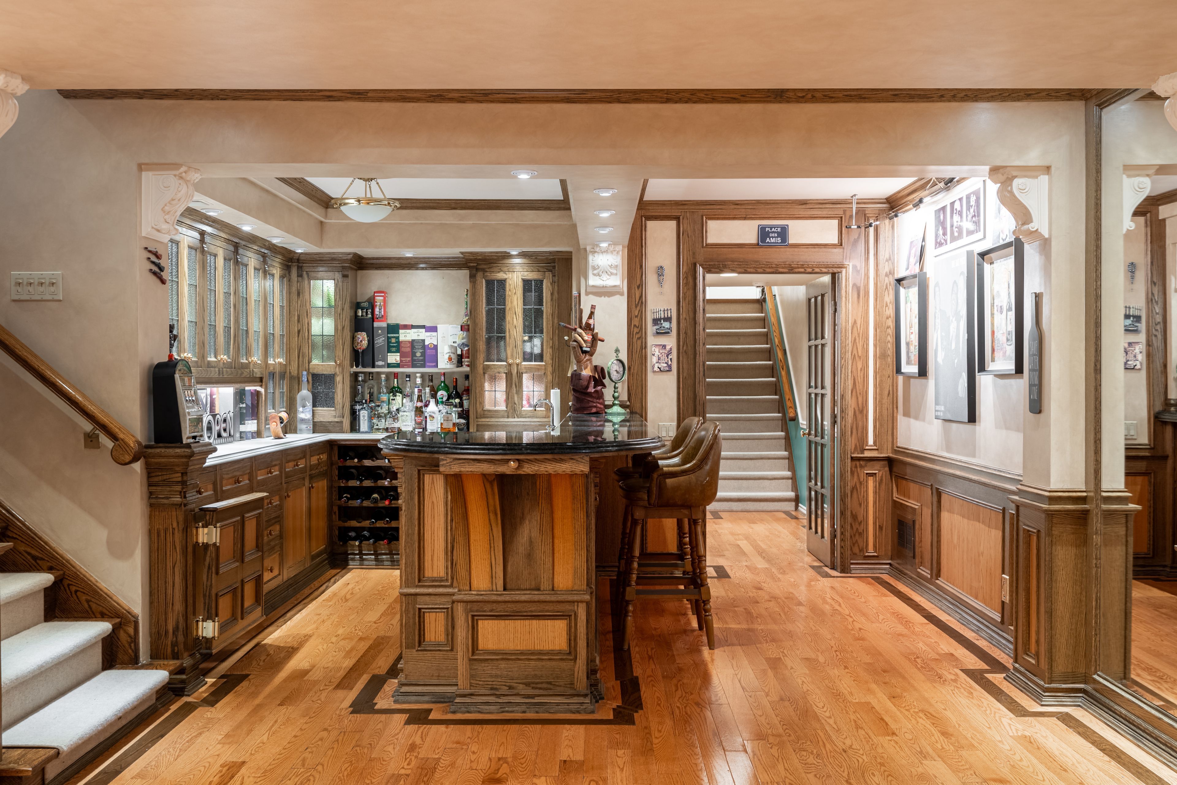 • Artistic finished basement featuring a fireplace and wet bar.
