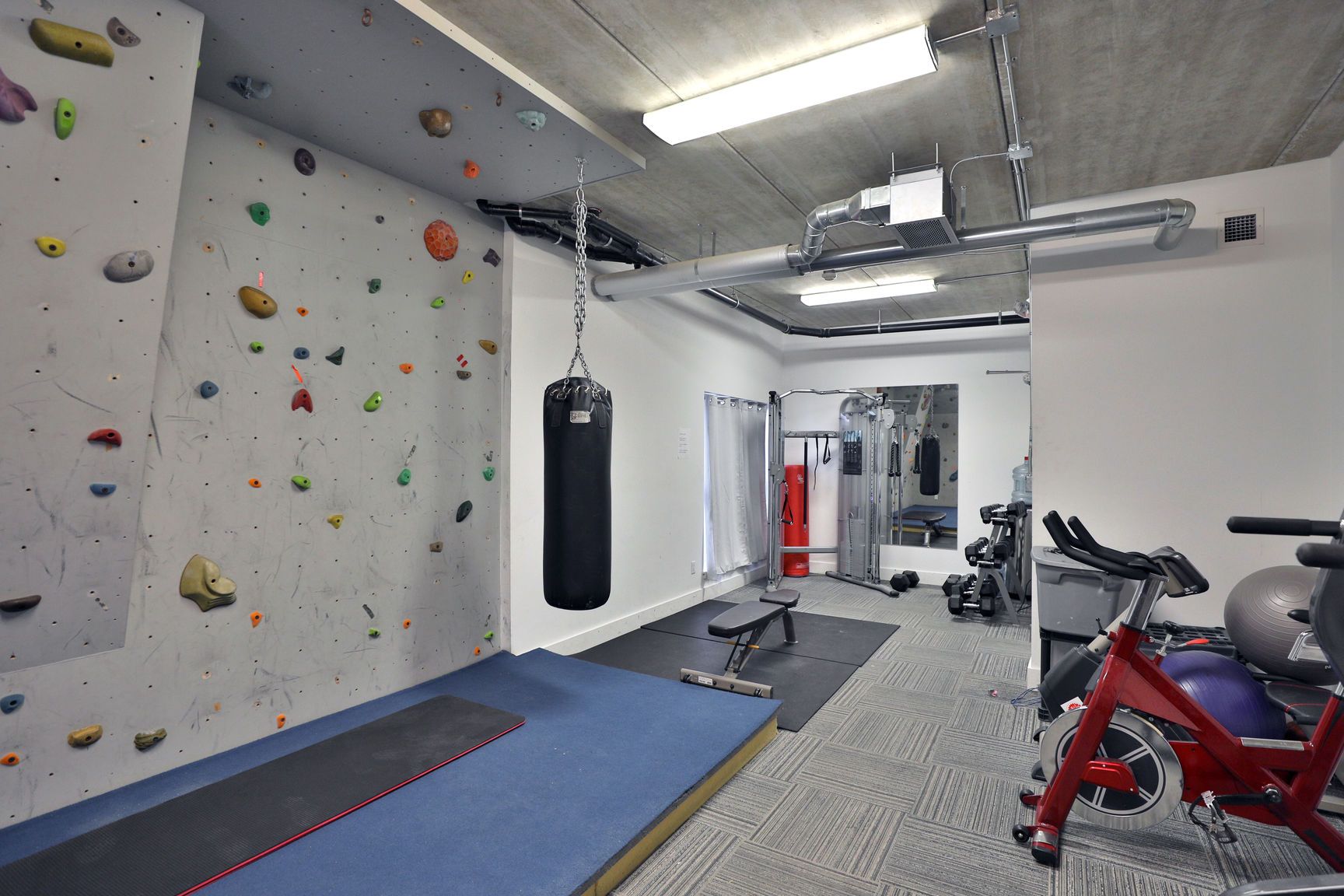 • Amenities include a gym, elevator, rock climbing wall, and BBQ area.