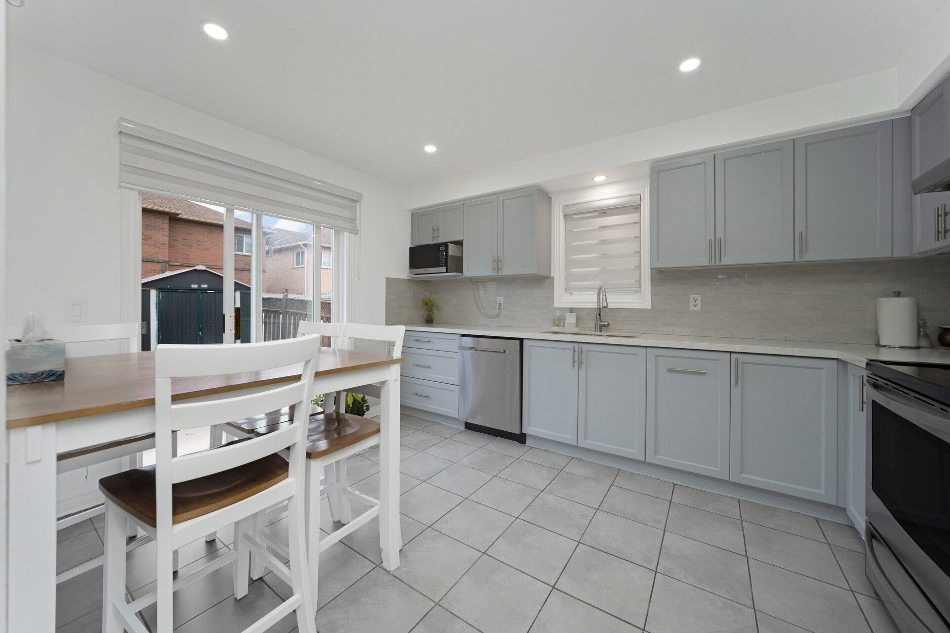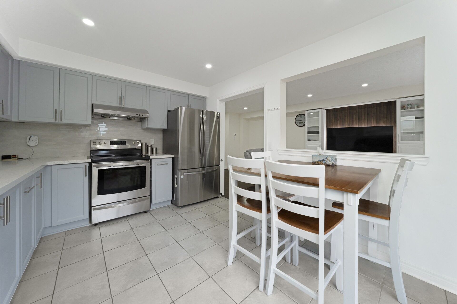 • Bright kitchen equipped with stainless steel appliances and quartz countertops.