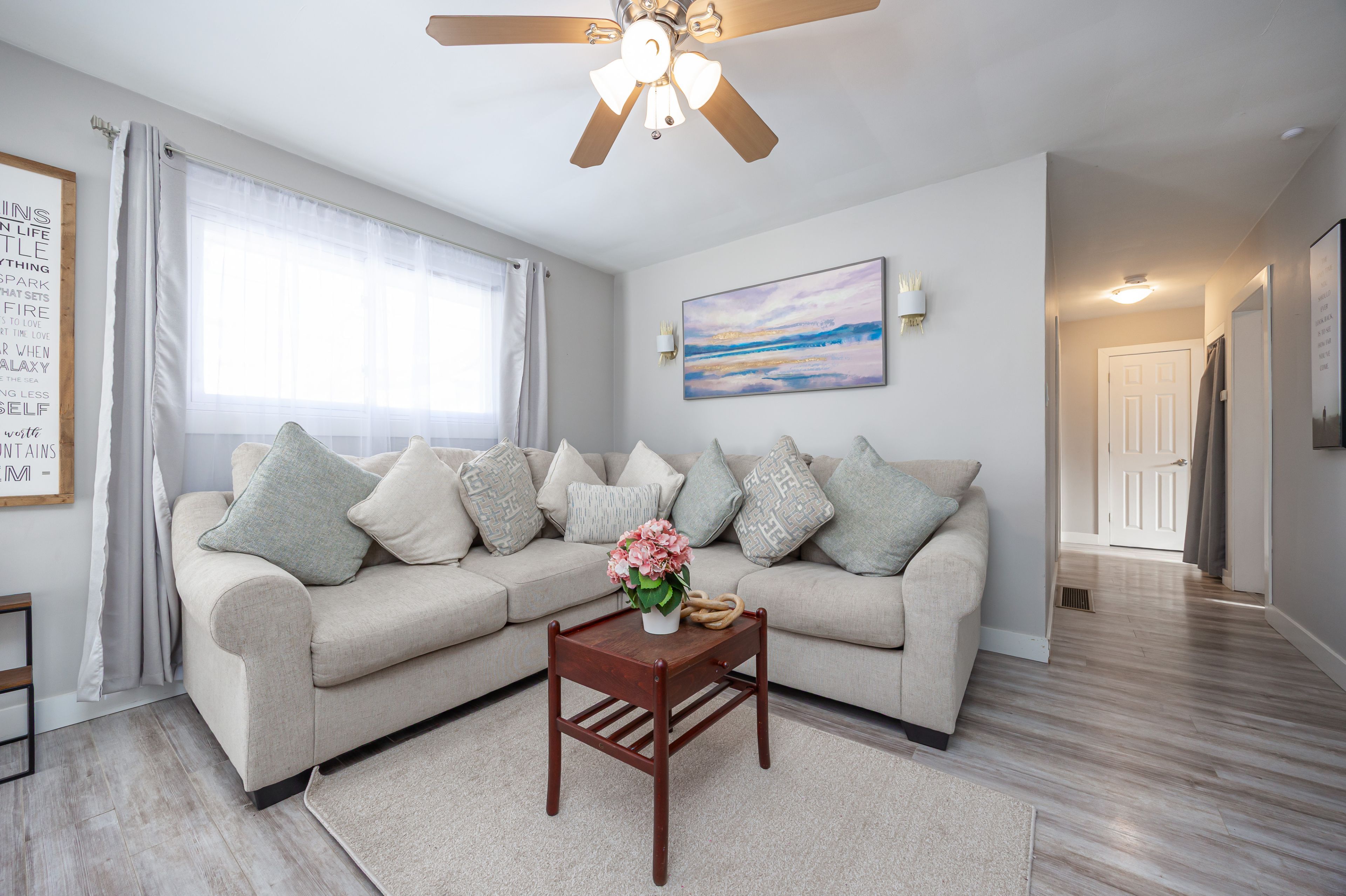 • Bright living room with large windows, filling the home with natural light.