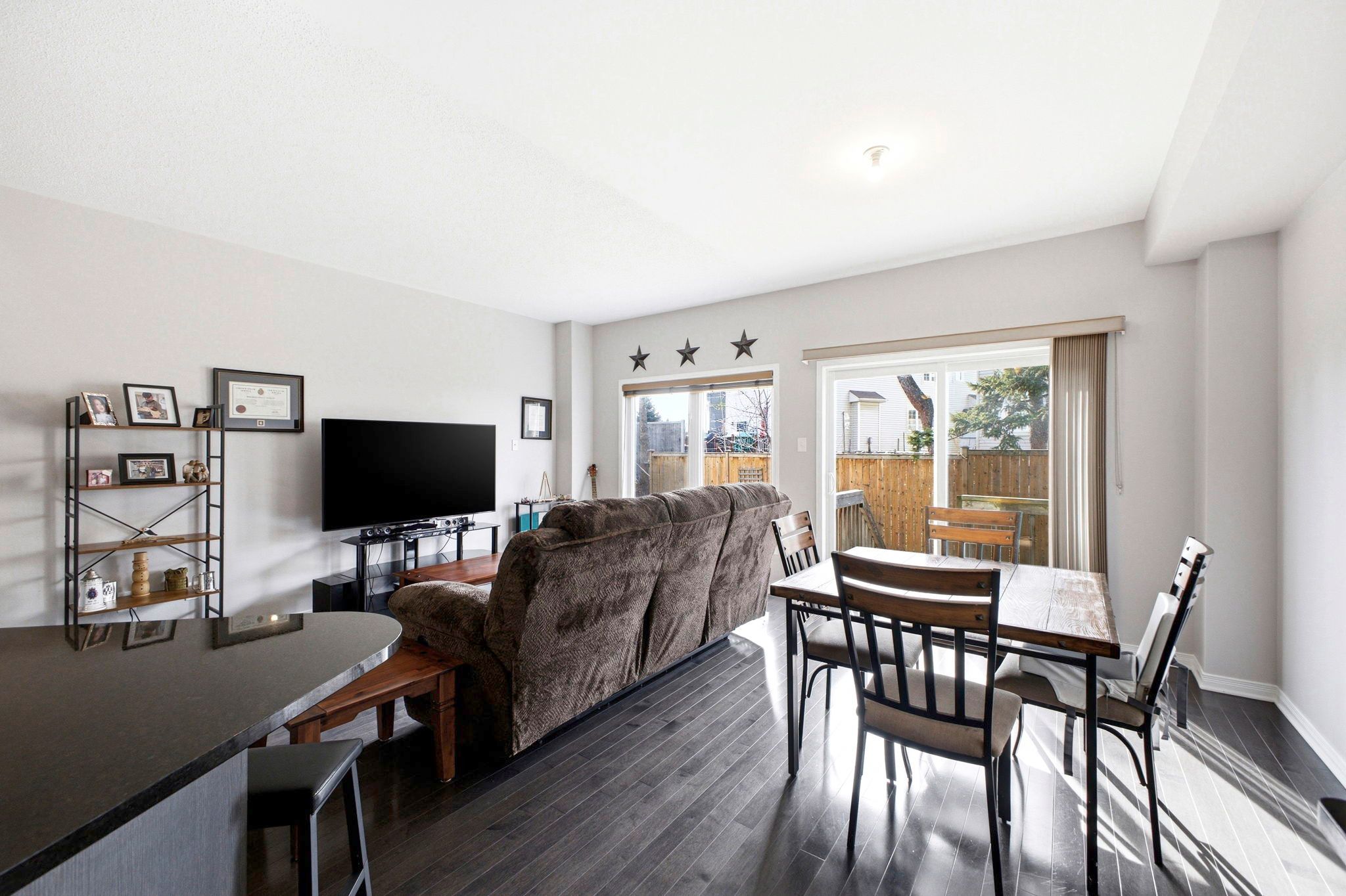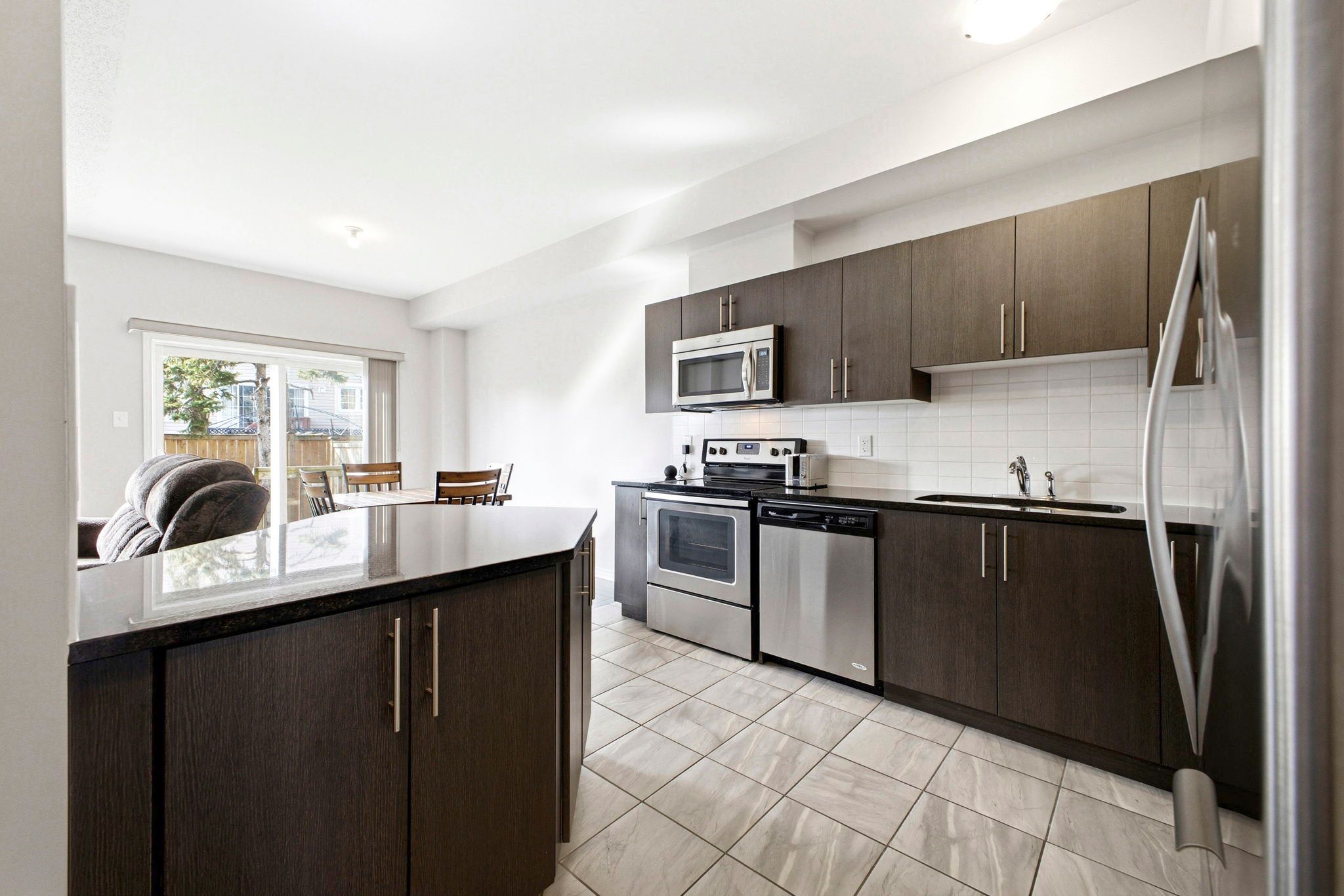 • Spacious open concept living area with modern kitchen and ample cabinetry.