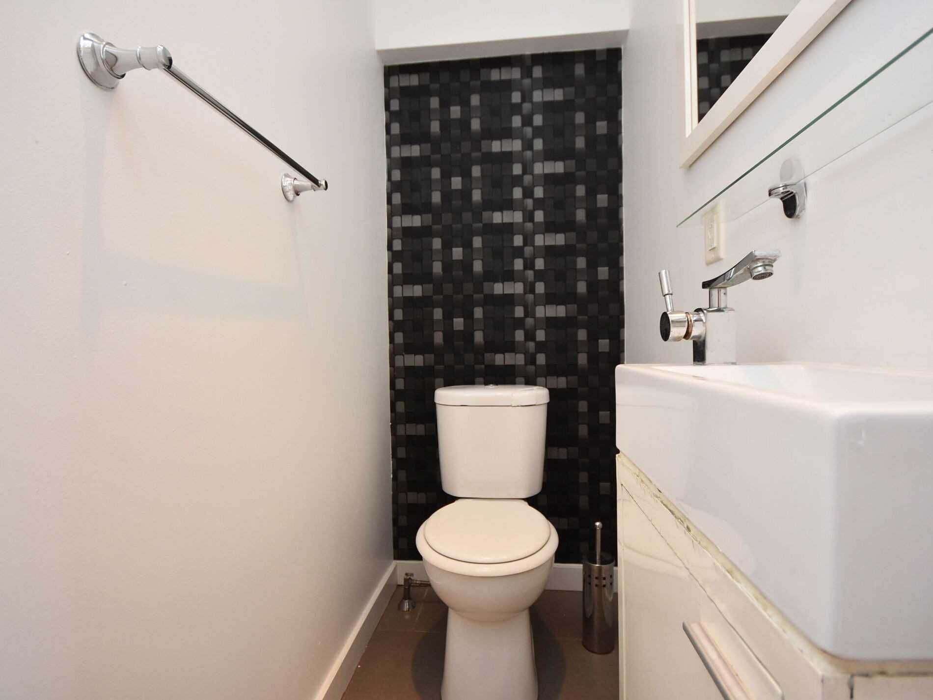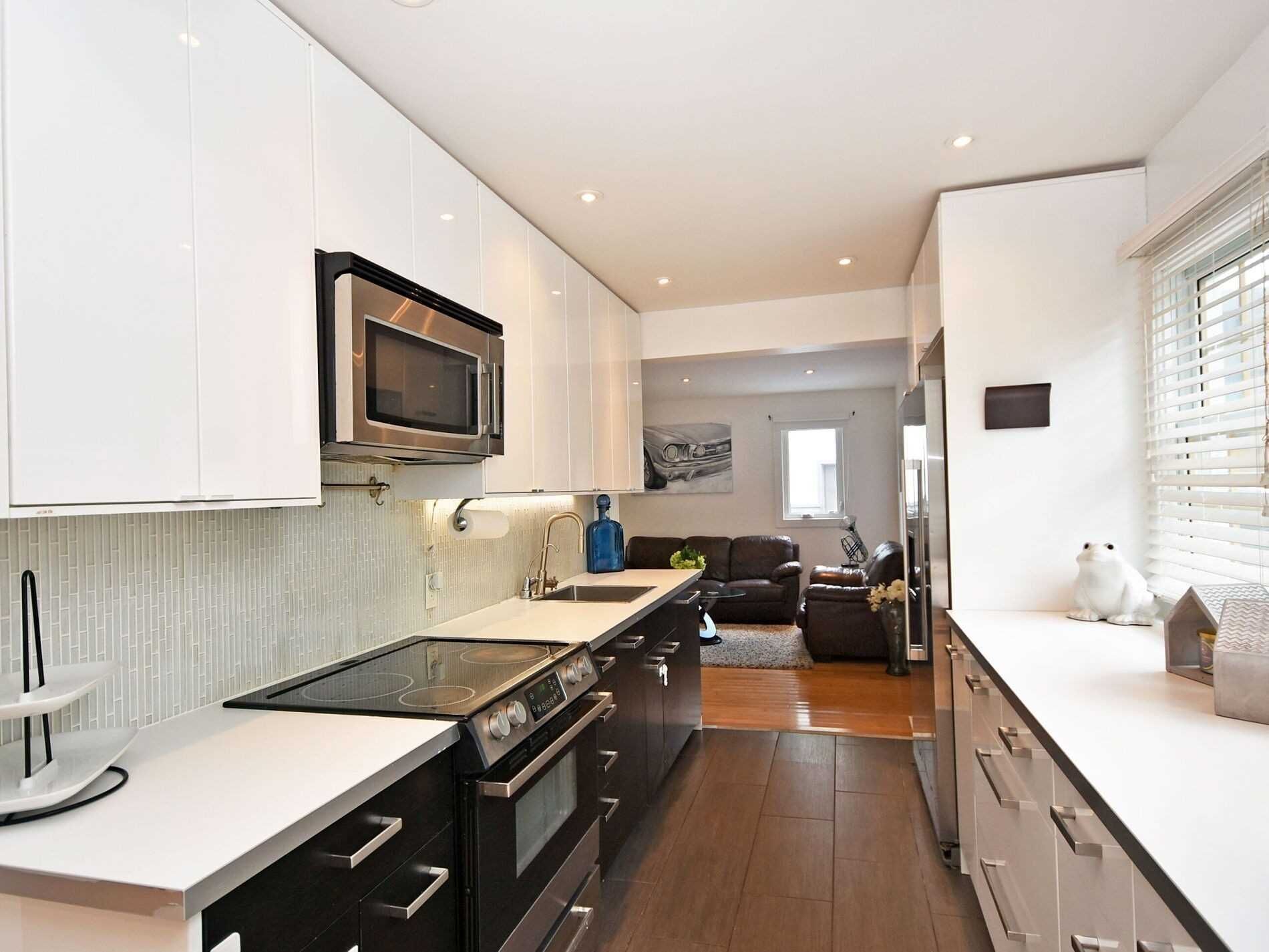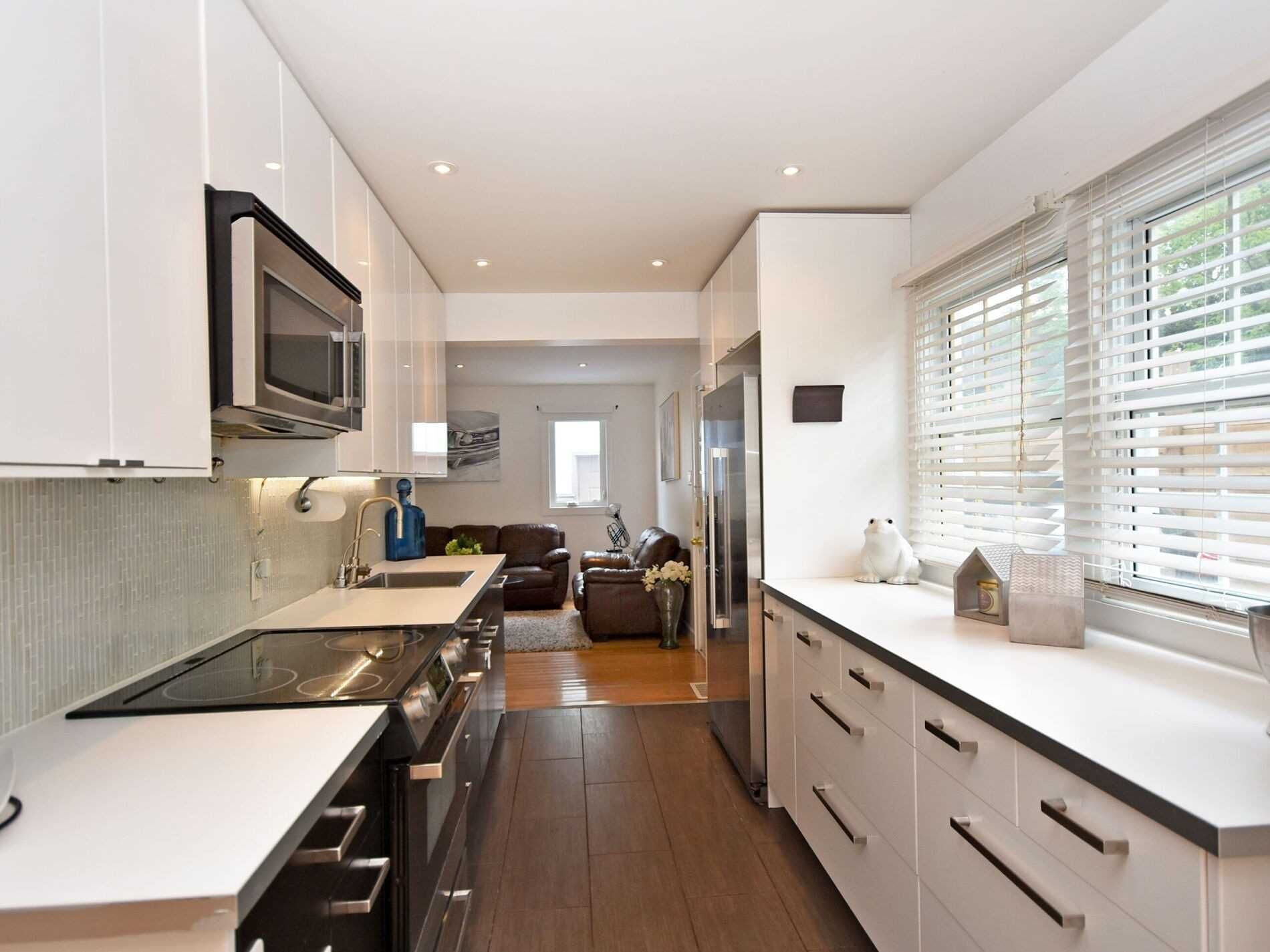 • Modern galley kitchen with stainless steel appliances.