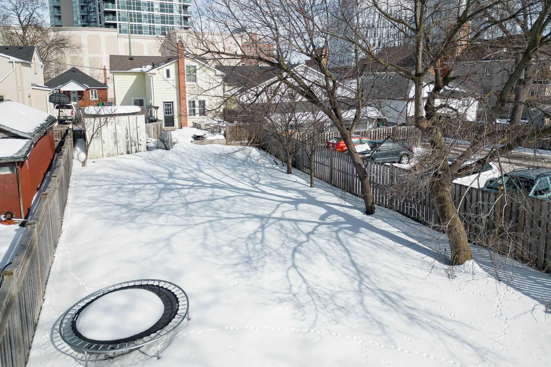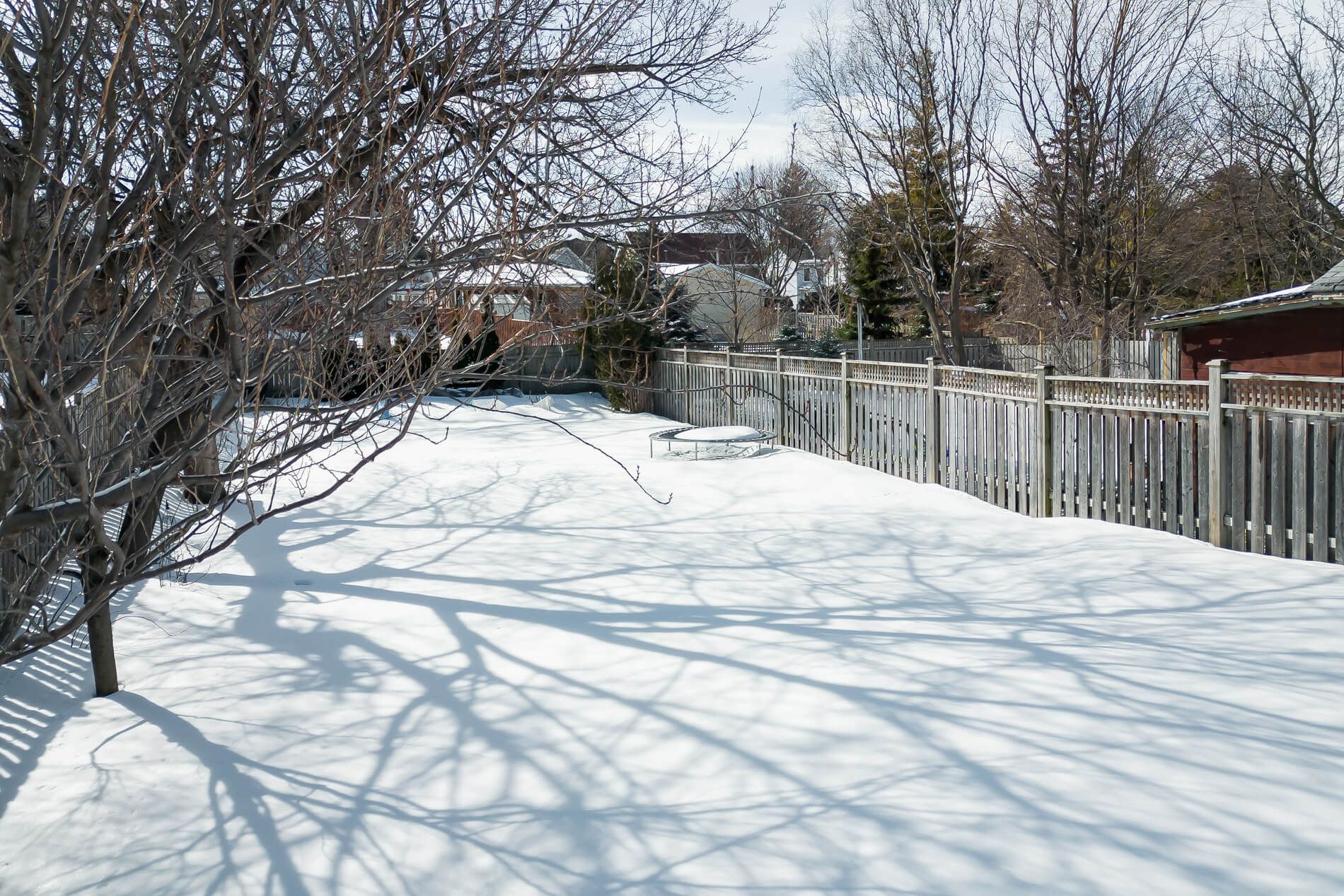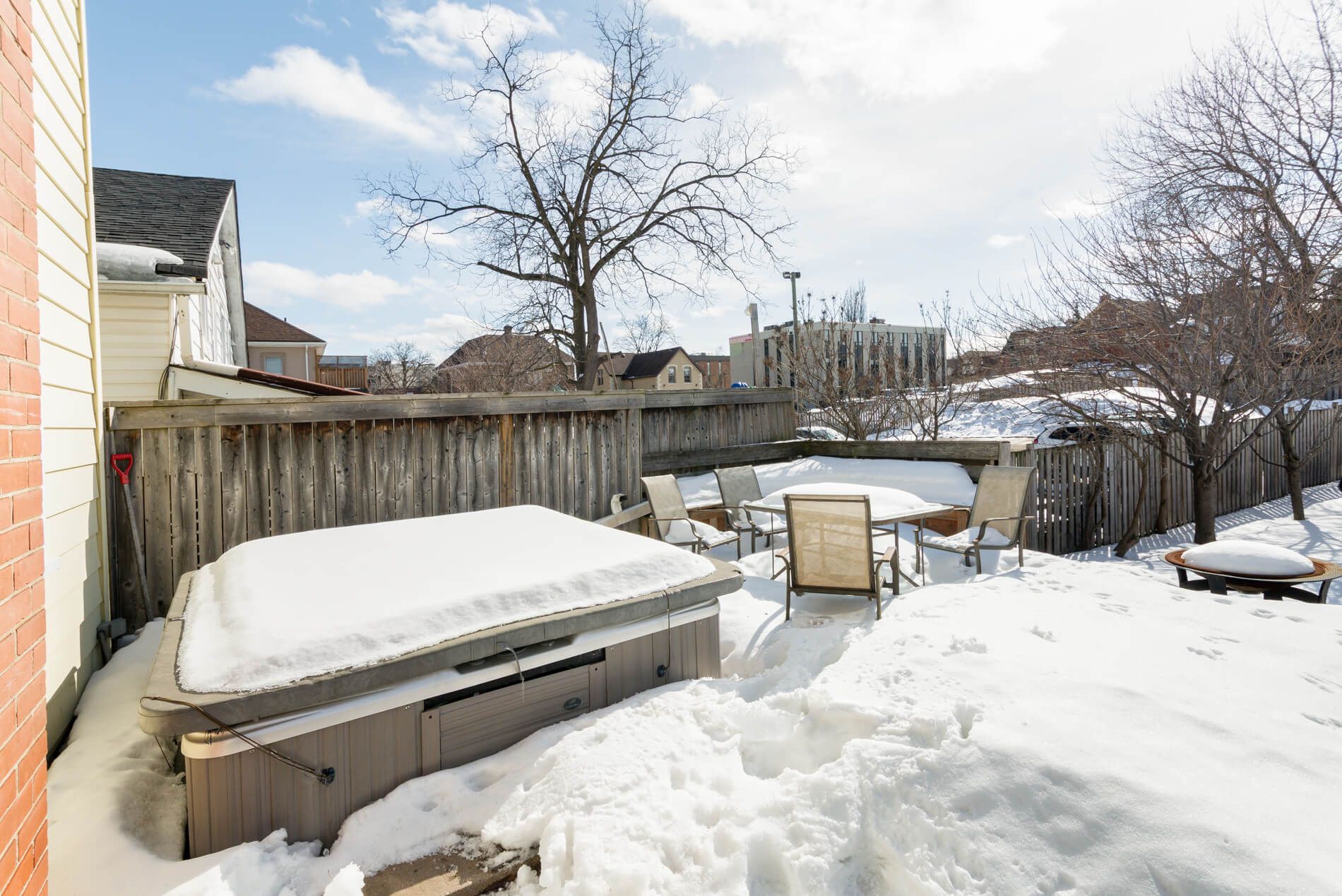 • Large deck with a hot tub overlooking a fenced pool-sized lot.