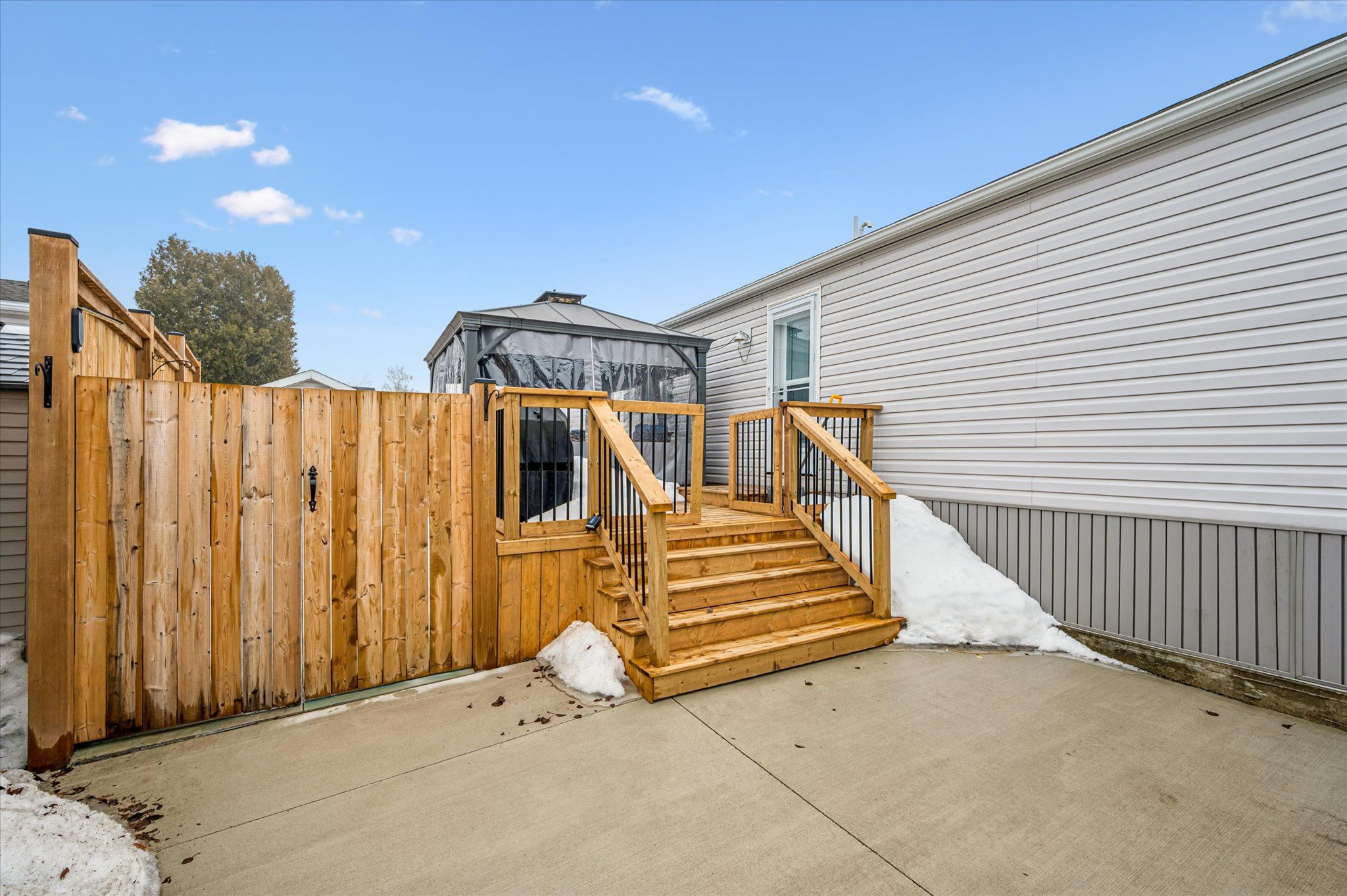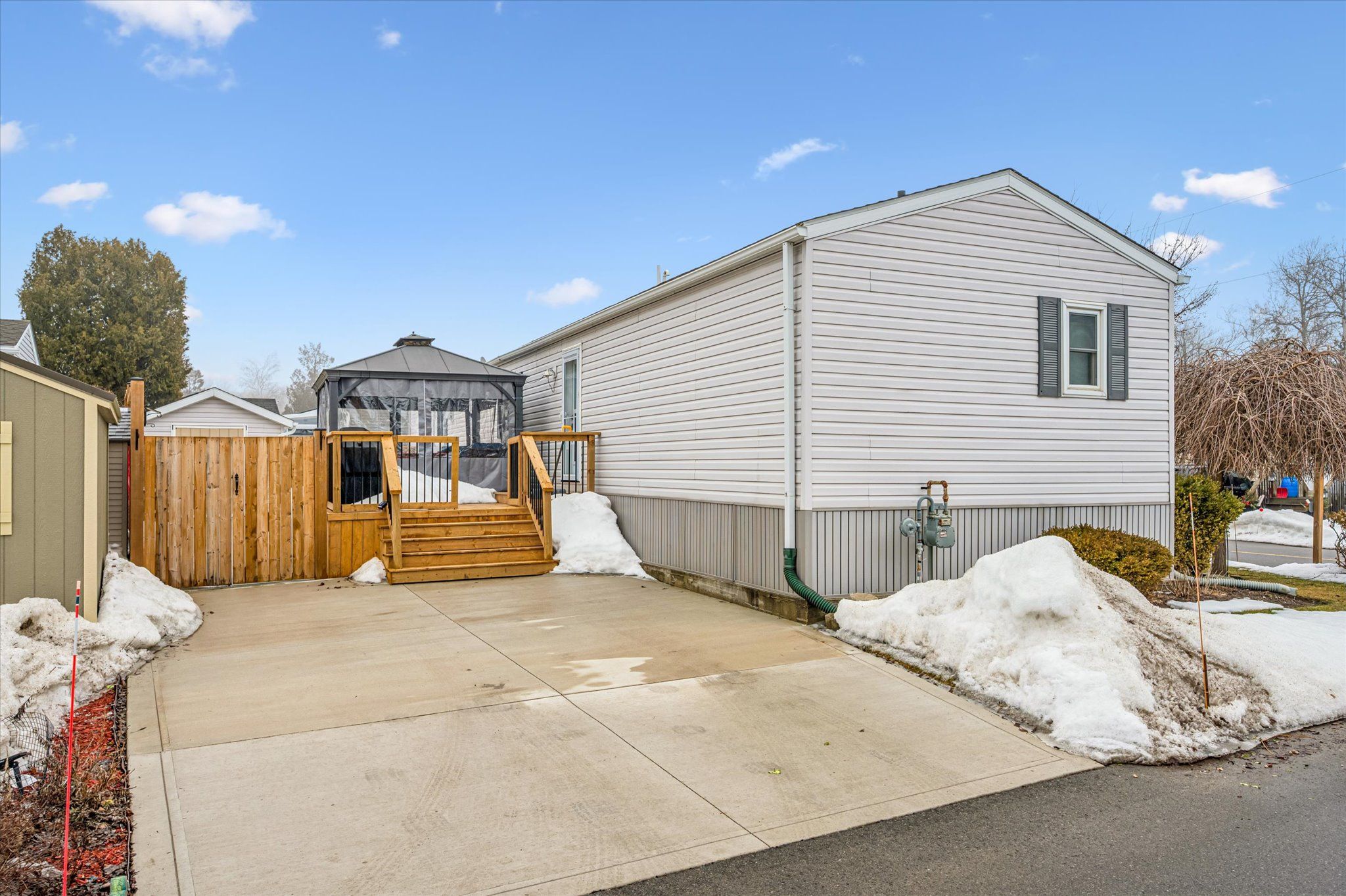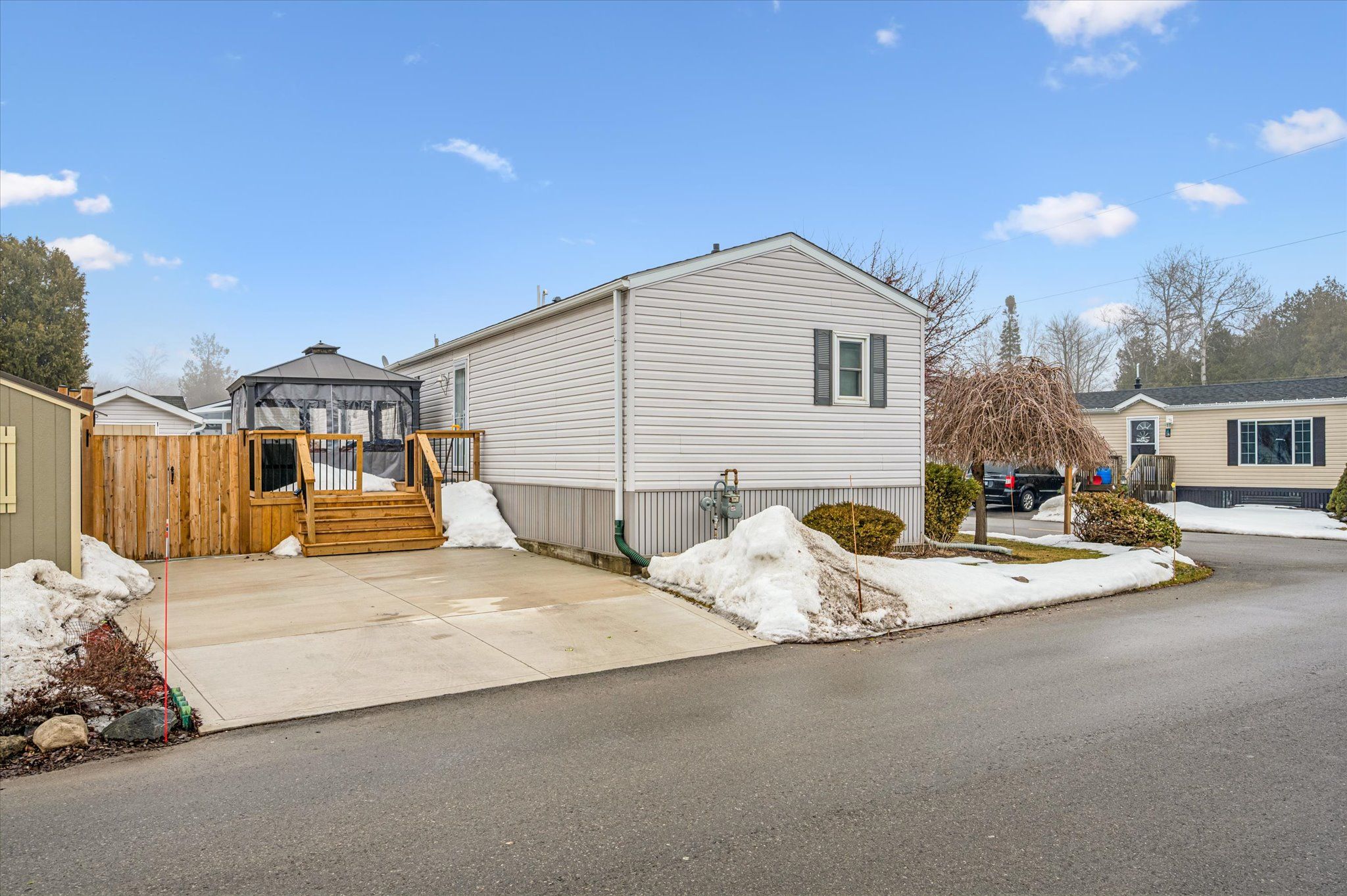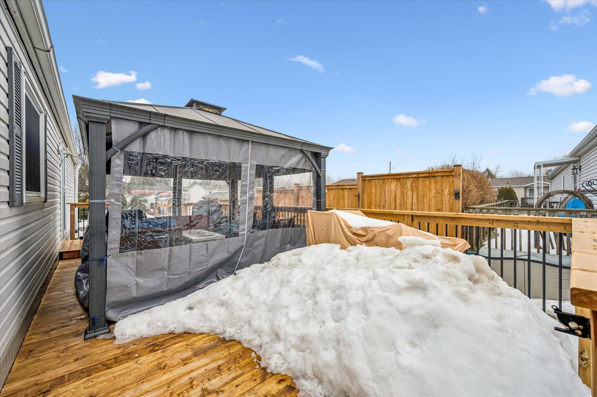 Welcome to this charming home in the sought-after mini lakes community, ideally situated on a desirable corner lot and just minutes from highway 401, making commuting easy. In mini lakes, you own the land, not lease it, offering added value and peace of mind. This well-maintained home offers 3 bedrooms, with numerous updates completed in recent years, including new skirting and apron around the house (2020), all new windows (2021), and new lvp flooring throughout (2021). Additional upgrades include a new freestanding gas fireplace (2022), new roof shingles (2023), a new concrete driveway and walkway (2024), a new fenced backyard (2024), and a beautifully updated kitchen featuring quartz countertops, an undermount sink, faucet, and tile backsplash (2024). The home also features new front and back doors (2025) and a new deck (2025). An insulated shed/workshop with hydro provides excellent space for hobbies, storage, or projects. Step outside to enjoy the outdoor patio with gazebo, extending your living space during the warmer months and creating a great area for relaxing or entertaining. The property also offers parking for up to 3 vehicles. All appliances, window coverings, and hanging and mounted light fixtures are included, along with the freestanding gas fireplace in the living room and the gazebo on the deck. A 2018 rxv golf cart with battery charger is also available and may be negotiated as part of the sale. Mini lakes residents enjoy a vibrant lifestyle with excellent amenities, including spring-fed lakes and canals, a heated outdoor pool, community gardens, and scenic walking trails. Residents can also take part in activities such as fishing, swimming, bocce, darts, and card nights, making it easy to stay active and connect with neighbours. Enjoy peaceful community living with convenient access to highway 401 and nearby amenities.