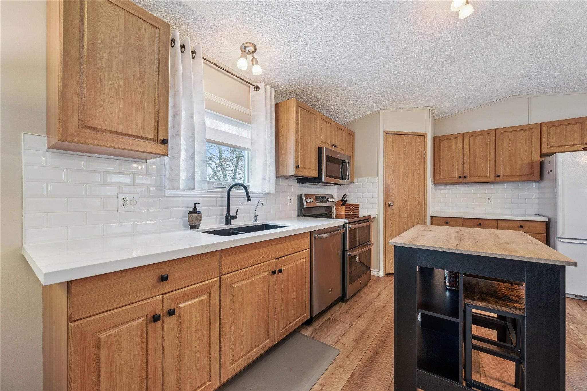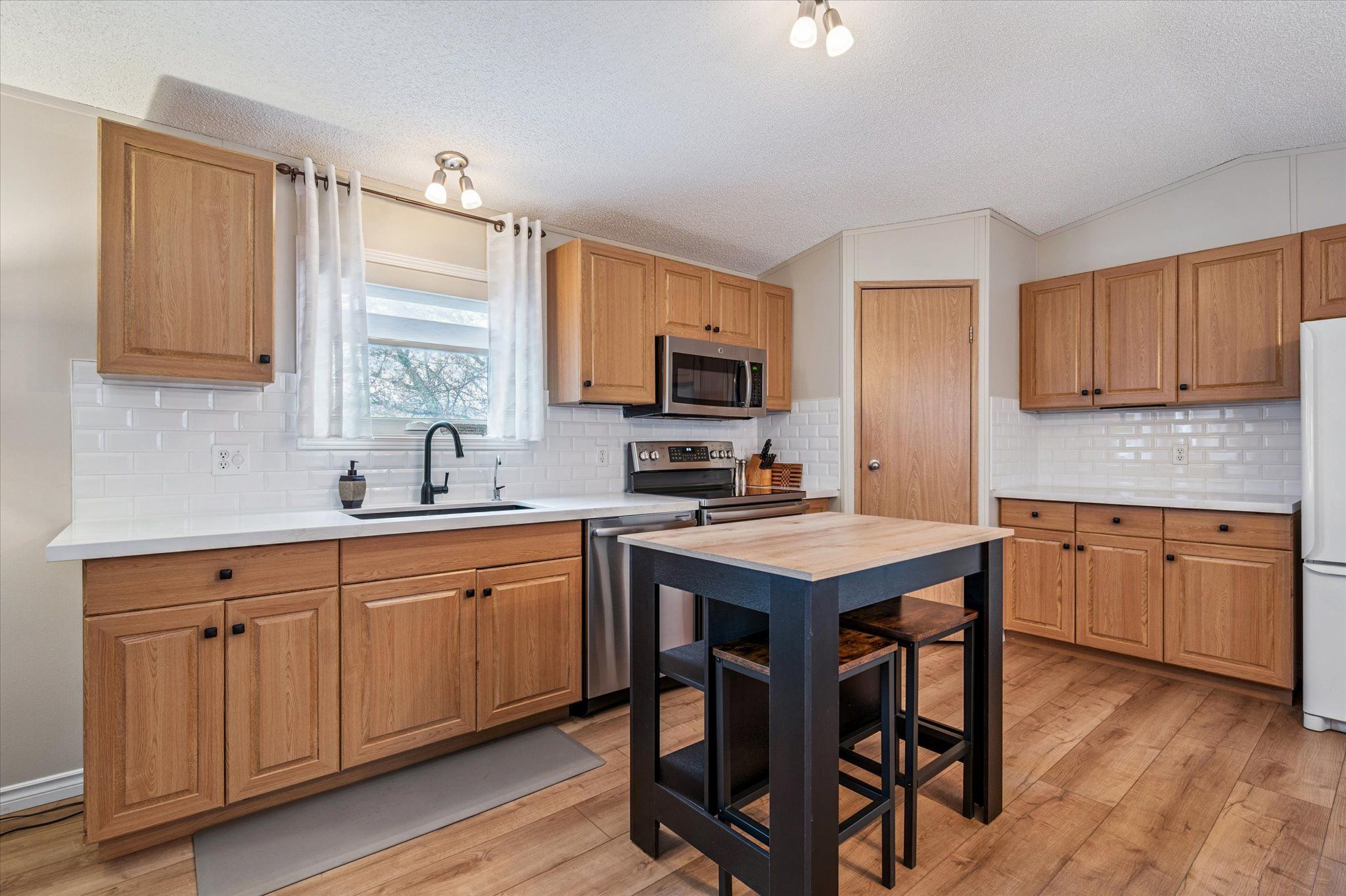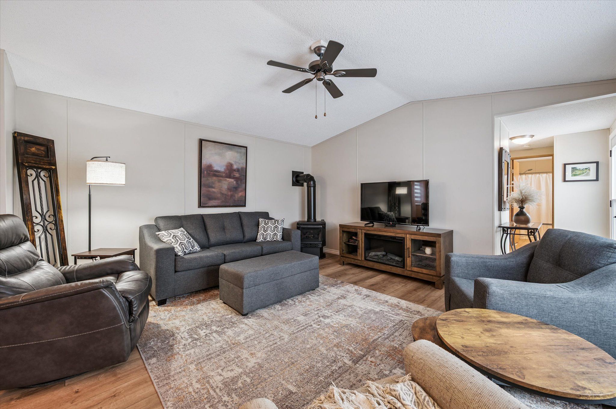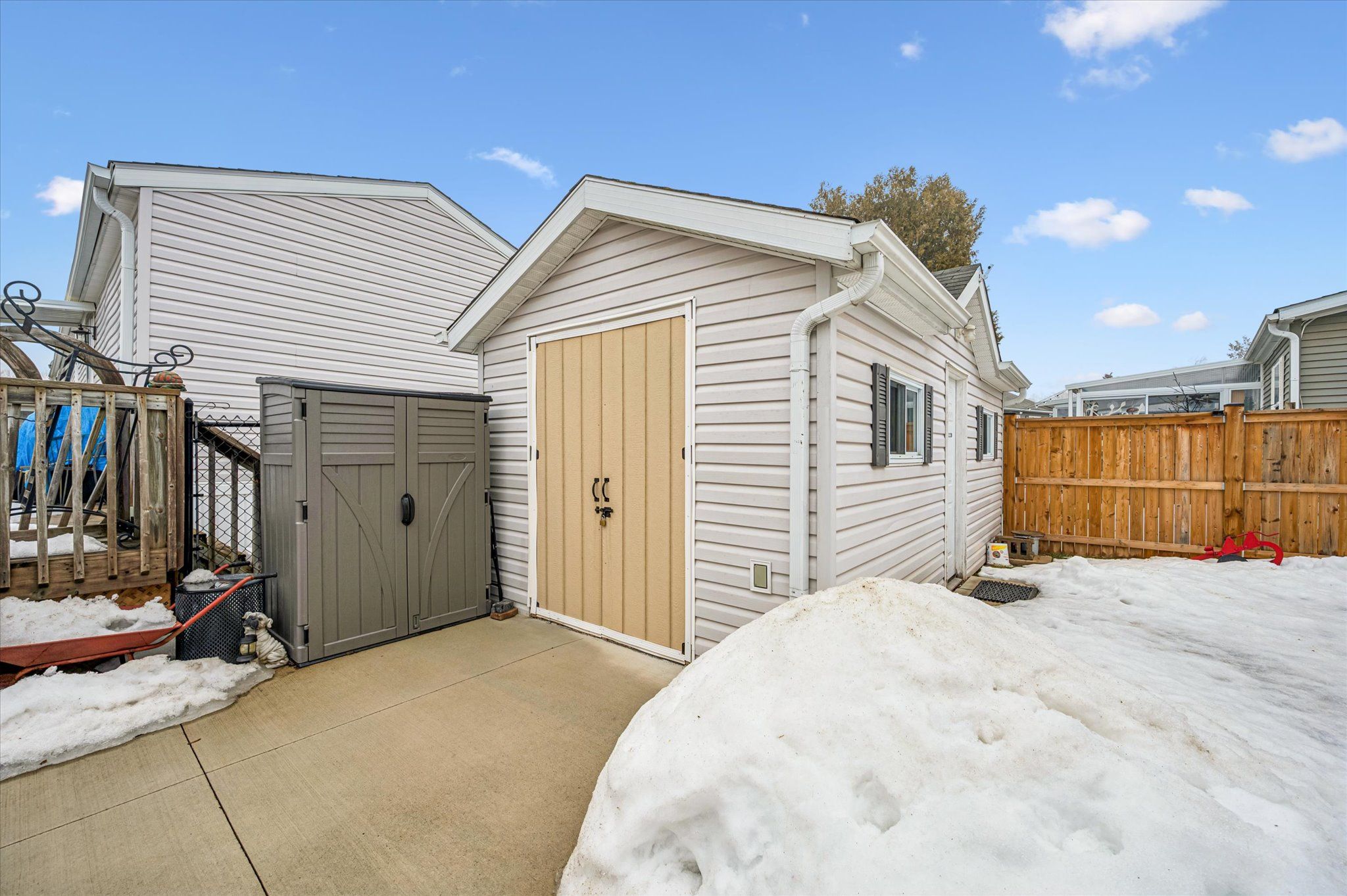 Welcome to this charming home in the sought-after mini lakes community, ideally situated on a desirable corner lot and just minutes from highway 401, making commuting easy. In mini lakes, you own the land, not lease it, offering added value and peace of mind. This well-maintained home offers 3 bedrooms, with numerous updates completed in recent years, including new skirting and apron around the house (2020), all new windows (2021), and new lvp flooring throughout (2021). Additional upgrades include a new freestanding gas fireplace (2022), new roof shingles (2023), a new concrete driveway and walkway (2024), a new fenced backyard (2024), and a beautifully updated kitchen featuring quartz countertops, an undermount sink, faucet, and tile backsplash (2024). The home also features new front and back doors (2025) and a new deck (2025). An insulated shed/workshop with hydro provides excellent space for hobbies, storage, or projects. Step outside to enjoy the outdoor patio with gazebo, extending your living space during the warmer months and creating a great area for relaxing or entertaining. The property also offers parking for up to 3 vehicles. All appliances, window coverings, and hanging and mounted light fixtures are included, along with the freestanding gas fireplace in the living room and the gazebo on the deck. A 2018 rxv golf cart with battery charger is also available and may be negotiated as part of the sale. Mini lakes residents enjoy a vibrant lifestyle with excellent amenities, including spring-fed lakes and canals, a heated outdoor pool, community gardens, and scenic walking trails. Residents can also take part in activities such as fishing, swimming, bocce, darts, and card nights, making it easy to stay active and connect with neighbours. Enjoy peaceful community living with convenient access to highway 401 and nearby amenities.