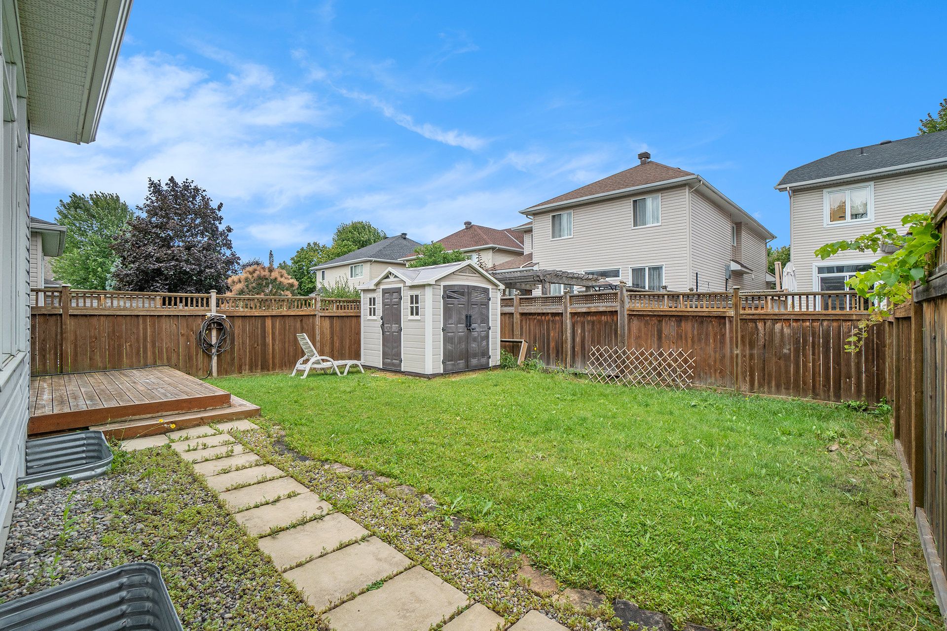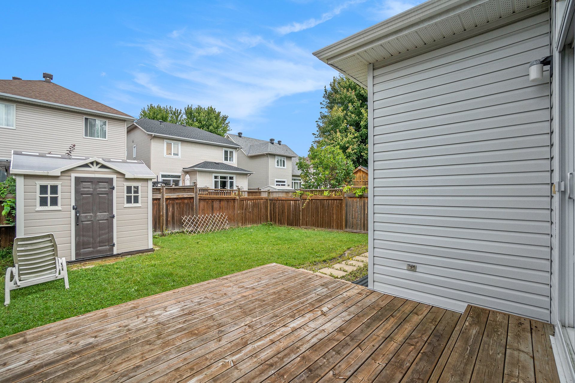 • Fenced backyard with wooden deck and storage shed for outdoor enjoyment.