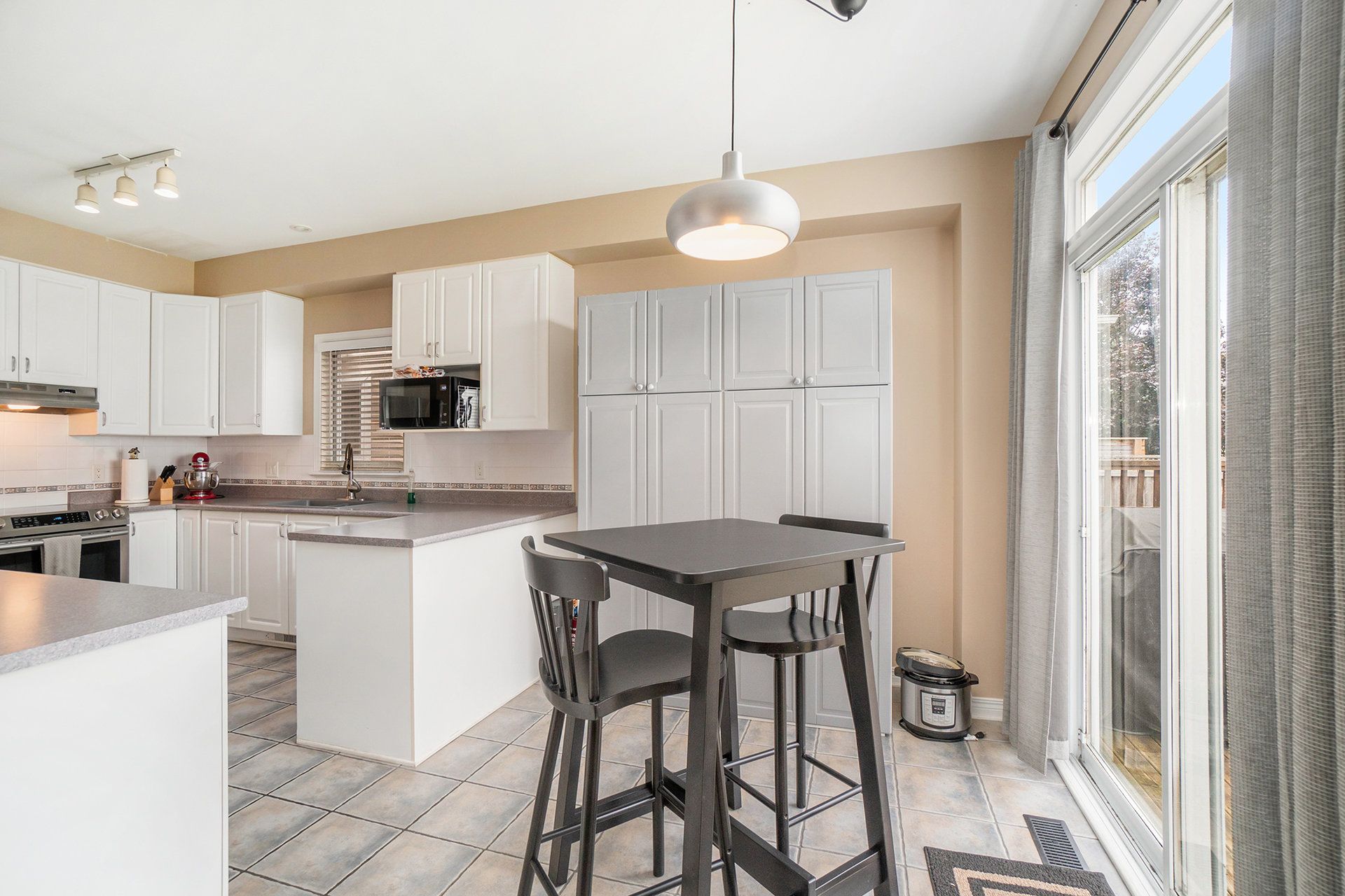 • Modern kitchen with stainless steel appliances and centre island for seating.