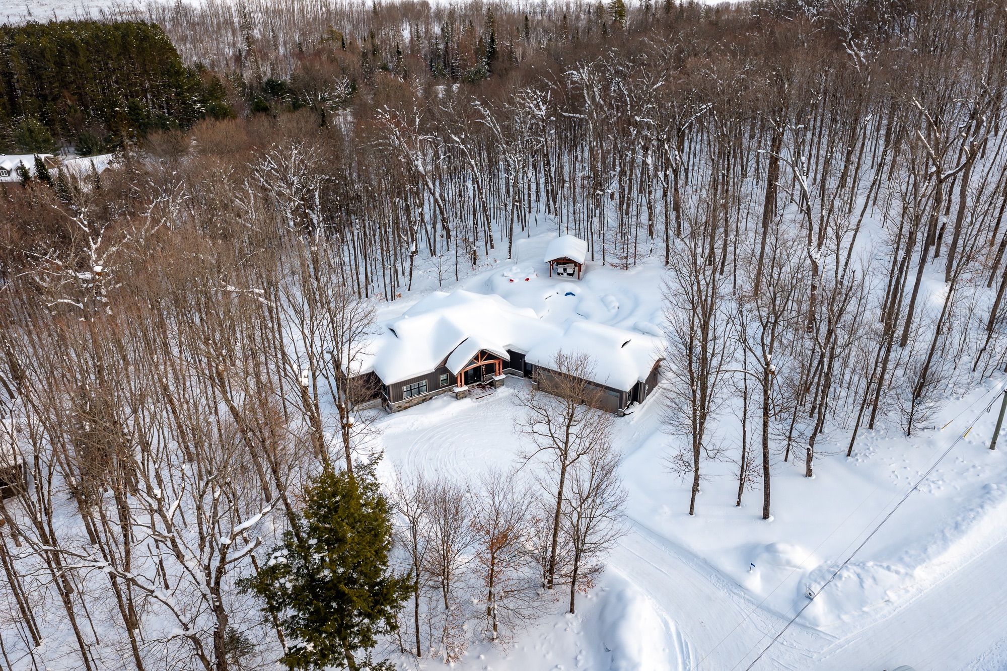 Welcome to this remarkable property, tucked away on a private, year-round road. It spans almost 4 acres across both sides of the road, offering space, privacy, & convenience just minutes from town. The outdoor setting is spectacular & designed for both relaxation & entertaining. Professional landscaping surrounds an inground pool with a cascading stone waterfall. A hot tub area & covered lounge invite endless summer enjoyment. Expansive decking overlooks, creating the perfect backdrop for lively gatherings, quiet afternoons in the sun, or evenings under the stars. Here is a property where lasting memories are made outdoors as much as in. Stepping inside, the home continues to impress with a sprawling executive bungalow layout crafted for comfort & style. A spacious foyer welcomes you to the bright living room. A wall of windows frames the outdoors, while a striking stone fireplace adds warmth & charm. The chefs kitchen is a showpiece. It offers high-end appliances, abundant storage, a large island, & beverage fridge. From the dining area, walk out to the expansive deck & extend your living space into the outdoor paradise. The main floor is anchored by a generous primary suite with direct deck access, a walk-in closet, & a luxurious 4-pc ensuite with glass shower & double sinks. A guest bedroom & 4-pc bath provide comfort for visitors. A large mudroom & laundry area, with inside entry to the oversized double garage, adds everyday convenience. Descend the curved staircase to the fully finished walkout lower level, where a massive rec room with an electric fireplace creates the ultimate gathering place. This level also offers 3 guest bedrooms, a 3-pc bath, a cozy office, & a bonus room currently used as a gym. A spacious utility/storage room completes the design, ensuring both function & flexibility. This exceptional property blends refined living with an incredible outdoor oasis, offering the perfect balance of privacy, luxury & convenience.
