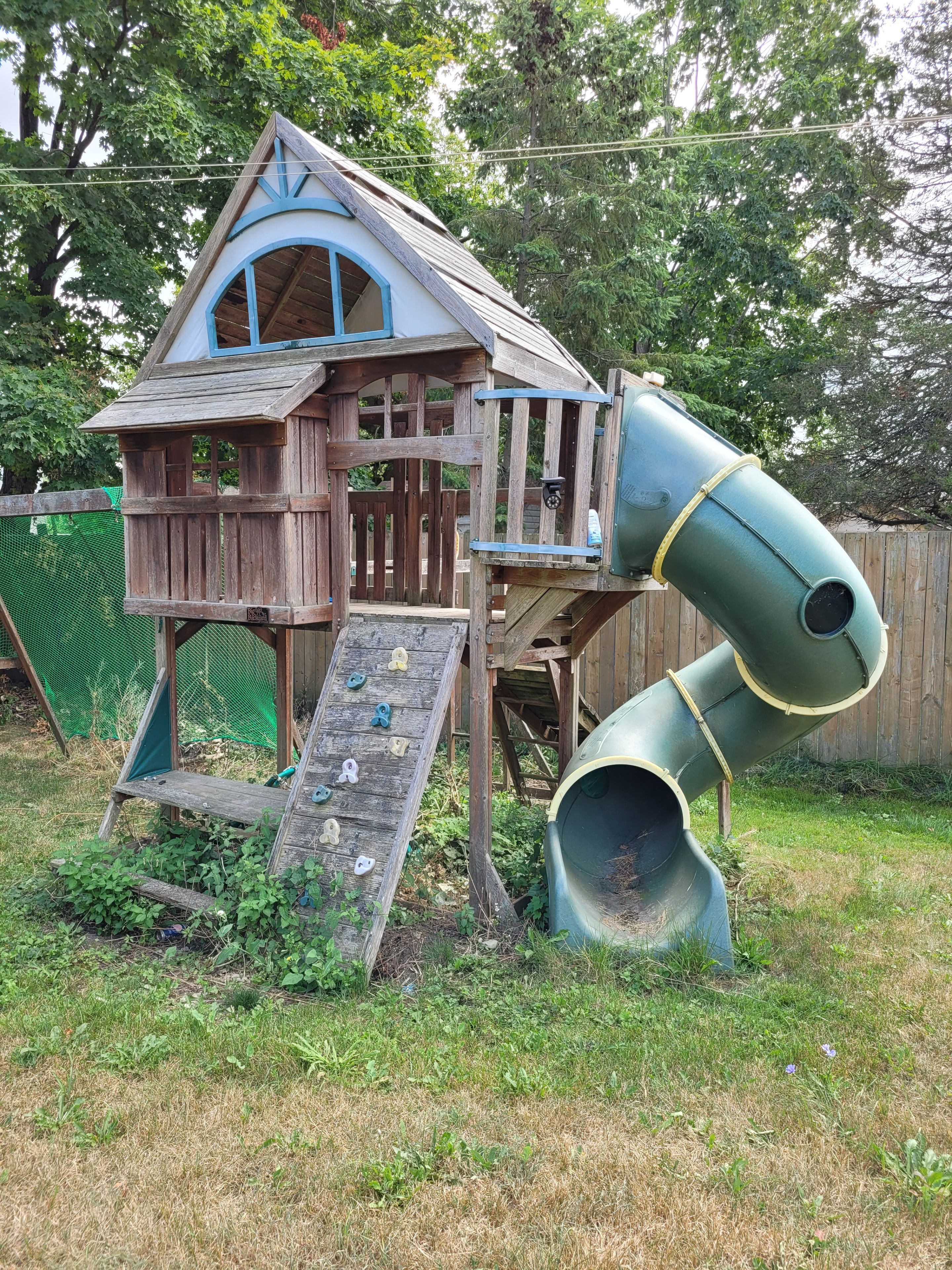 • Large backyard featuring a swimming pool and deck for outdoor fun.