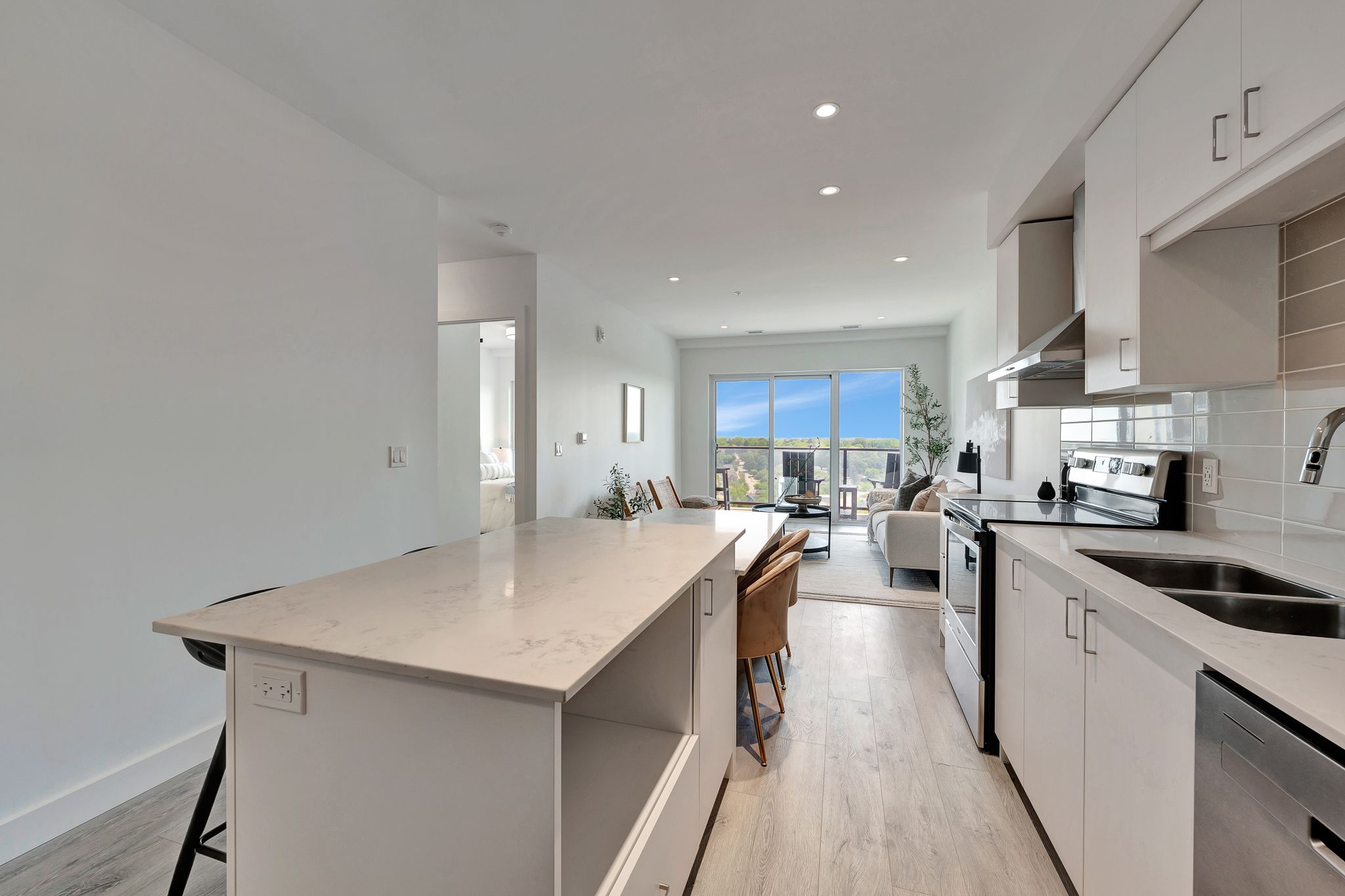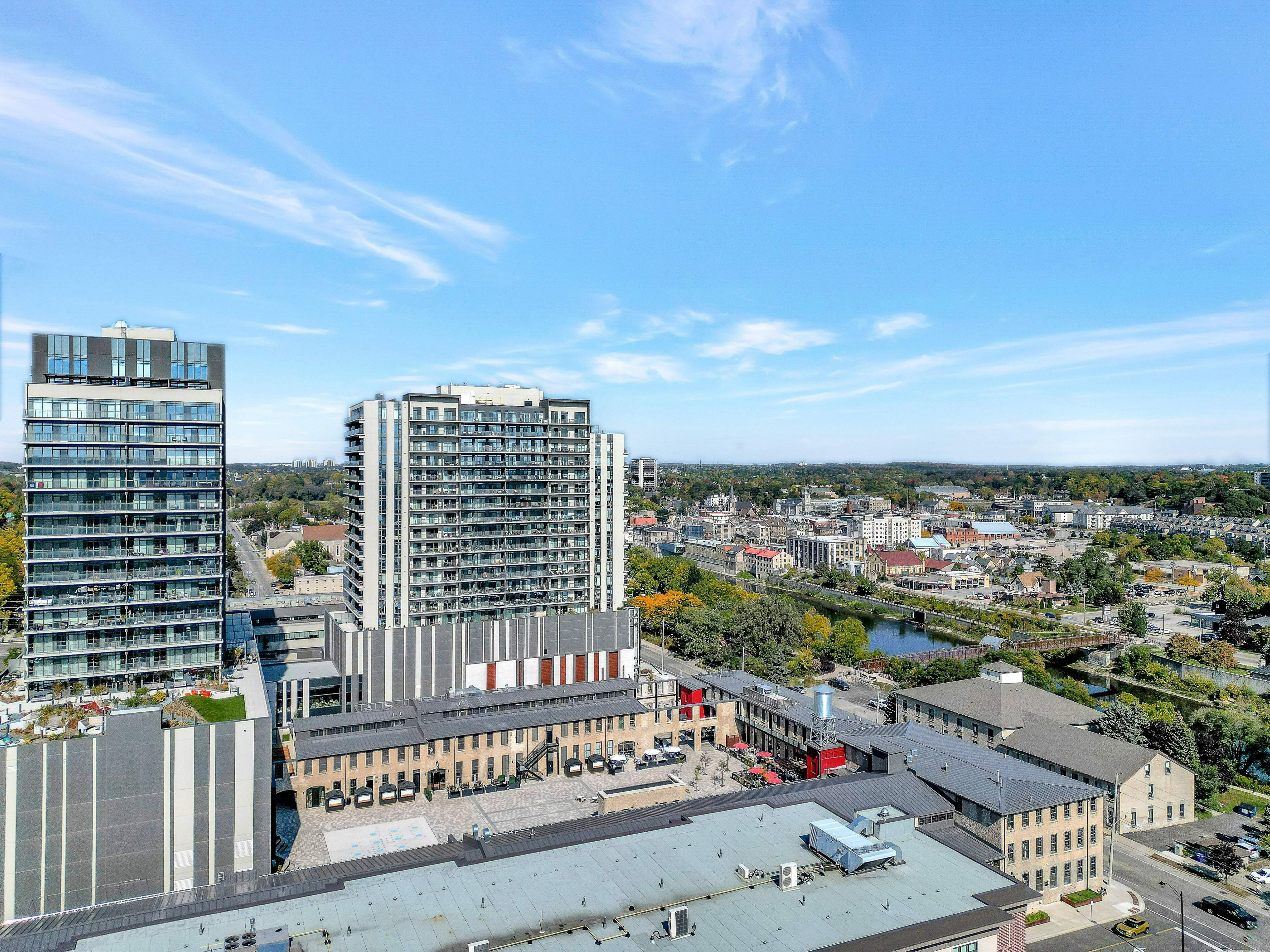 Modern and refined, this 2-bedroom, 2-bathroom condo offers 1,007 sq ft of well-designed living space in cambridge's highly sought-after gaslight district-the city's premier hub for dining, entertainment, and culture. The bright, open-concept layout features 9-foot ceilings, a contemporary kitchen, and expansive windows that fill the space with natural light. The primary bedroom includes a walk-in closet, while in-suite laundry adds everyday convenience. Enjoy a generous private balcony, accessible from both the living room and bedroom, showcasing panoramic views of the grand river, gaslight square, and the surrounding cityscape. This unit also includes two underground parking spaces. Residents of gaslight condos have access to an exceptional array of amenities, including a state-of-the-art fitness centre, games room, study and library area, and an outdoor terrace with pergolas, fire pits, and bbq areas overlooking the vibrant square below. Ideally located in one of cambridge's most dynamic communities, this condo offers a perfect balance of modern comfort and urban living.
