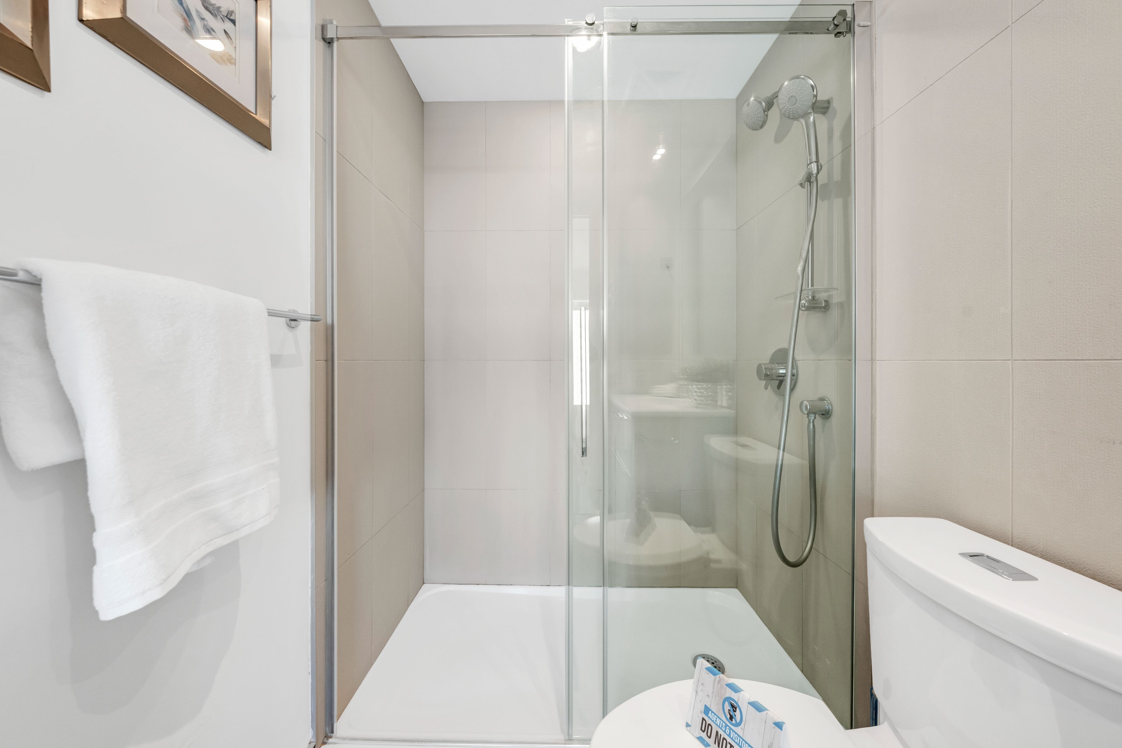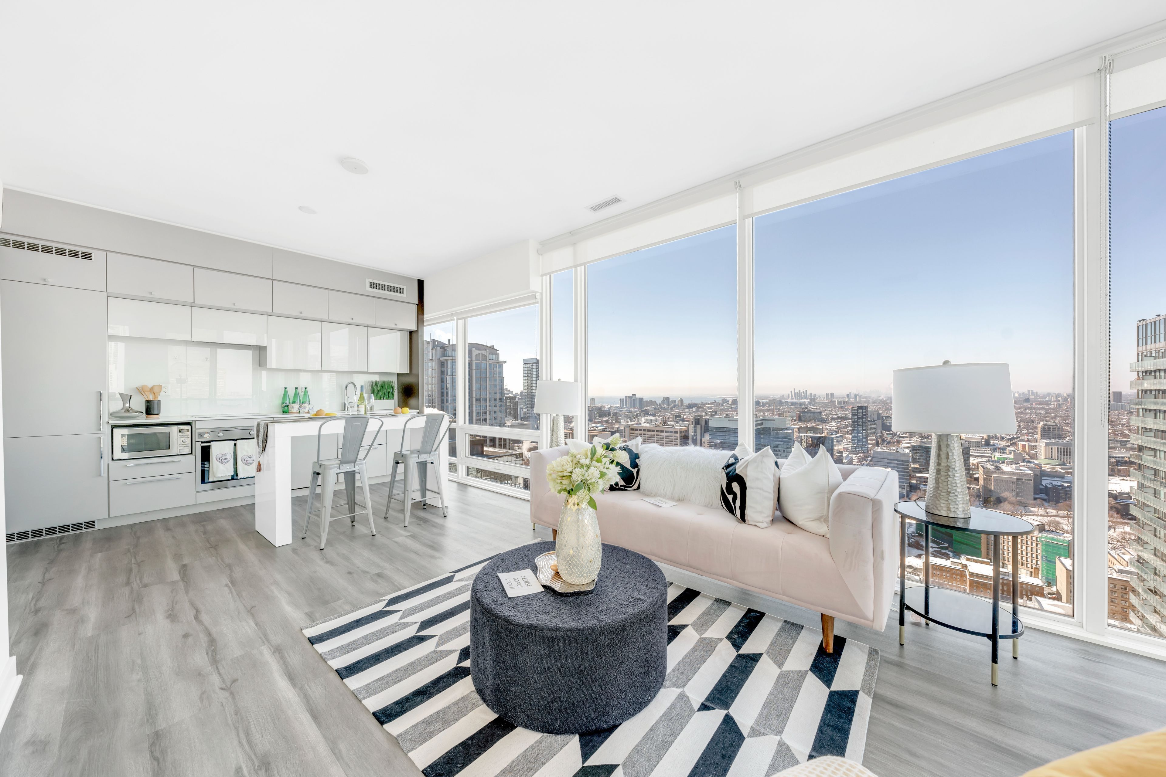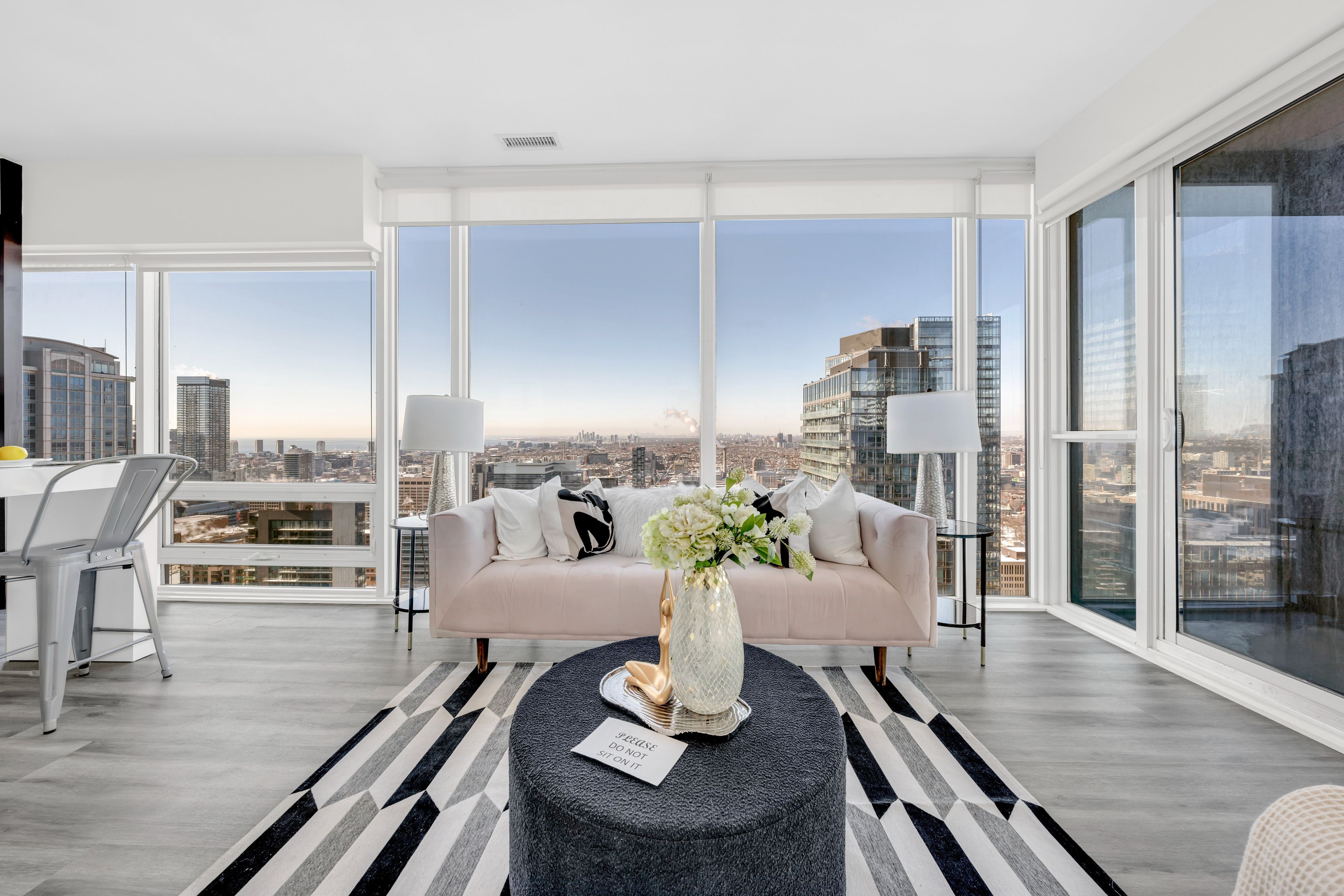 • Corner suite with stunning city and lake views from floor-to-ceiling windows.