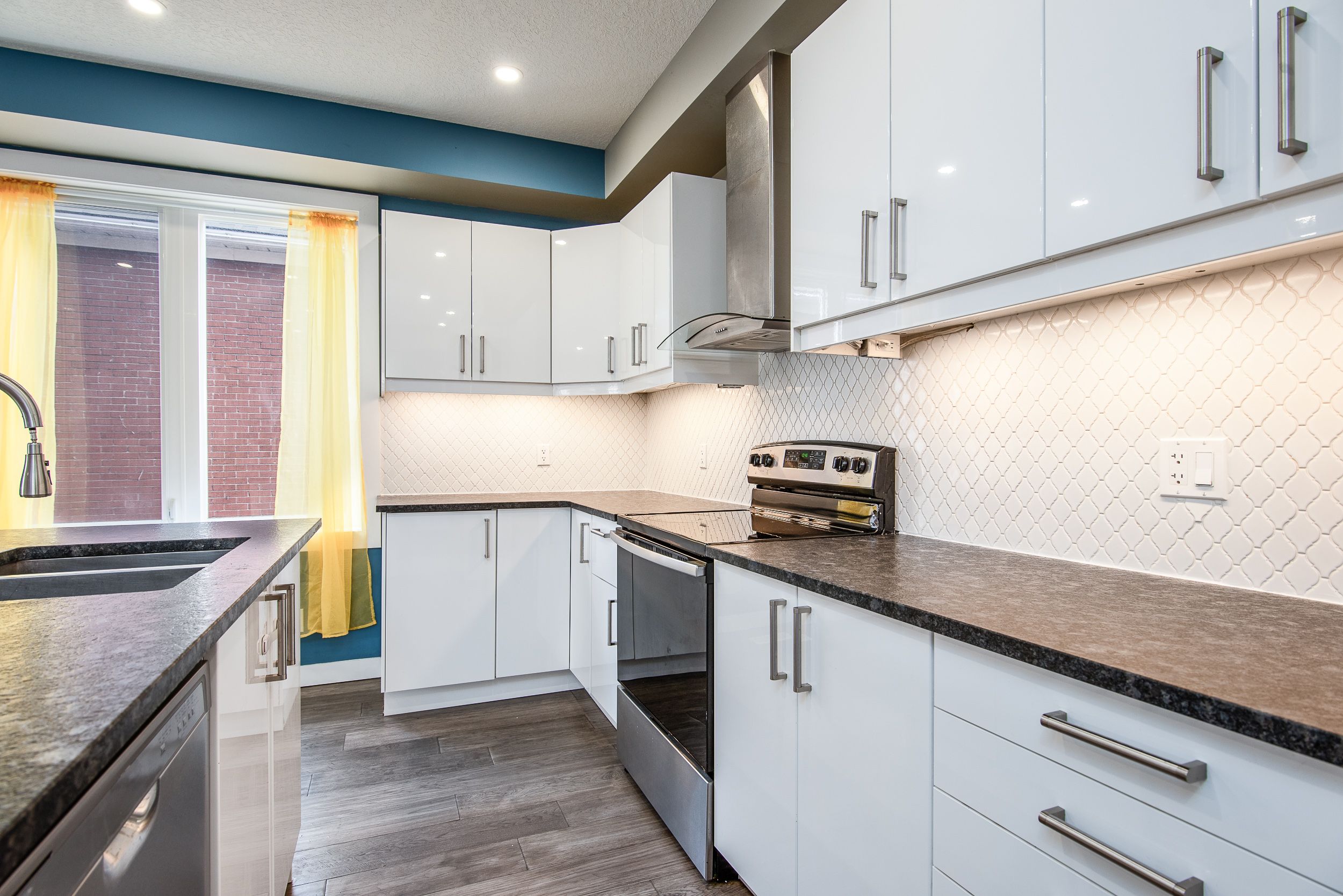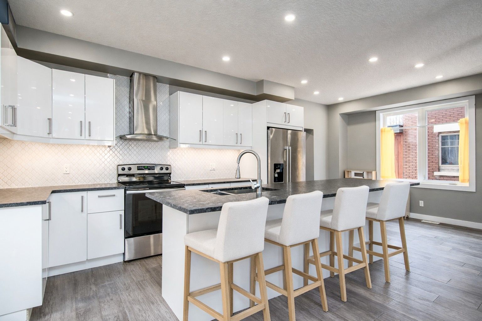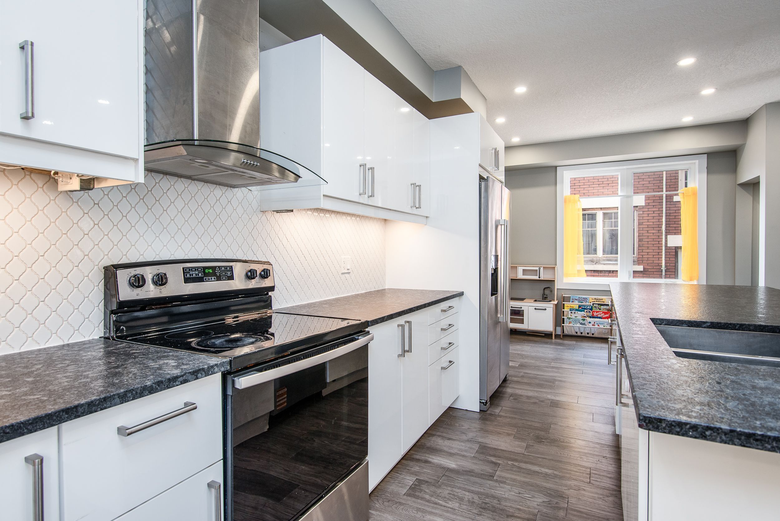 Welcome to 15 herlan avenue - where the energy of downtown living meets the comfort of a beautifully updated detached home. This stunning 4 bedroom, 3 bathroom home is just minutes from the google building, lrt, kitchener go train station, communitech and the historic tannery district. Restaurants, coffee shops, entertainment, and the beauty of victoria park are all within walking distance. Step inside to a bright open-concept main floor featuring 9-foot ceilings, engineered hardwood flooring, and over 50 led pot lights. Large windows fill the space with natural light, creating a warm and inviting atmosphere for everyday living and entertaining. The heart of the home is the open-concept kitchen and living area. The kitchen features wall-to-wall cabinetry, granite countertops, a stylish backsplash, stainless steel appliances, and an impressive 8-foot island with generous workspace and seating. Flowing into the living room, the space is anchored by a cozy electric fireplace. The main floor also includes a modern 4-piece bathroom, mudroom, and convenient laundry area. Upstairs you will find three spacious bedrooms including the primary suite with its own 3-piece ensuite and walkout to a private deck overlooking the fully fenced backyard. An additional 3-piece bathroom serves the remaining bedrooms, while the finished attic provides versatile bonus space ideal for a playroom, games room or home office. The finished basement with a separate entrance offers additional living space with a large rec room, another bedroom and workout area. Outside, the property features a rare 166-foot deep lot, large deck, fully fenced backyard, single detached garage and driveway parking for four or more vehicles. Extensively updated in recent years with updated plumbing, electrical, ductwork, furnace and air conditioning, making it truly move-in ready. A rare opportunity to own a renovated detached home steps from kitchener's thriving tech hub and downtown amenities.