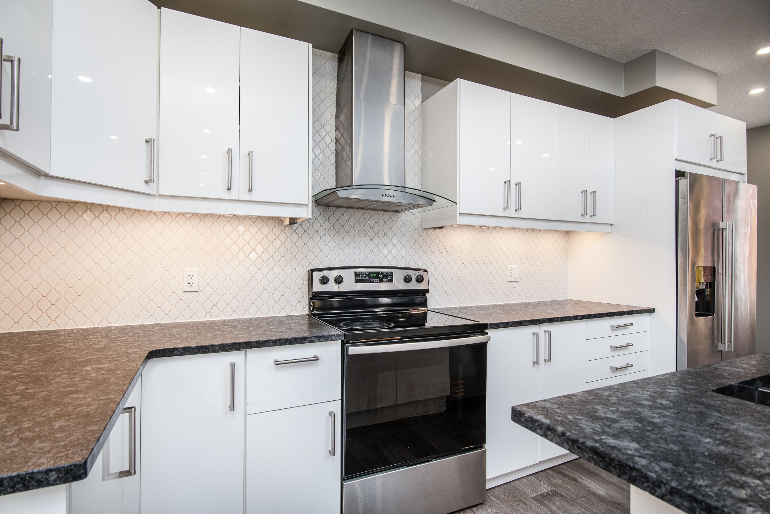 • Modern kitchen with granite countertops and spacious 8-foot island.
