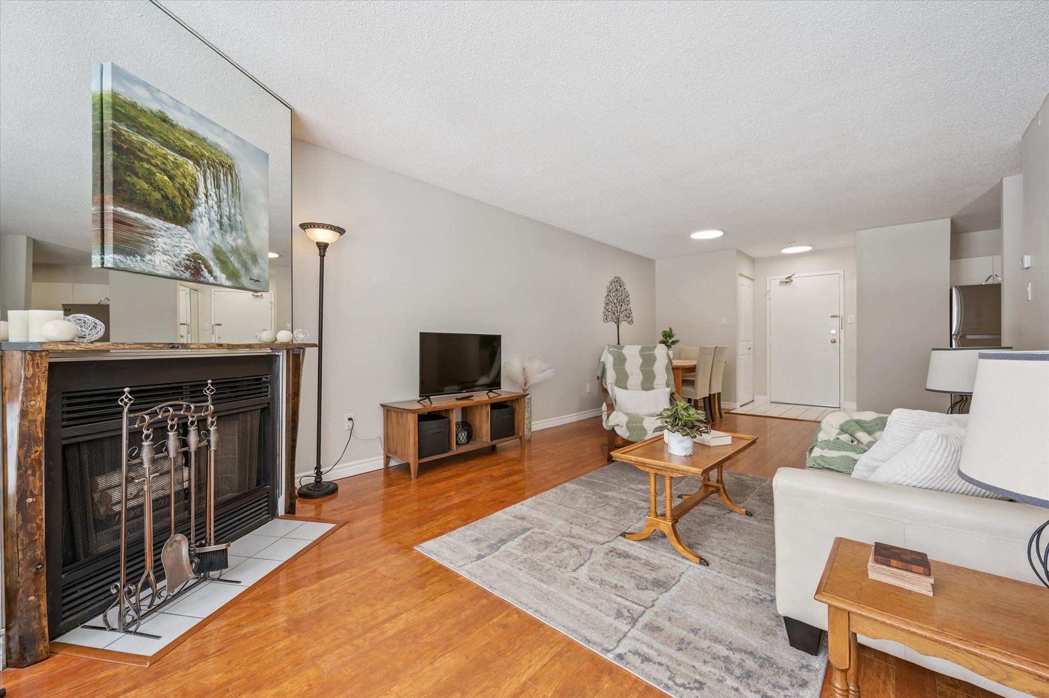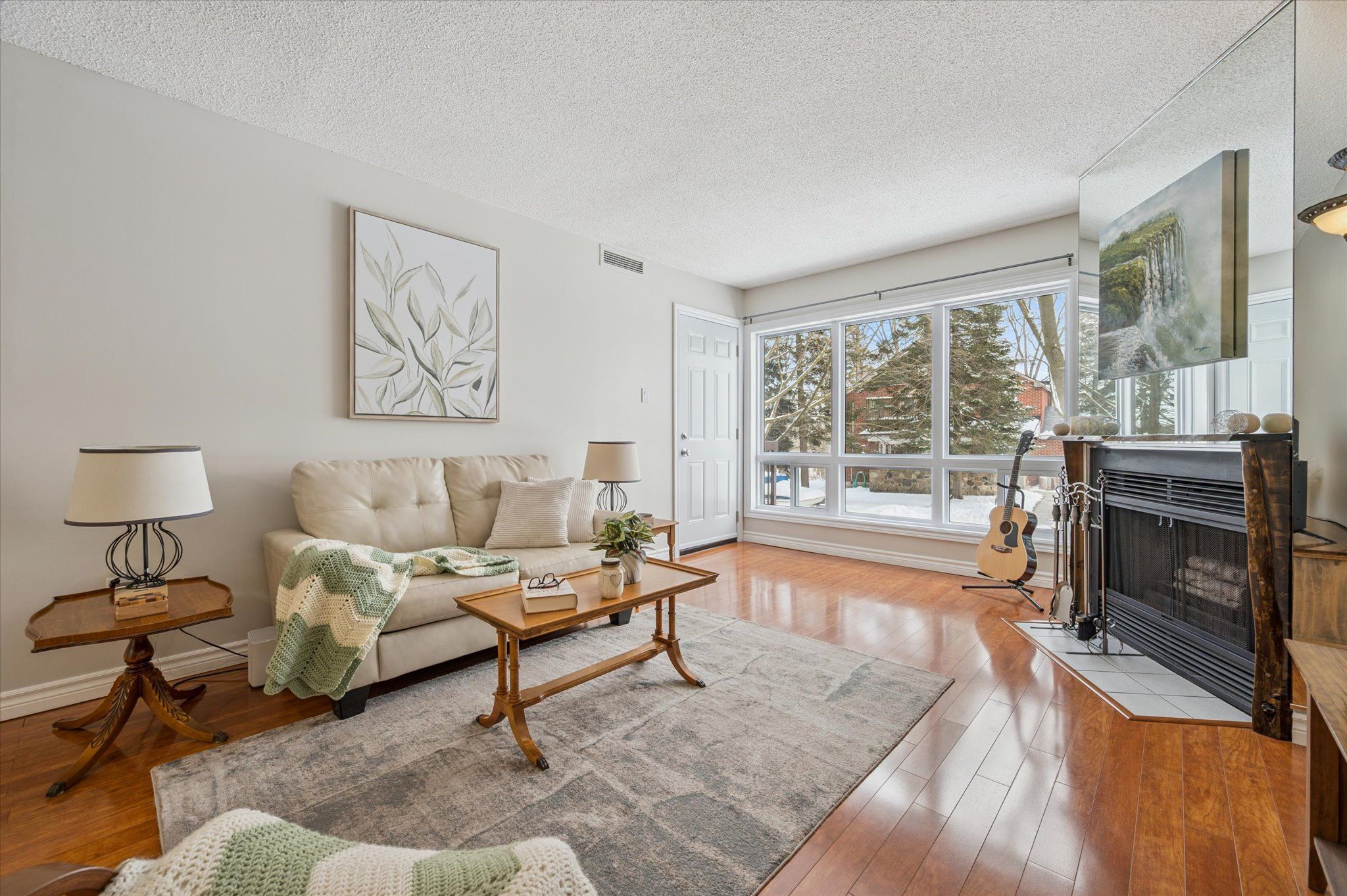 • Bright open-concept living space with a cozy wood-burning fireplace.