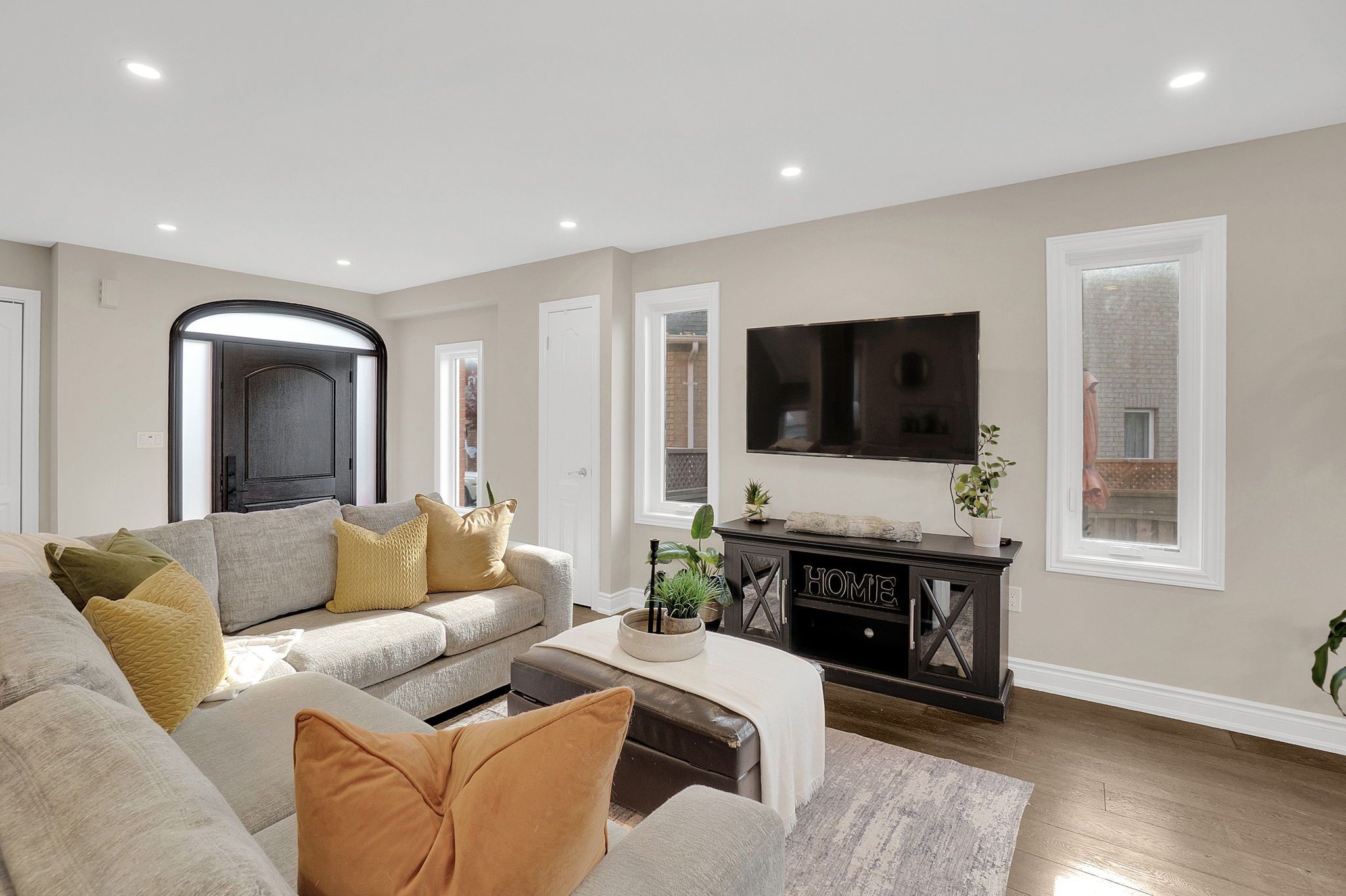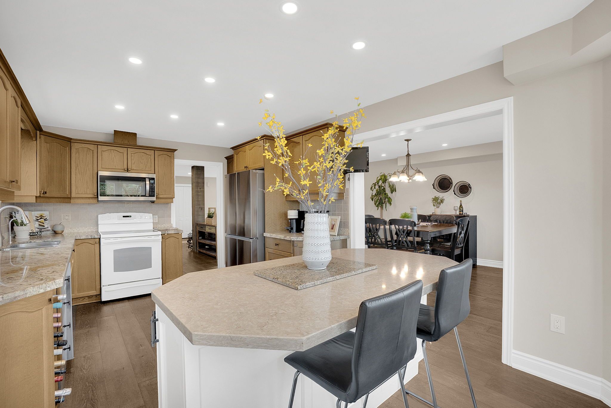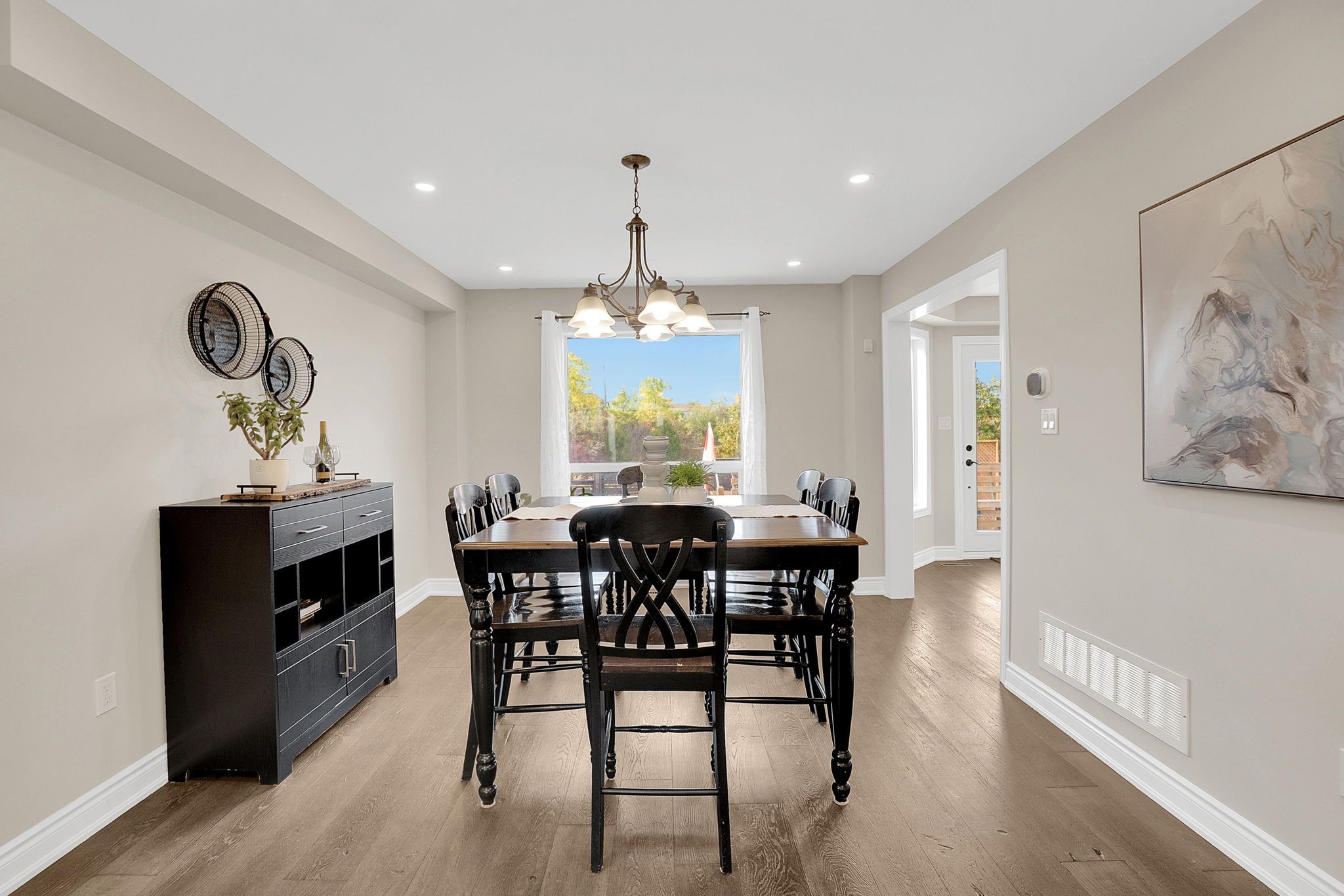 • Open-concept living and dining area with rich hardwood floors.