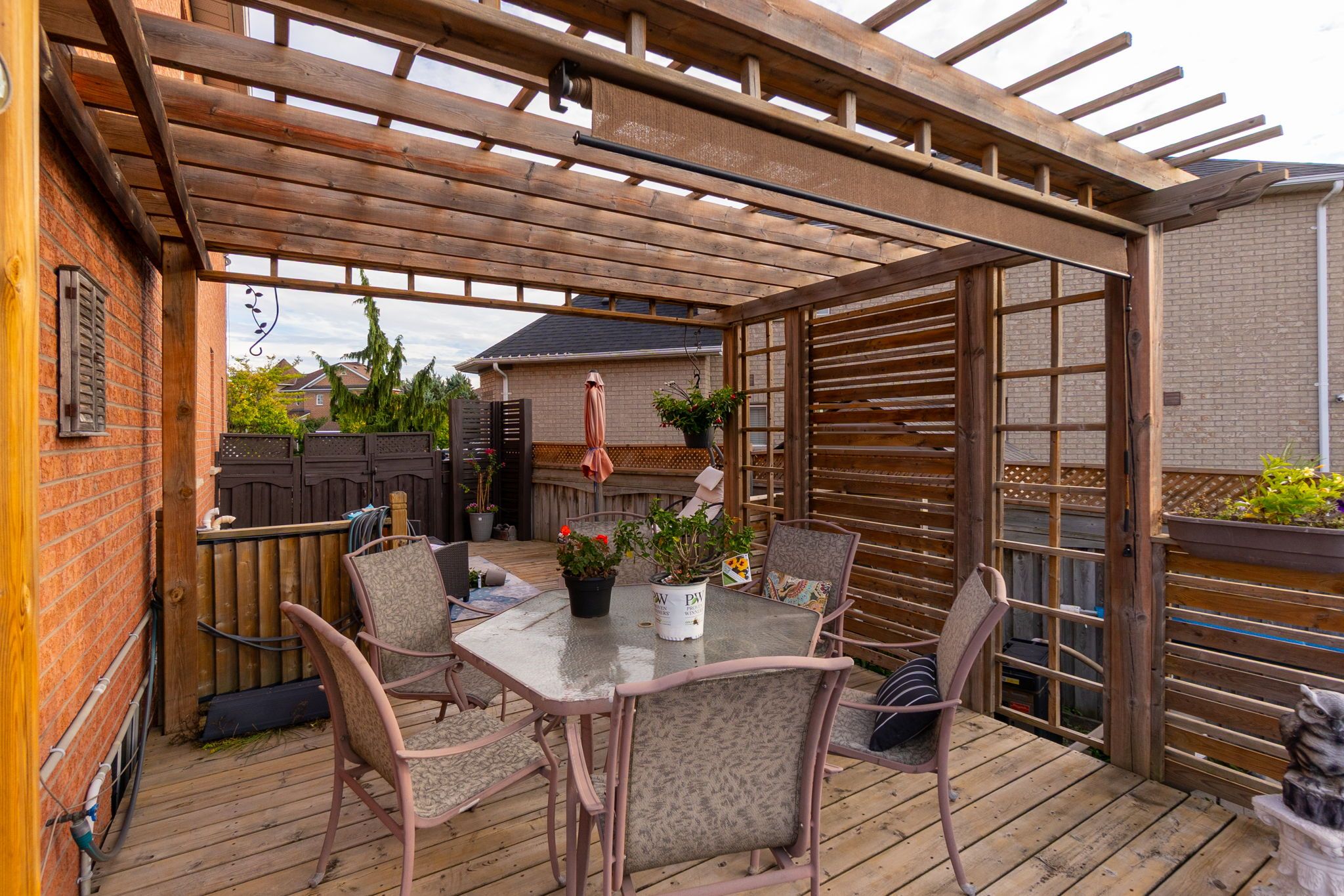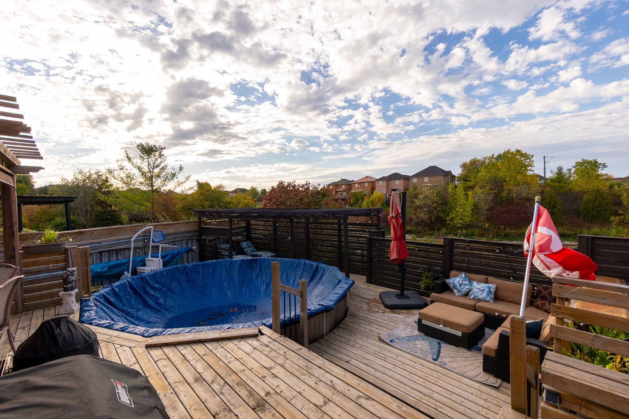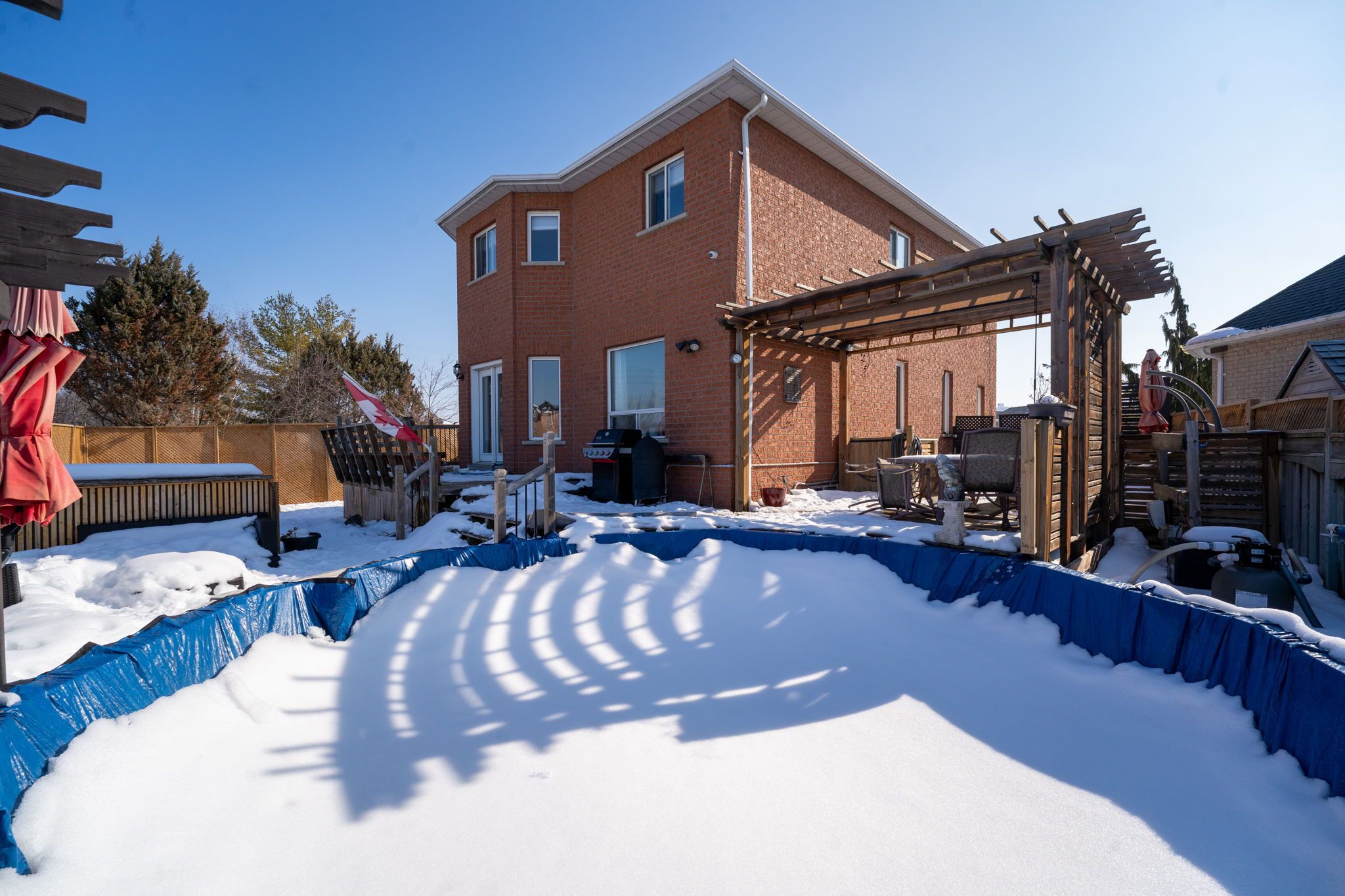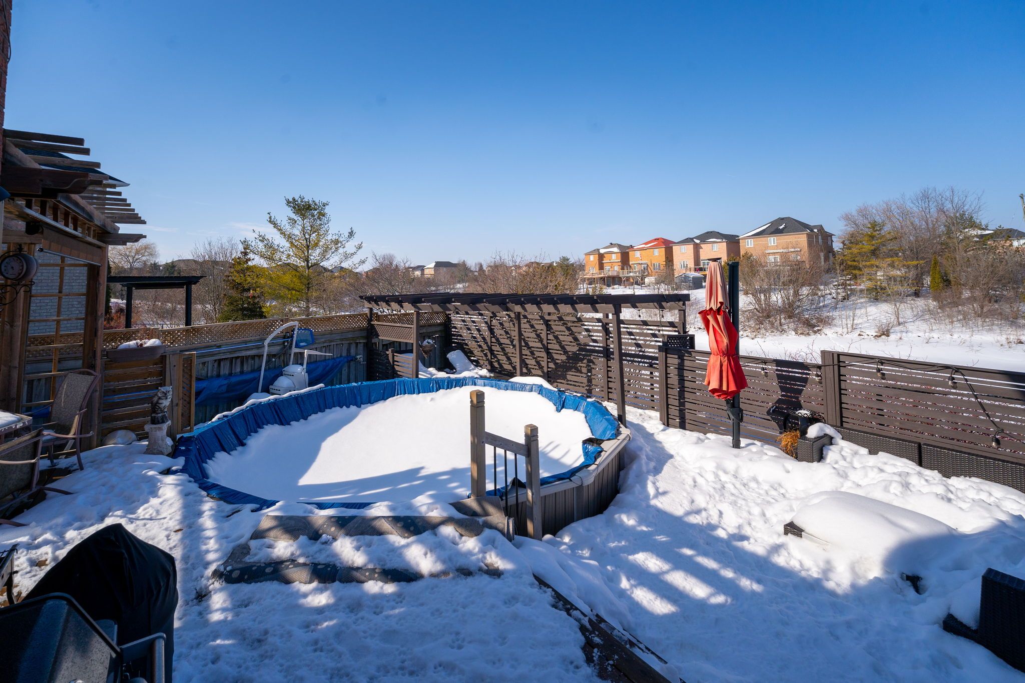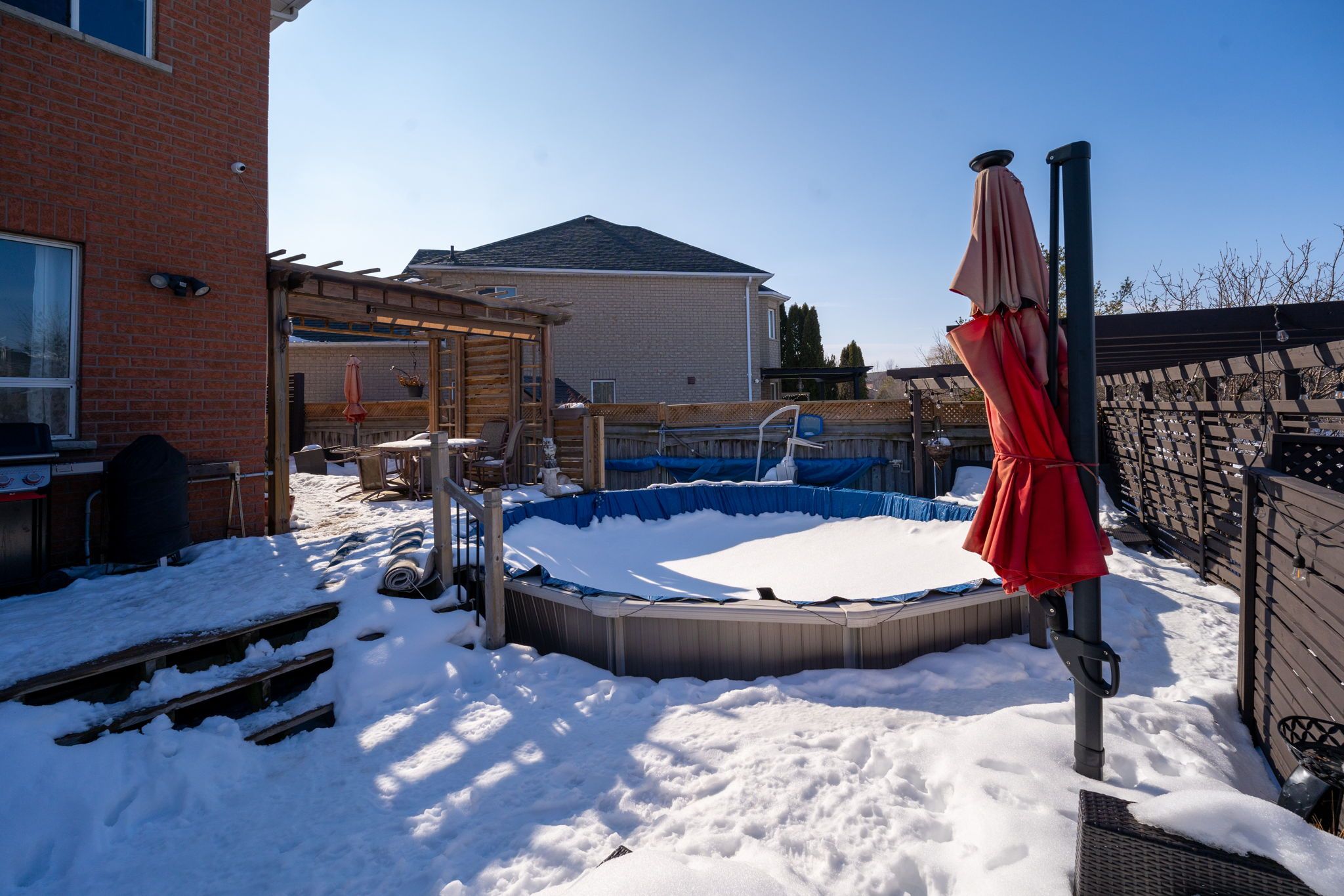 • Private backyard oasis featuring multi-level patio and above-ground pool.