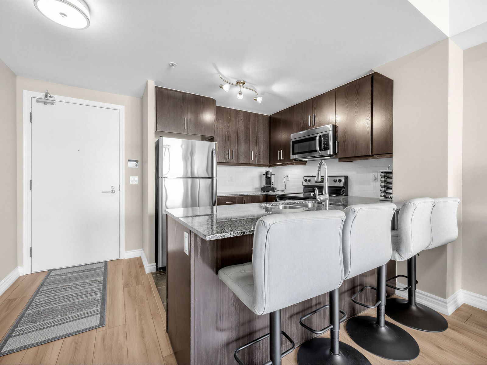 • Modern kitchen with granite counters and full-sized stainless steel appliances.