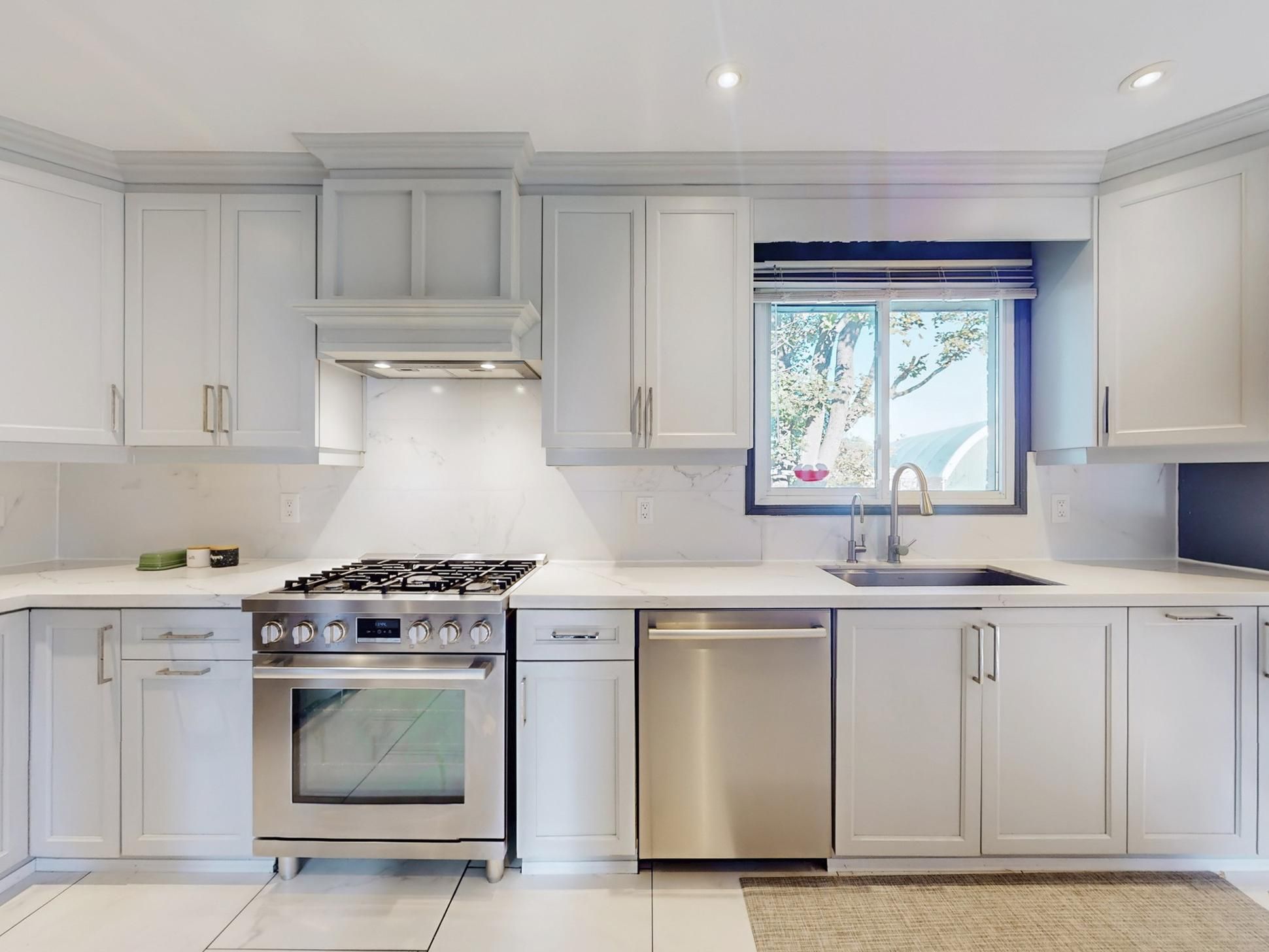 • Stylish kitchen with quartz surfaces and stainless steel appliances.