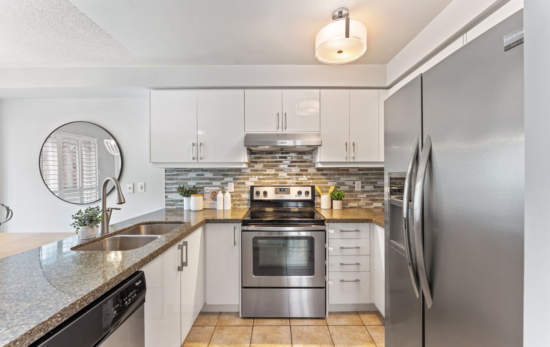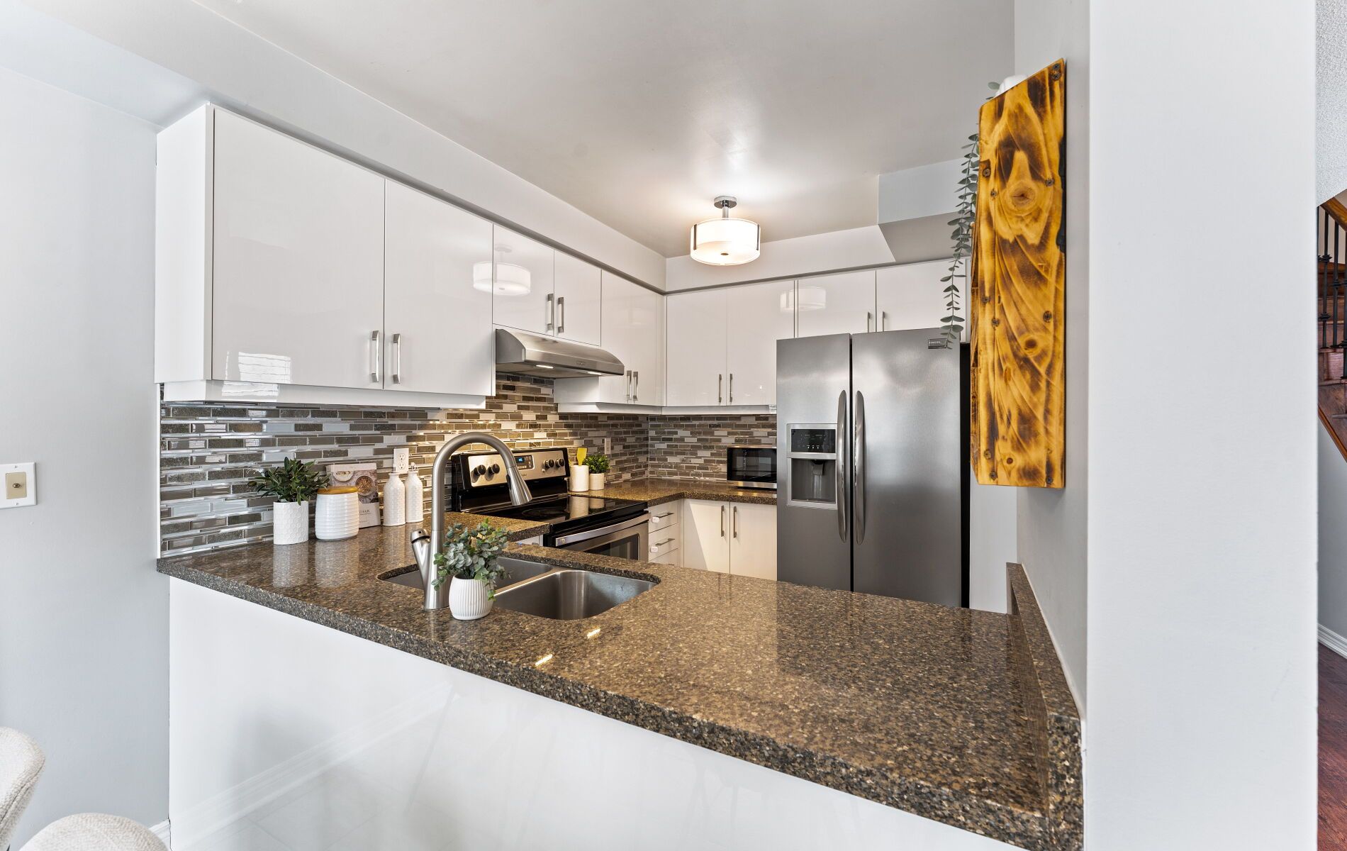 • Modern kitchen features stainless steel appliances and a breakfast bar.