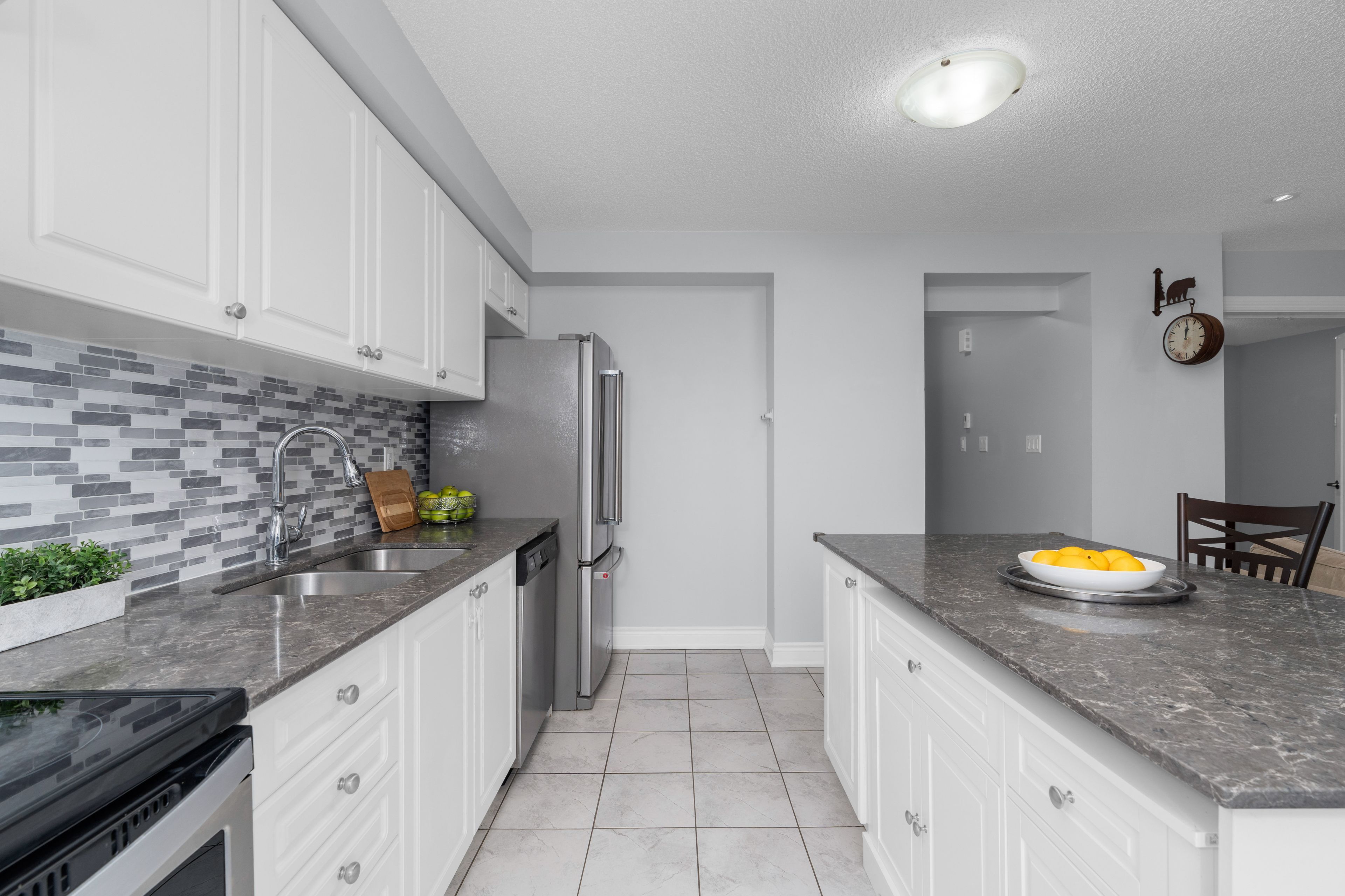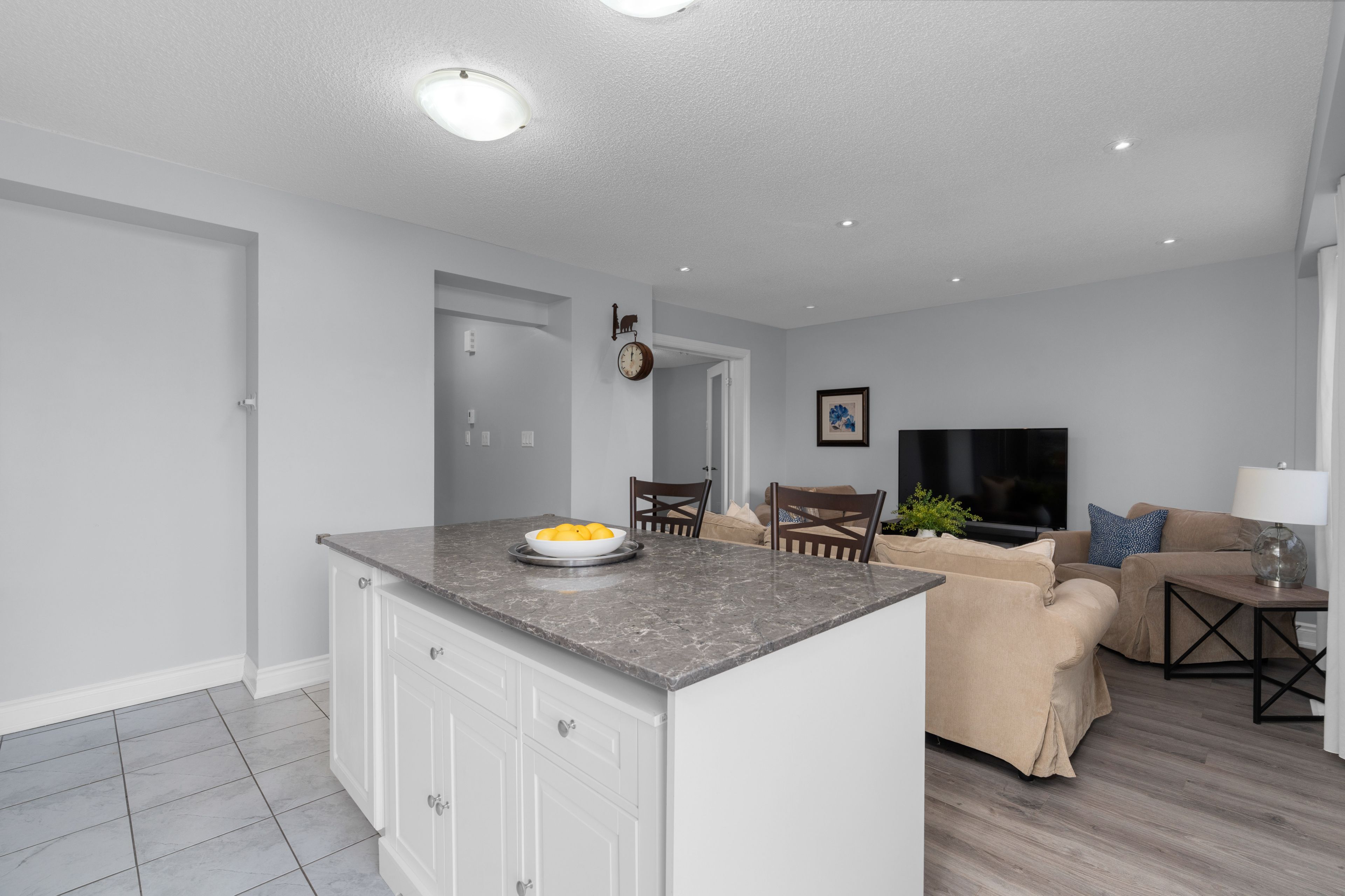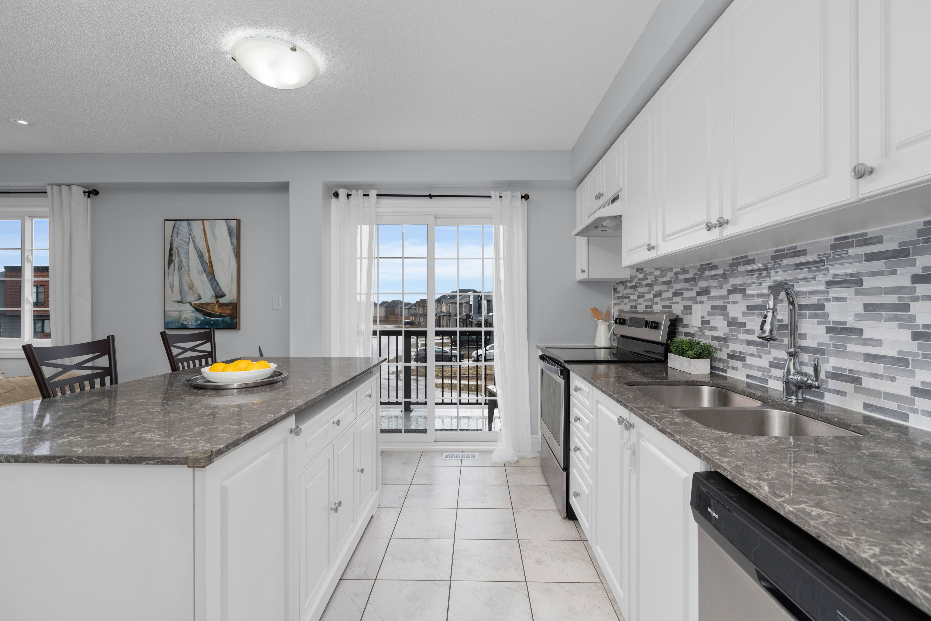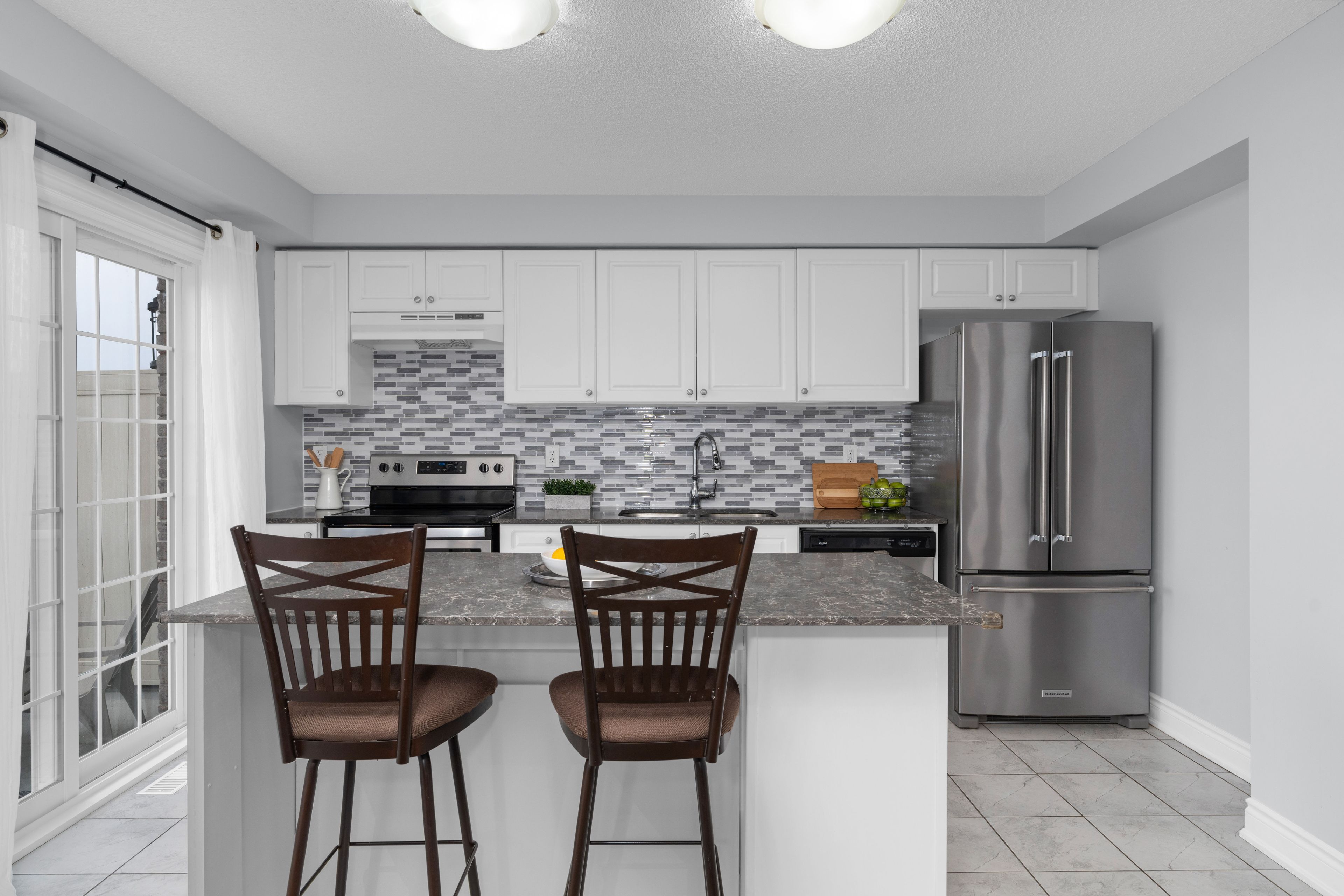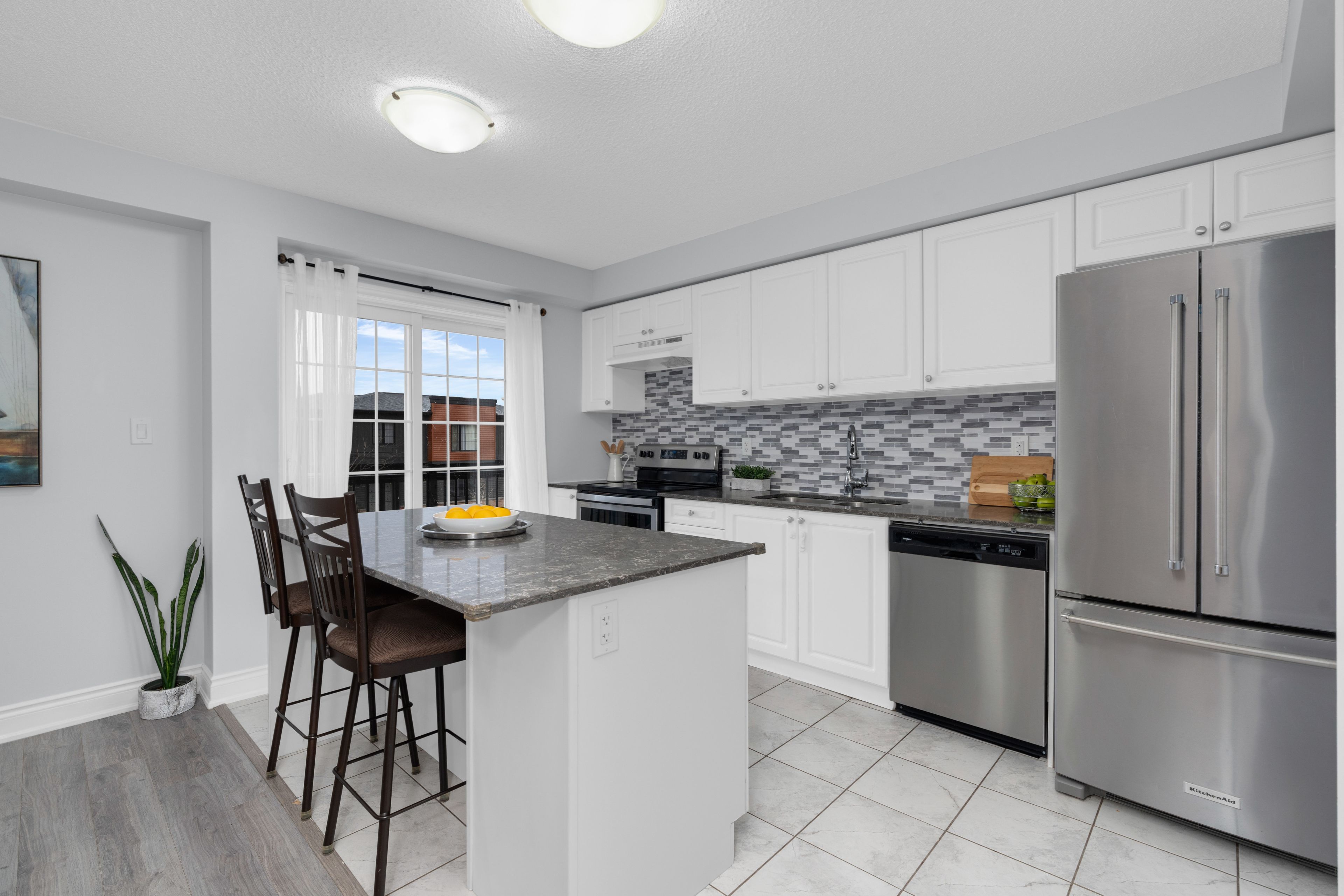 • Bright kitchen with stone countertops, stainless steel appliances, and a large island.