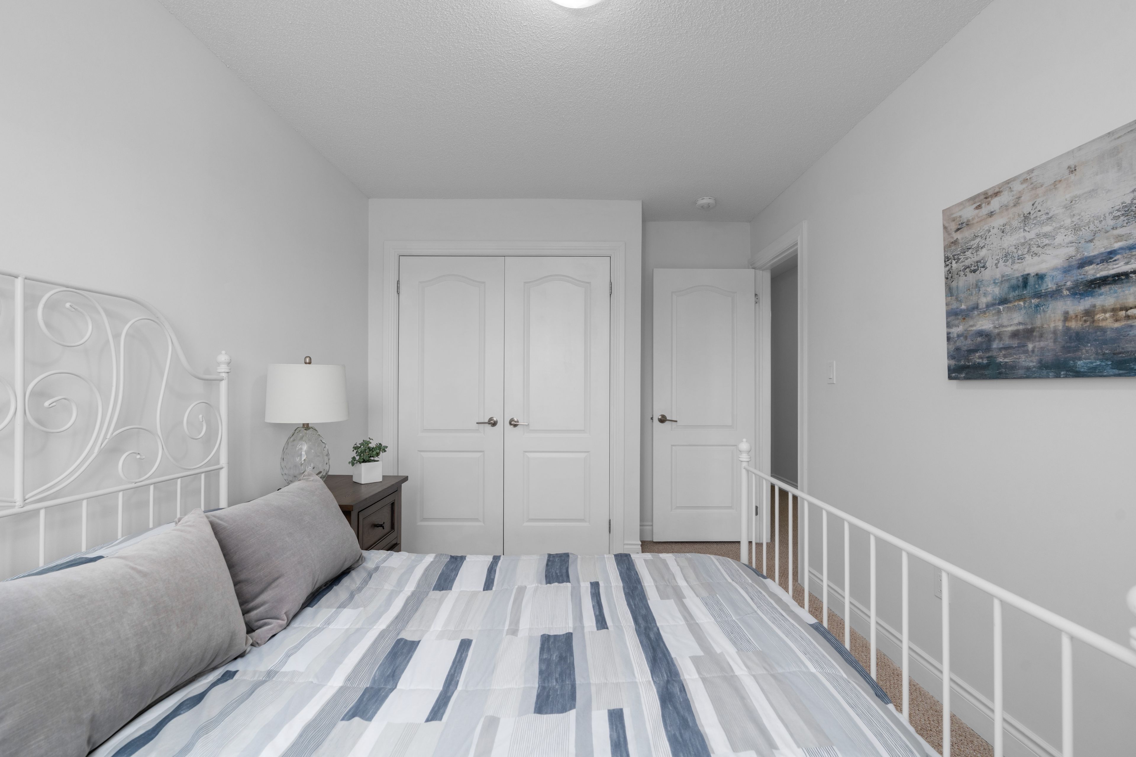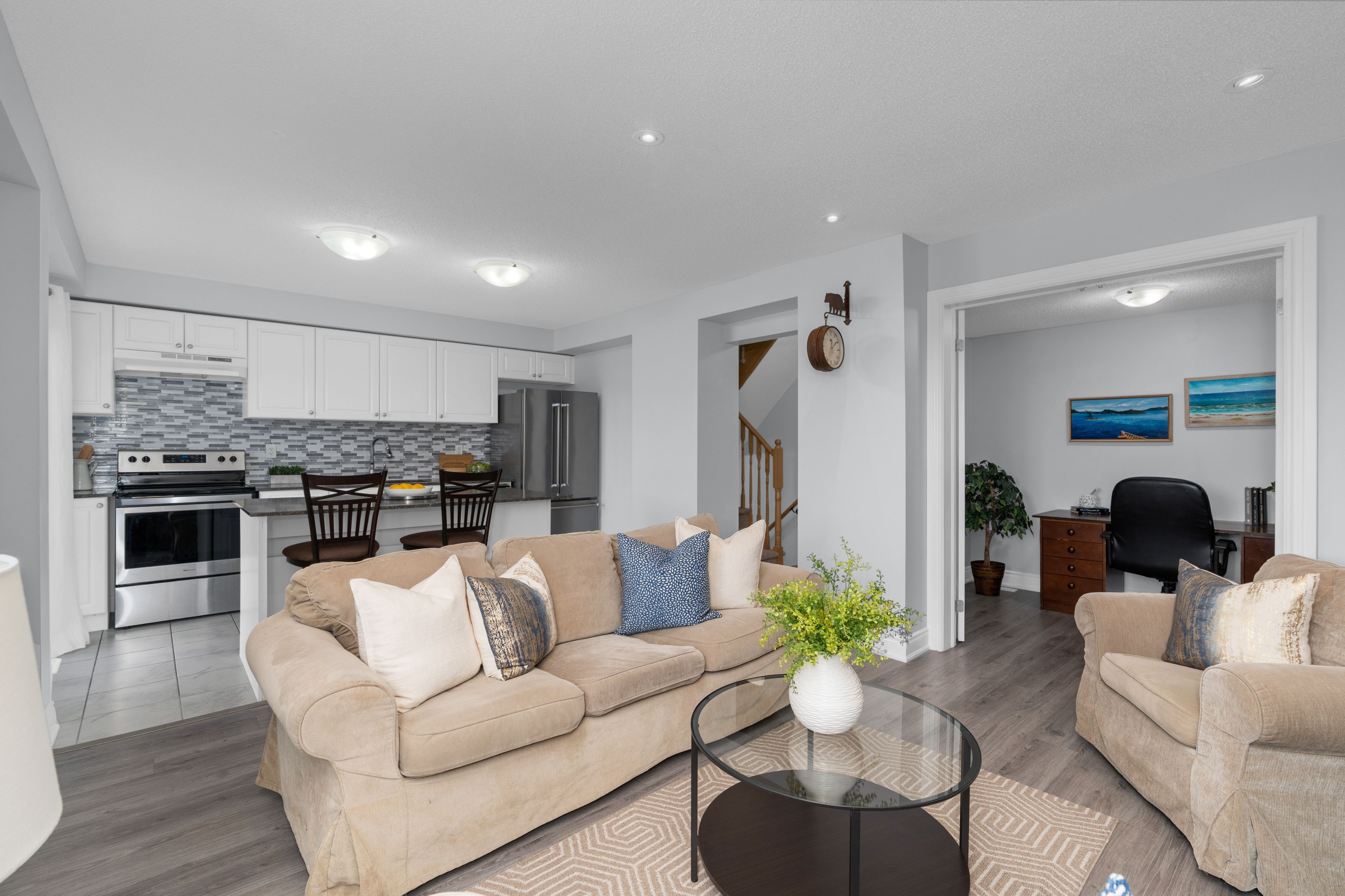 Welcome to this well-maintained, original owner freehold townhome built in 2020, offering a bright and functional layout in one of barrie's most convenient and family-friendly neighbourhoods. A standout feature is the extended driveway with no sidewalk, allowing for additional parking and added everyday convenience. The main level offers a spacious entryway with ceramic flooring, a 2-piece powder room, and inside entry from the garage. The open-concept layout flows into a bright white kitchen featuring stone countertops, ample cupboard space, stainless steel appliances, and a large island, along with direct access to the west-facing balcony off the kitchen-an ideal spot to enjoy afternoon sun and beautiful evening sunsets. Just off the kitchen and living area, you'll find a versatile bonus den space, perfect for a home office, reading nook, or additional lounge area. With no direct homes across the street, this home offers a more open feel and added privacy compared to many homes in similar communities. Upstairs, you'll find two spacious bedrooms with large closets and a 4-piece bathroom, providing comfortable and practical living. Located just minutes to highway 400, shopping including costco, schools, parks, and bear creek trails, this home offers an ideal balance of location, functionality, and value.