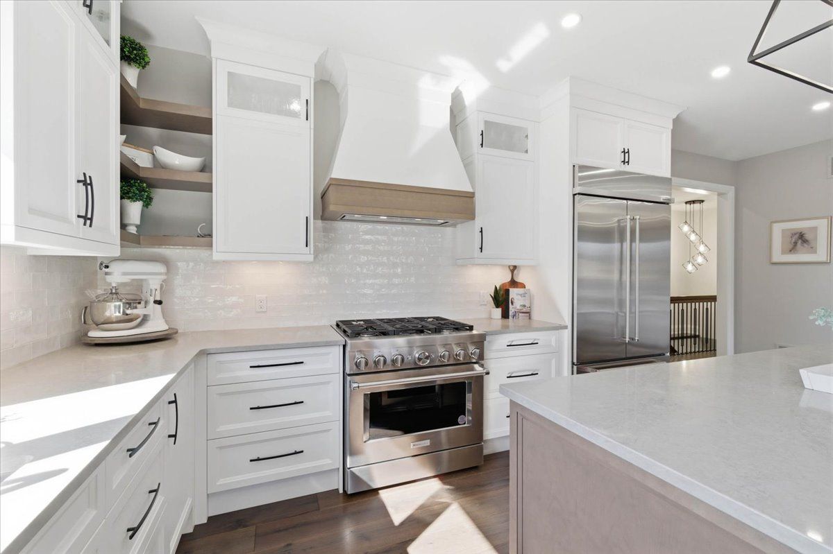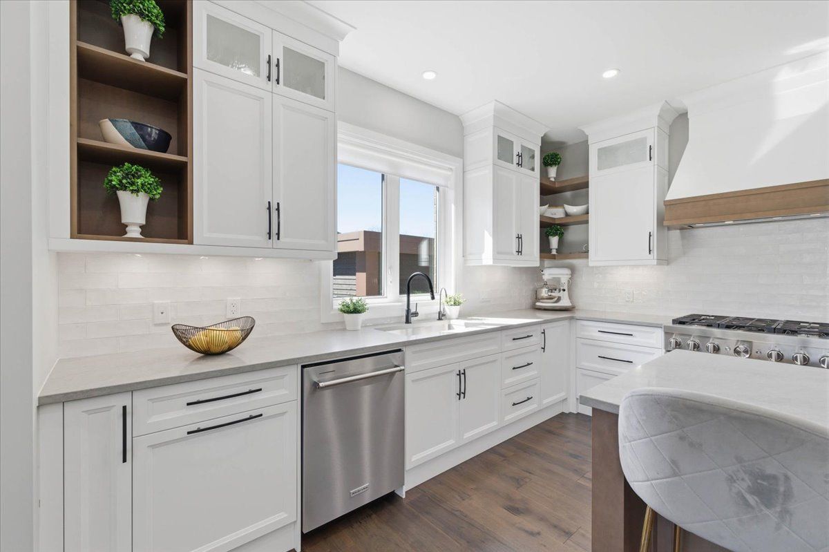 • Modern kitchen with quartz countertops and unique tile backsplash.
