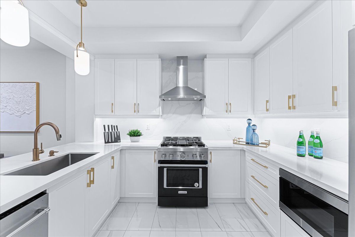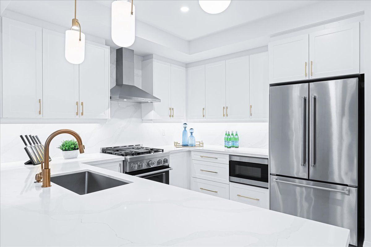 • Modern kitchen with granite countertops and stainless steel appliances.