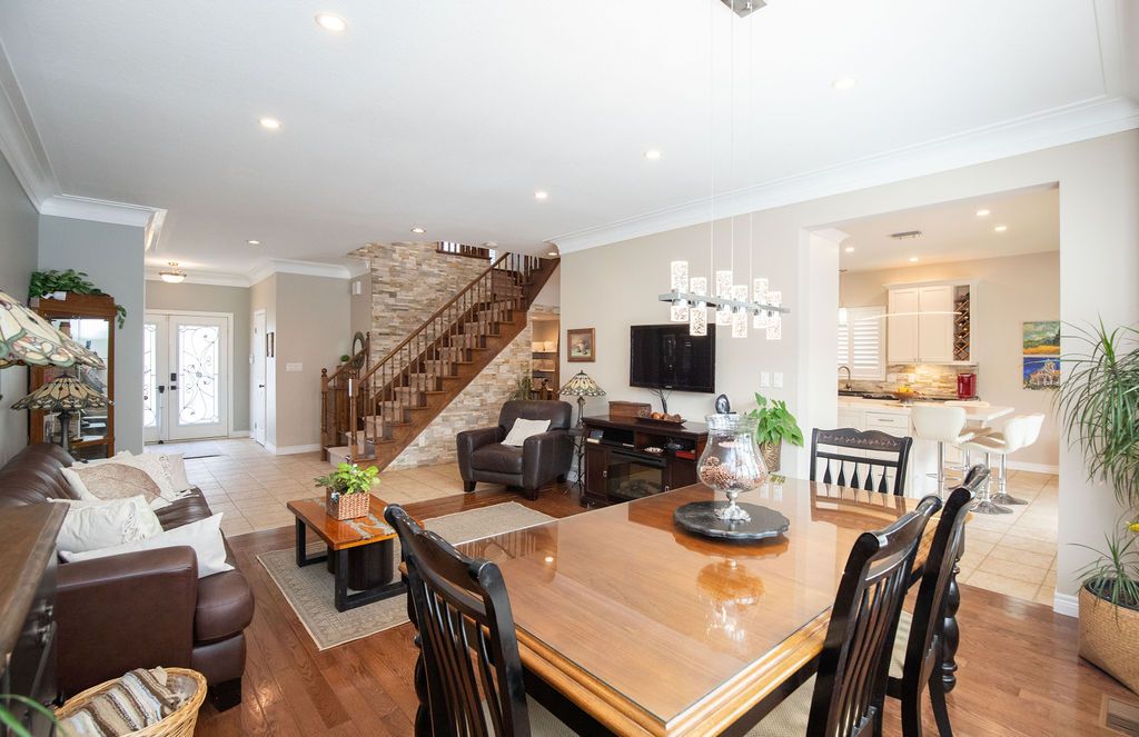 • Open layout connects living and dining areas for a warm atmosphere.