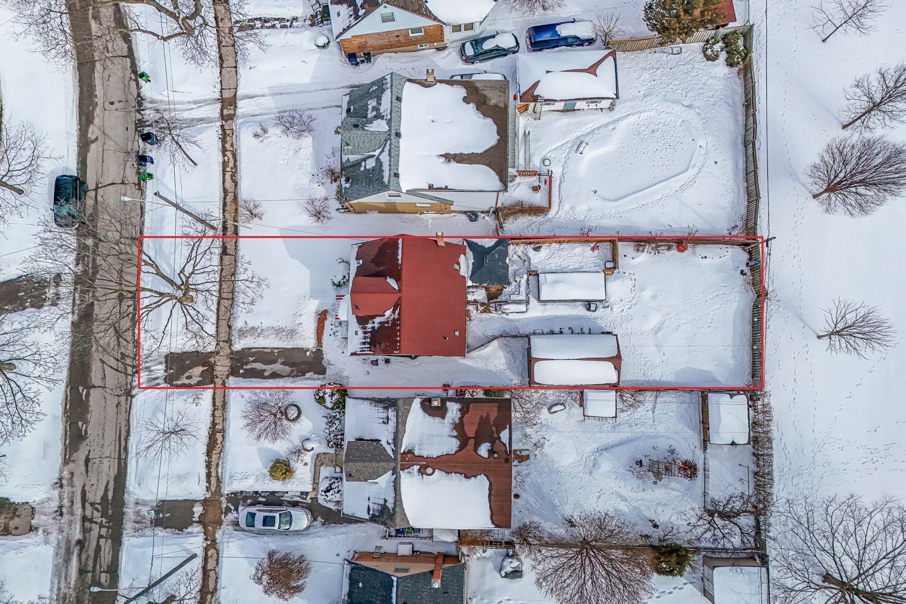 • Long private driveway leading to a detached garage.