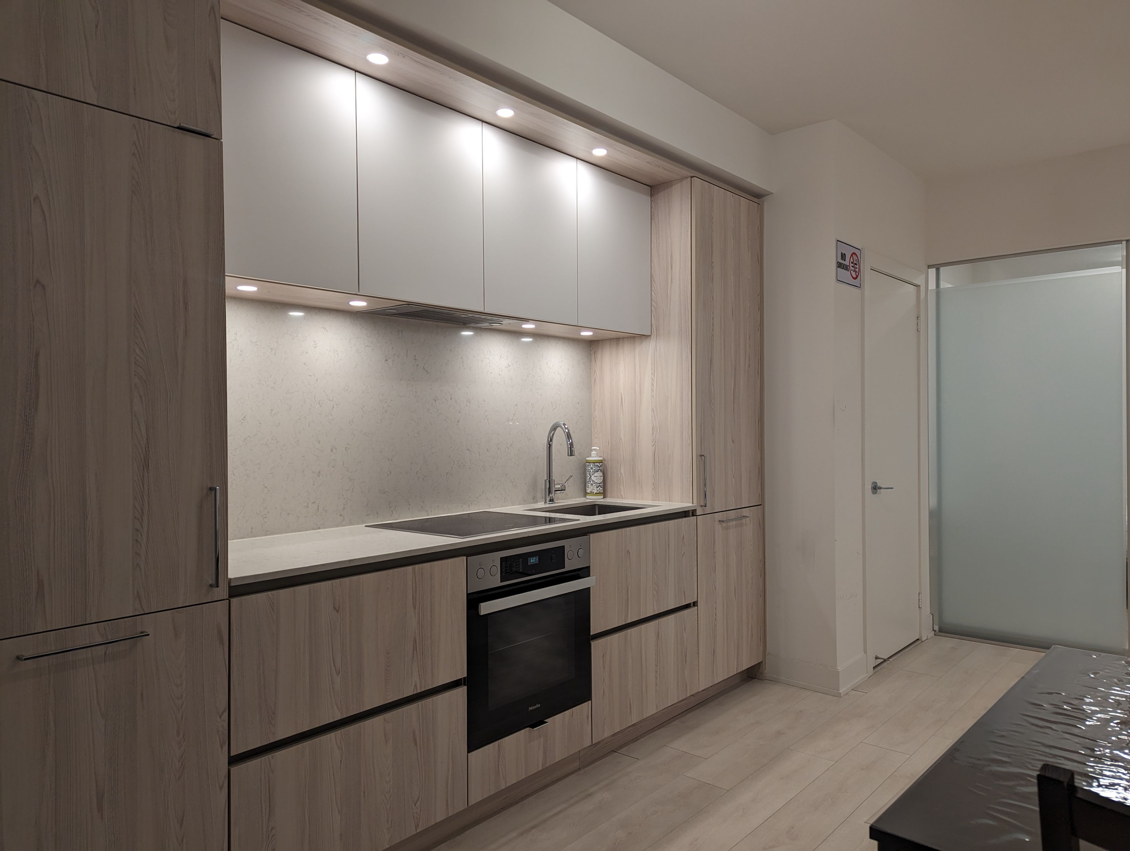 • High-end kitchen equipped with built-in appliances and quartz countertops.