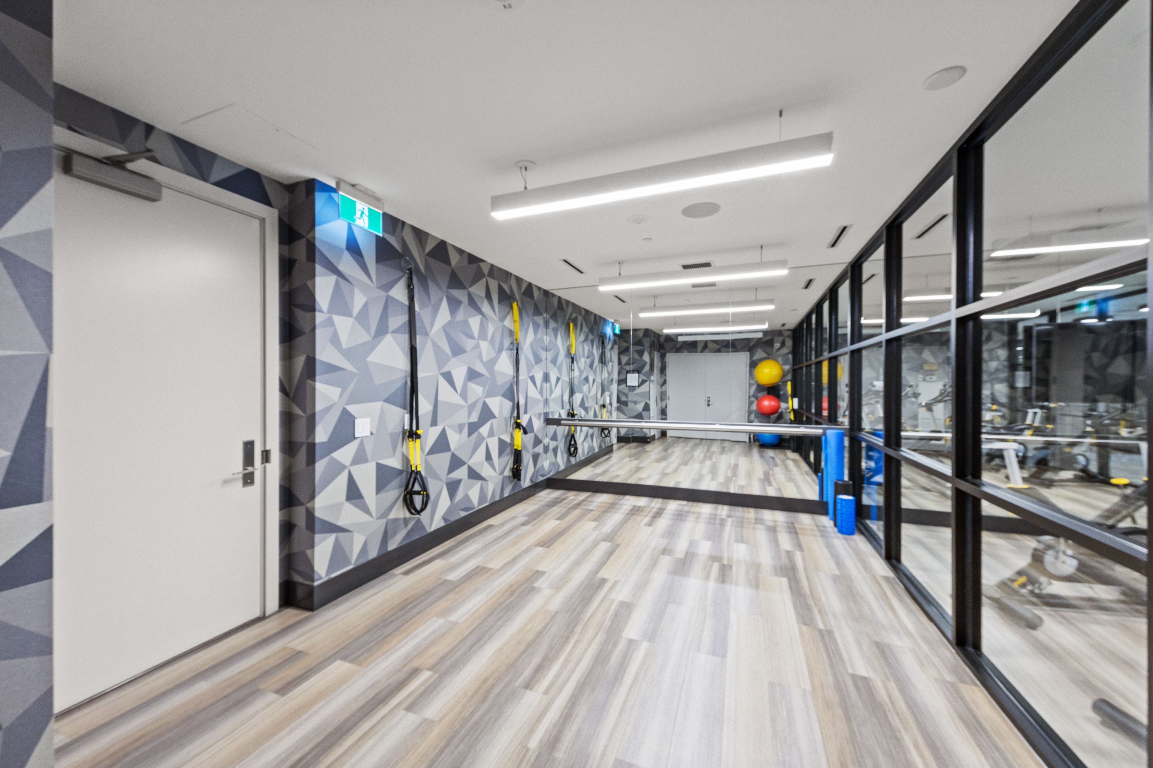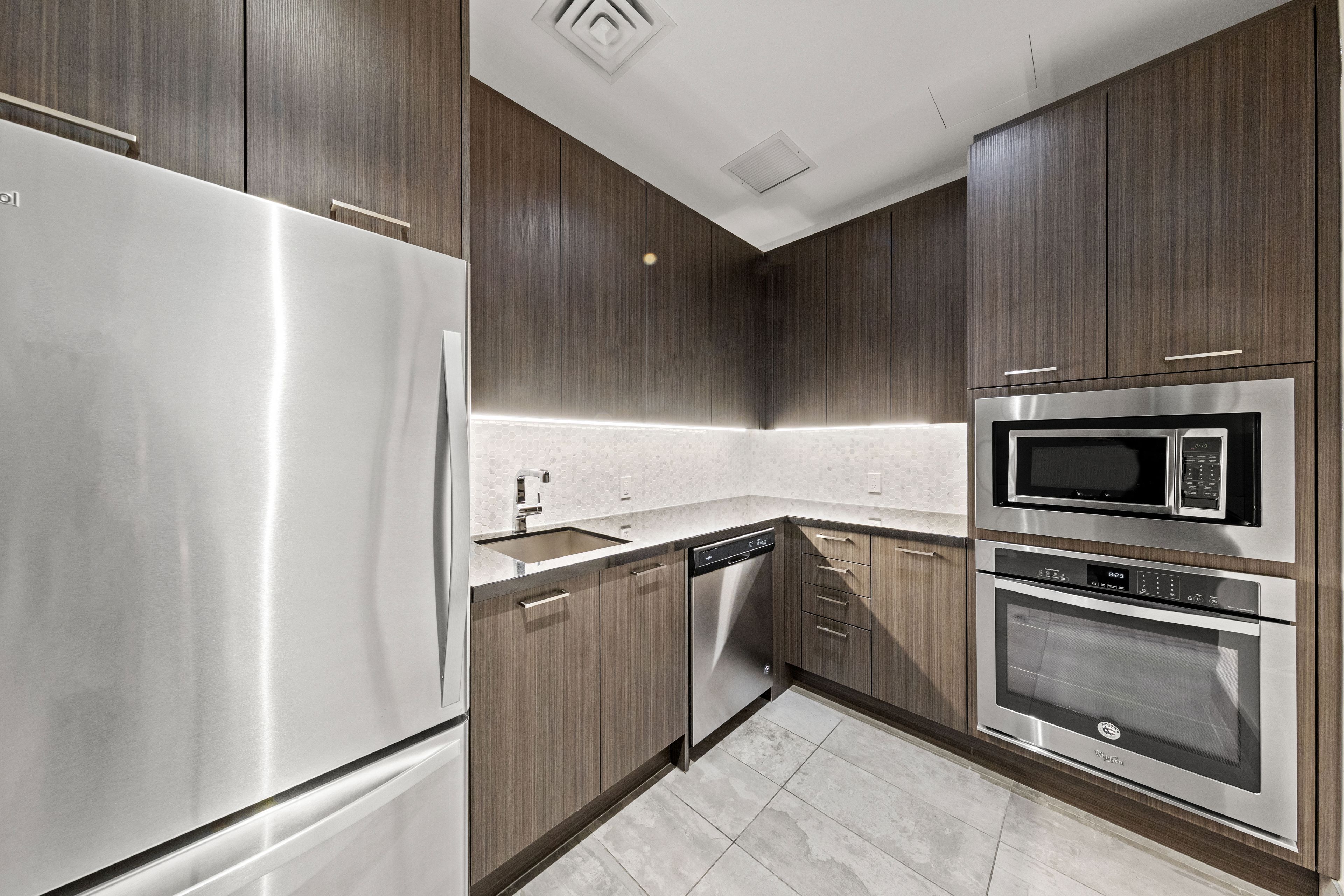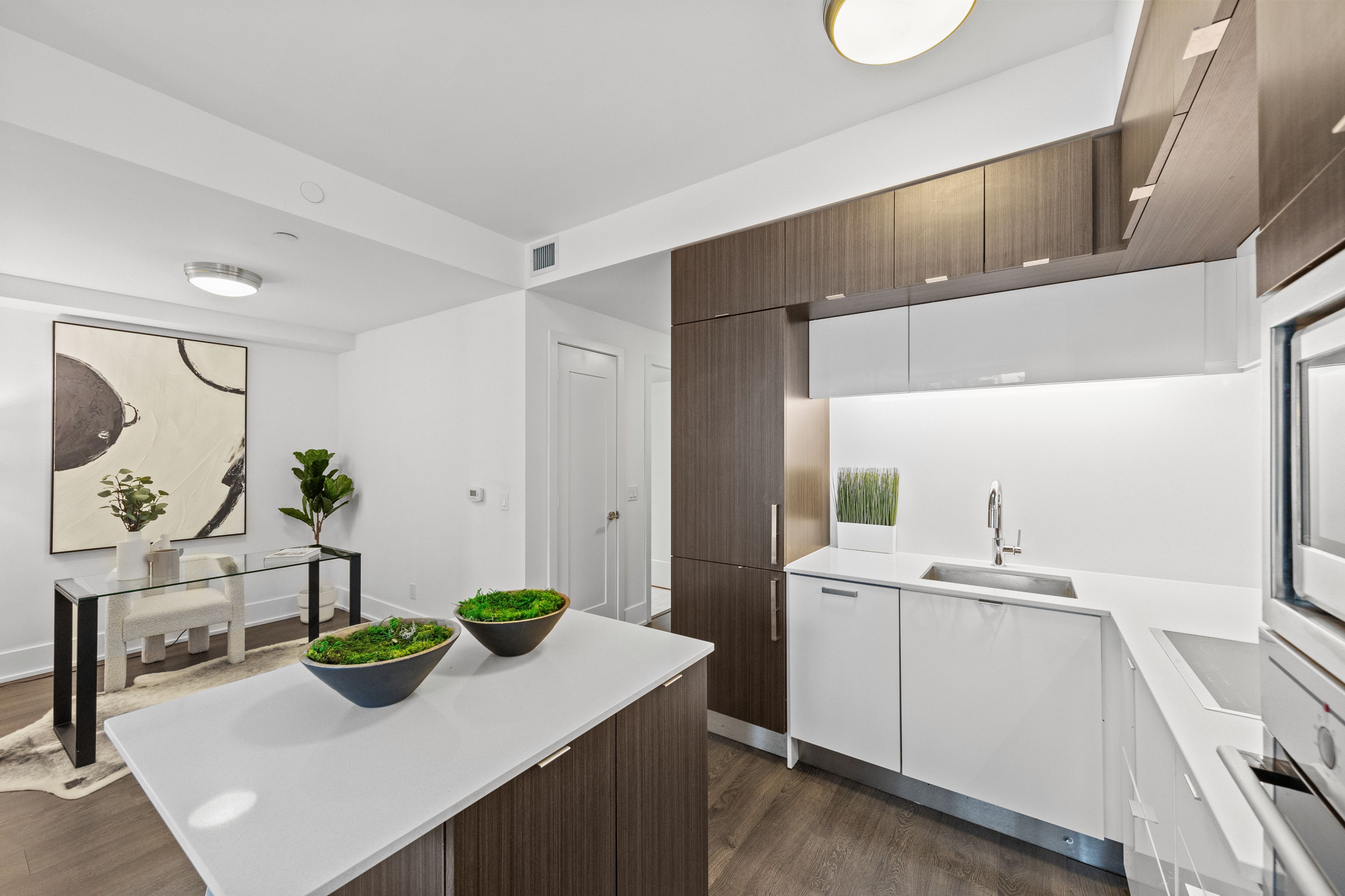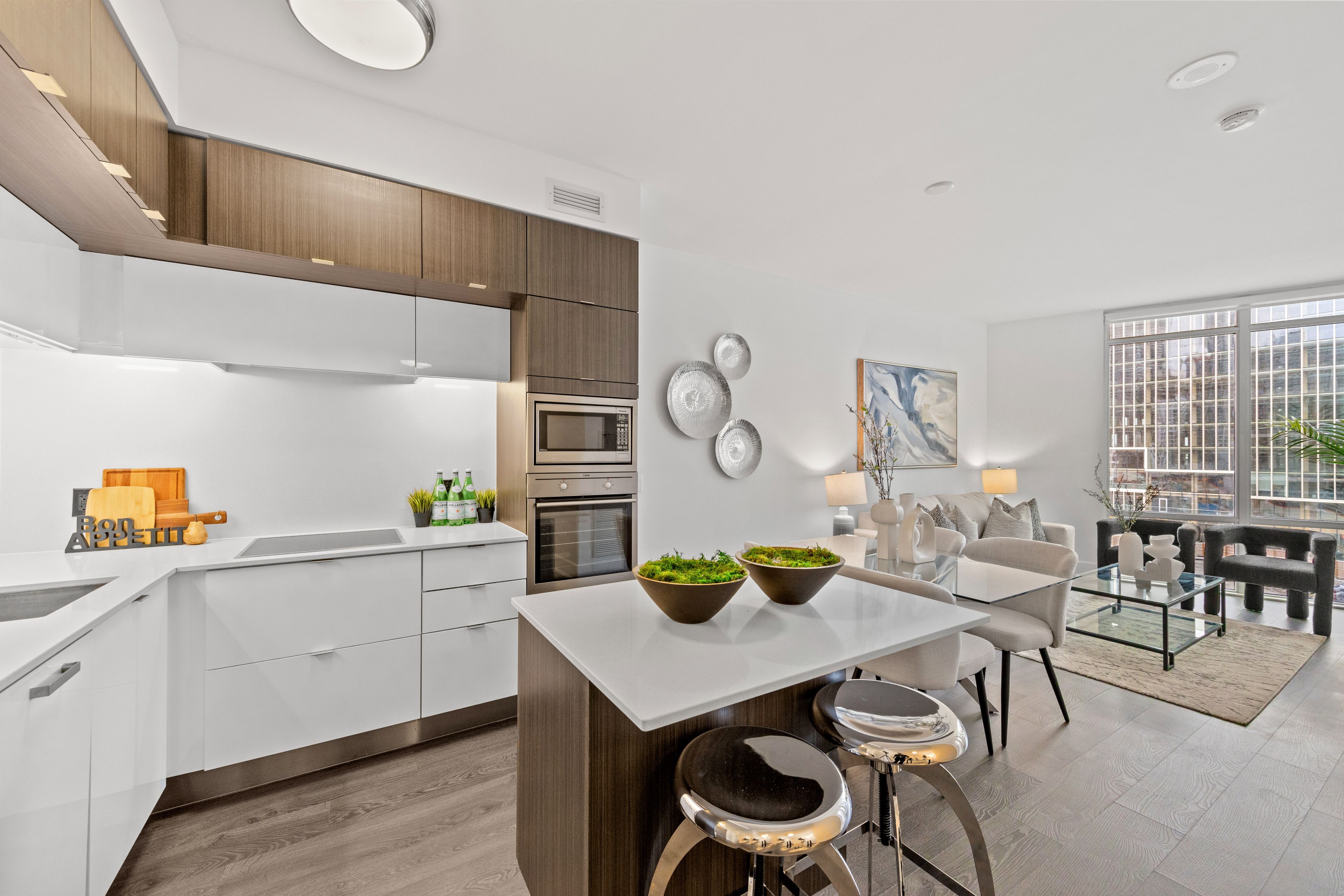 • Modern kitchen with sleek cabinetry, built-in appliances, and an island.