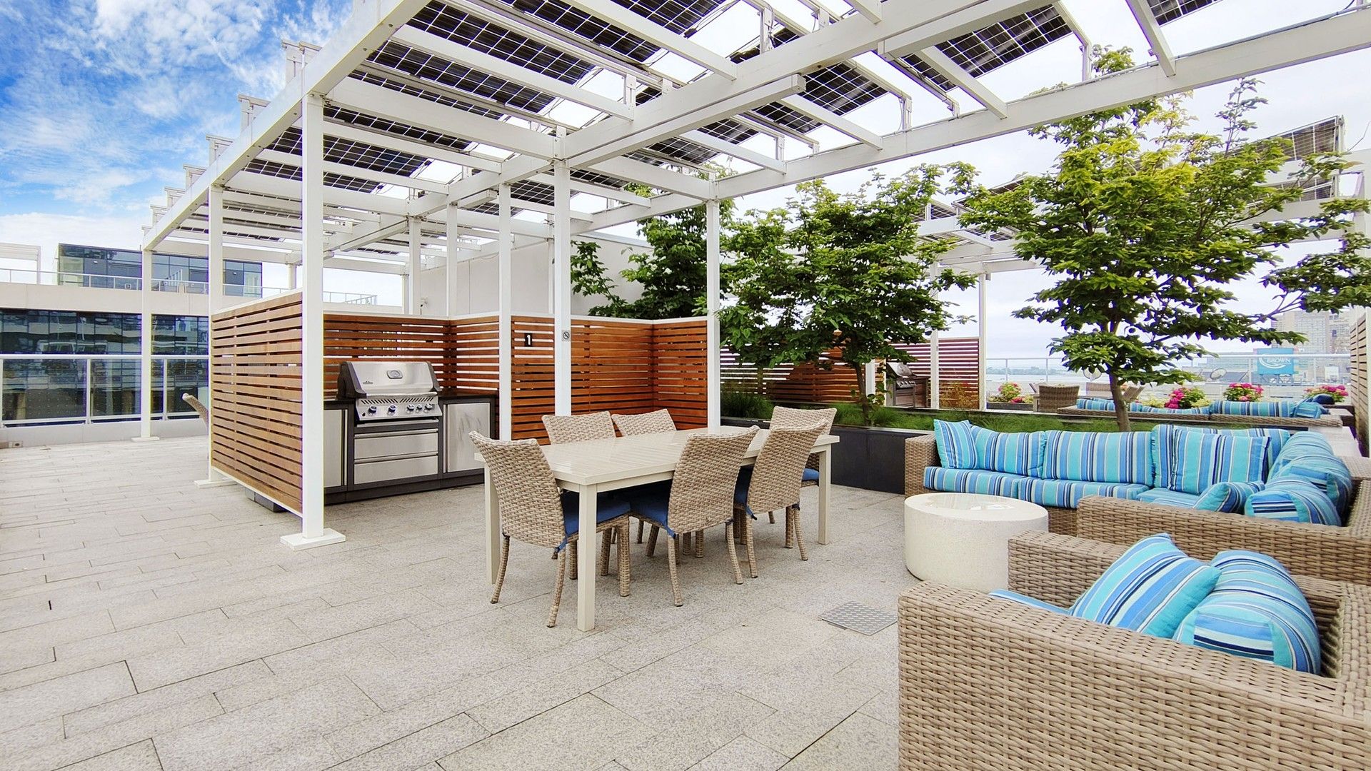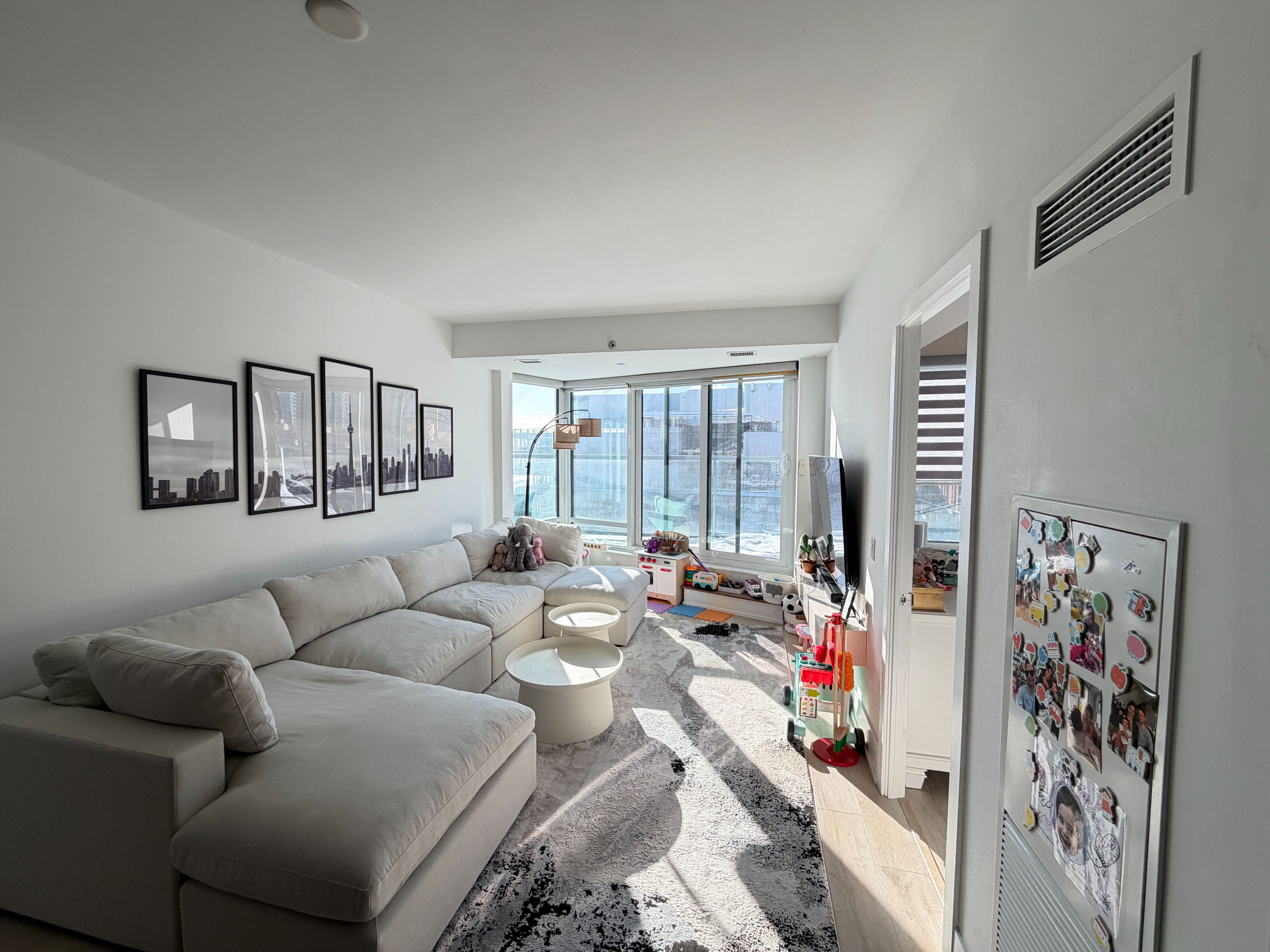 Welcome to this modern waterfront residence with a bright west exposure showcasing fantastic city and lake view. Featuring a highly functional open-concept layout with 9-foot ceilings and a terrace, offering 2 spacious bedrooms and a den. Enjoy seamless indoor-outdoor living with a walk-out terrace from your bedrooms and breathtaking city and water views. Elegant finishes include high-end laminate flooring throughout, a sleek contemporary kitchen with high-end appliances and backsplash, a double-door walk-in closet, a generous ensuite, and a mirrored closet in the second bedroom. Guest bbq connection available on the terrace. Unbeatable waterfront location on the boardwalk-steps to sugar beach, ttc, george brown college, and minutes to loblaws, farm boy, lcbo, distillery district, st. Lawrence market, union station, and more.
