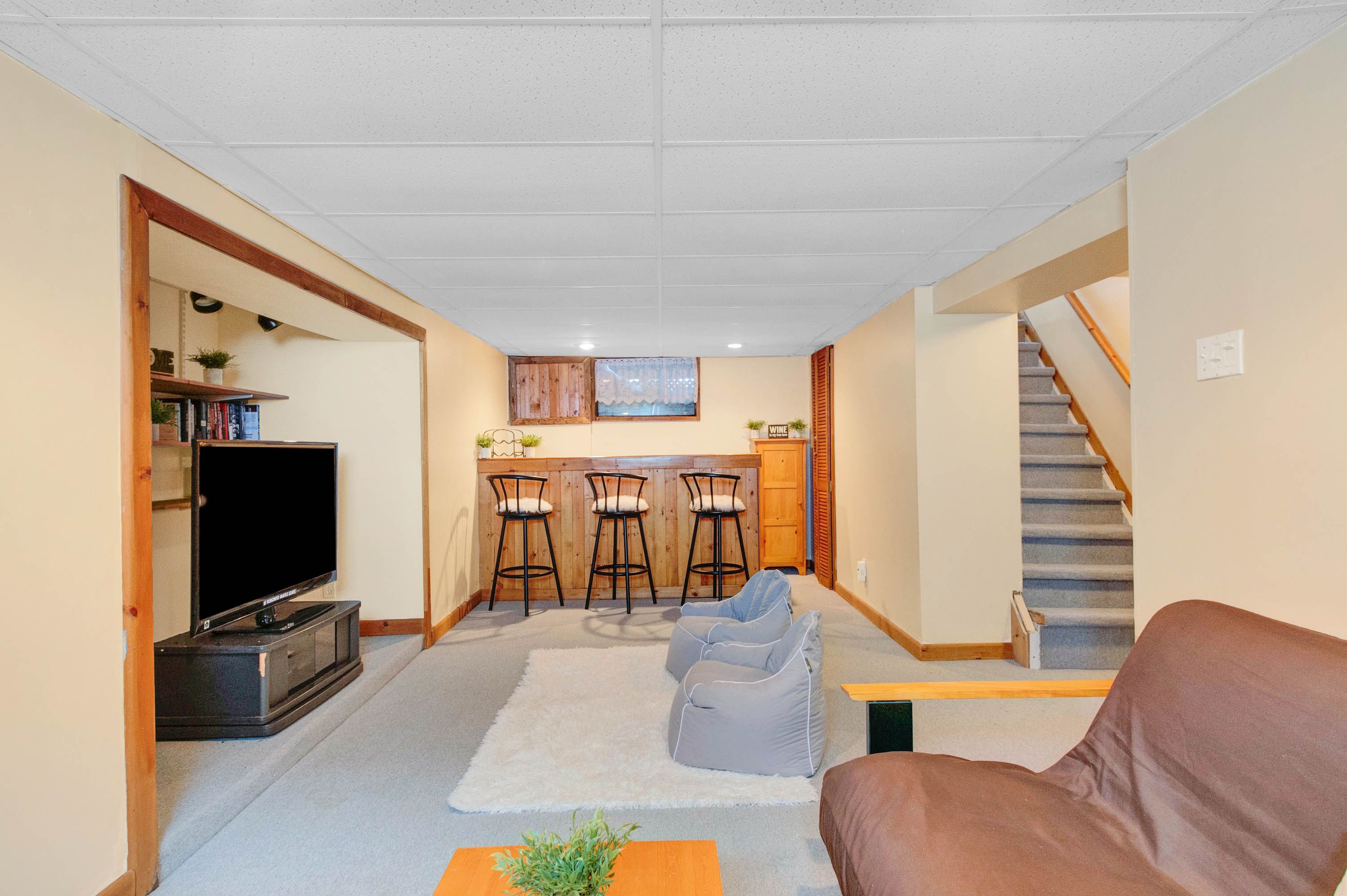 • Cozy lower level with recreation room, gas fireplace, and dry bar.