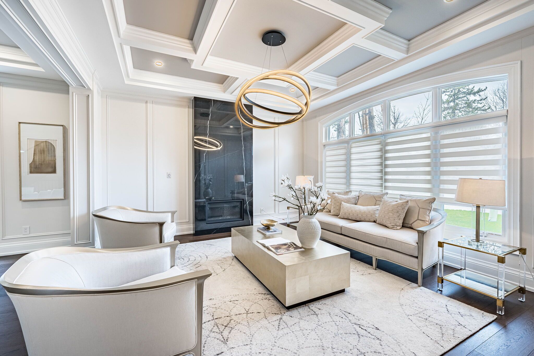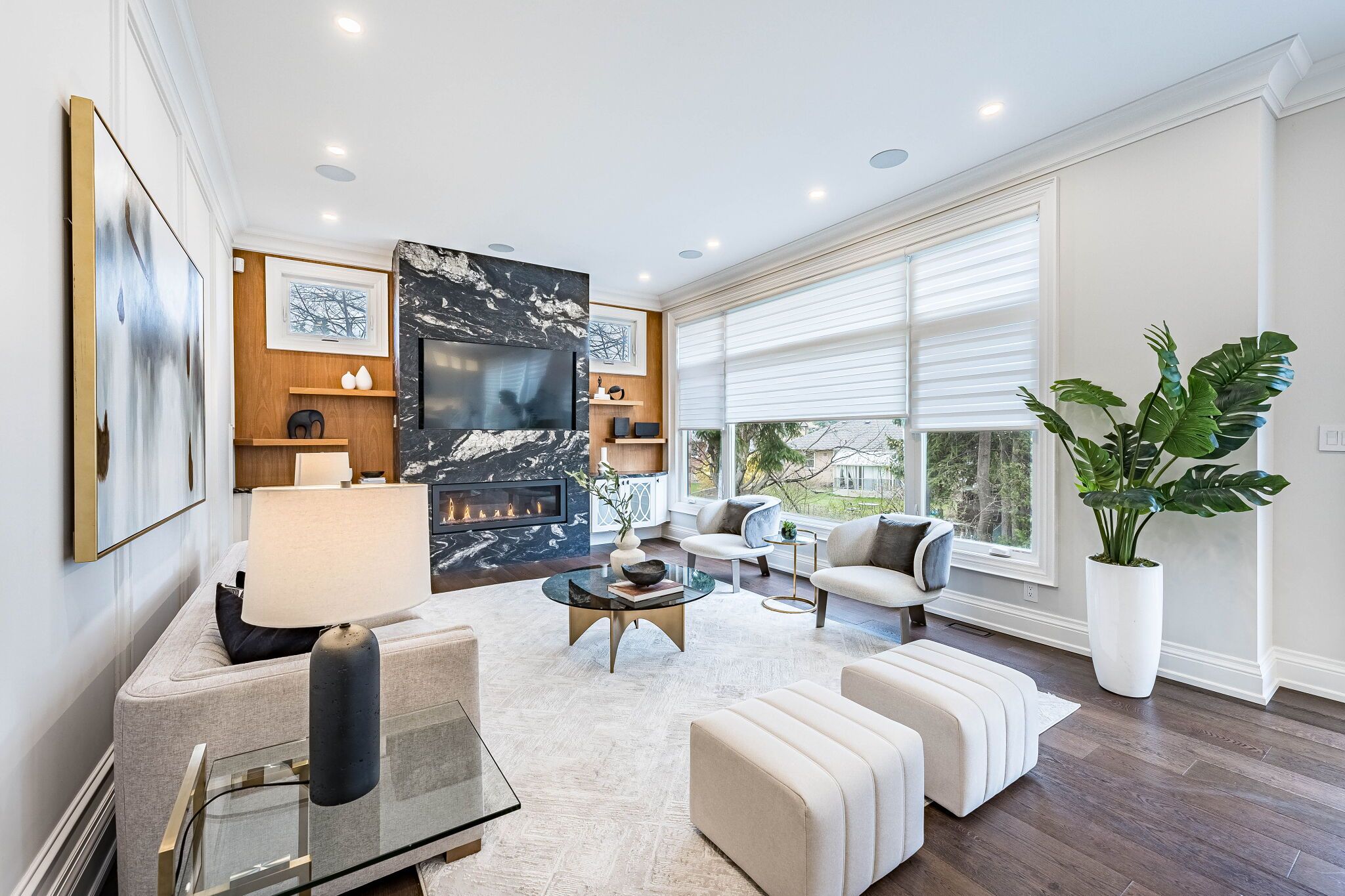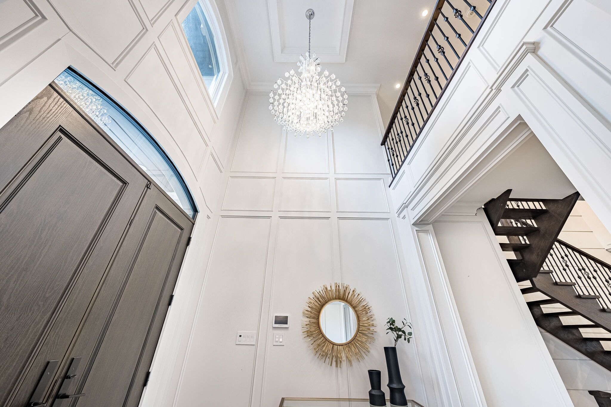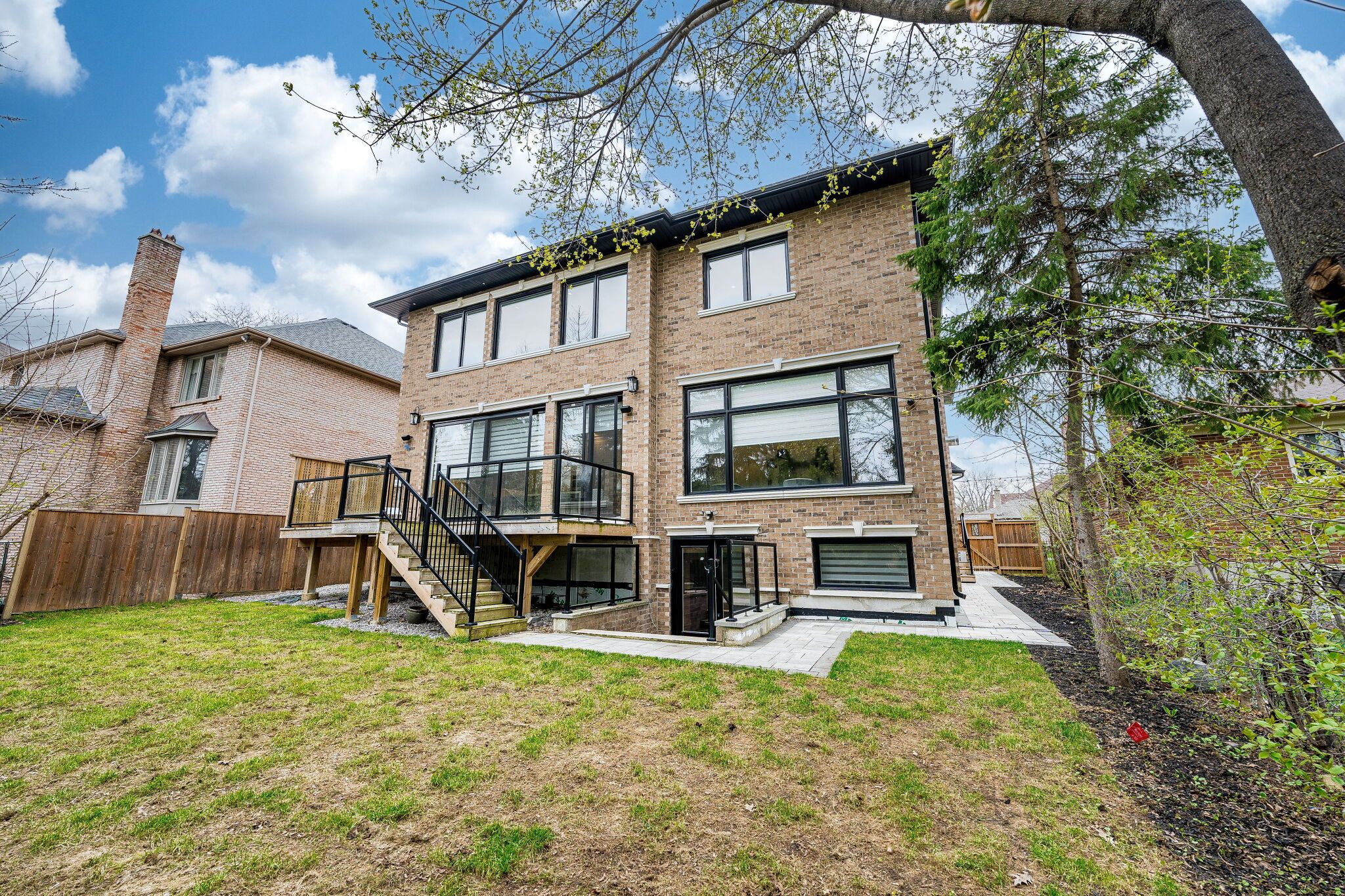 An exceptional custom-built masterpiece in prestigious newtonbrook east. Welcome to this remarkable custom-built (2022) residence set on a rare irregular lot with 65 ft frontage expanding to 124 ft deep. Offering approx. 7,000 sq. Ft. Of total living space, this home blends timeless elegance with modern luxury. A striking indiana stone façade, grand precast entrance, and custom double doors create a commanding presence, complemented by a double-car garage and an extended driveway accommodating up to 6 vehicles. Inside, a breathtaking 20-ft foyer and soaring 10-ft ceilings on the main and second floors (9-ft in basement) create a grand, airy atmosphere. An in-home elevator provides seamless access to all levels, enhancing both convenience and long-term comfort. Exquisite craftsmanship is showcased throughout with full panelled walls, extensive wainscoting, and detailed trim work. The main floor offers a refined walnut-paneled library-ideal for a private office or study. This home is equipped with a fully integrated control4 smart home system featuring an 8-zone audio amplifier, allowing effortless control of lighting, climate, alarm, audio, garage doors, and smart locks directly from your phone or tablet. The chef-inspired kitchen boasts premium custom cabinetry, a separate pantry, and elegant calacatta quartz countertops and backsplash, complemented by top-of-the-line sub-zero and miele appliances. The space flows seamlessly into expansive living and family areas with designer fireplaces and custom wall units-perfect for both everyday living and entertaining. Oversized rear doors open to a spacious deck, creating a seamless indoor-outdoor experience. Upstairs, the primary suite offers a luxurious retreat with a custom makeup station and an expansive walk-in dressing room with built-ins. The spa-inspired ensuite features heated flooring and high-end finishes, while all additional bedrooms include their own ensuite bathrooms and ample closet space