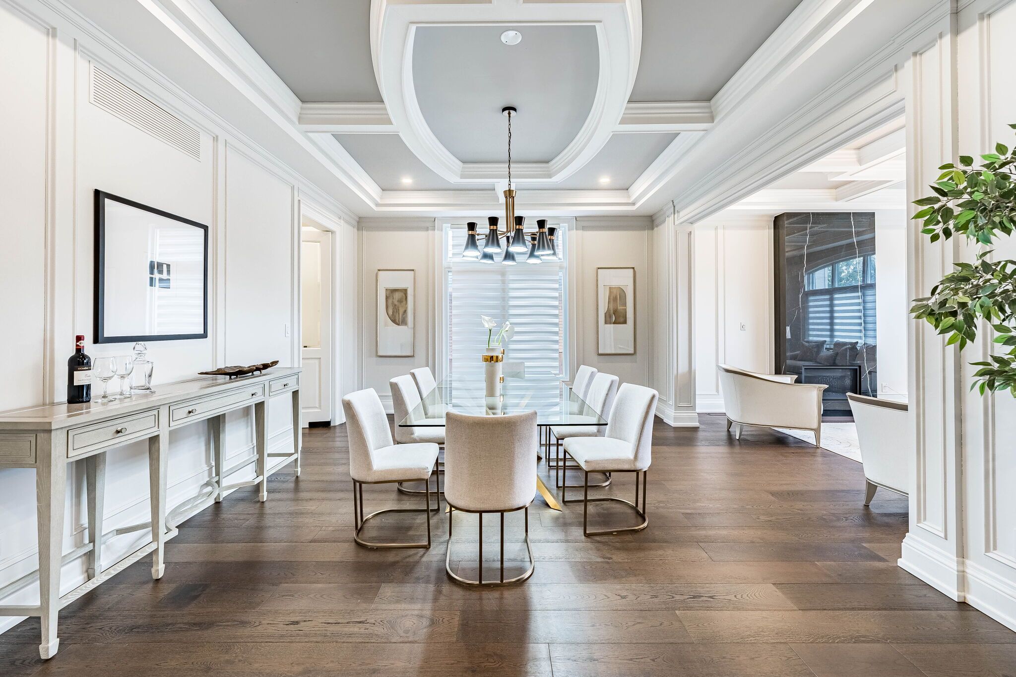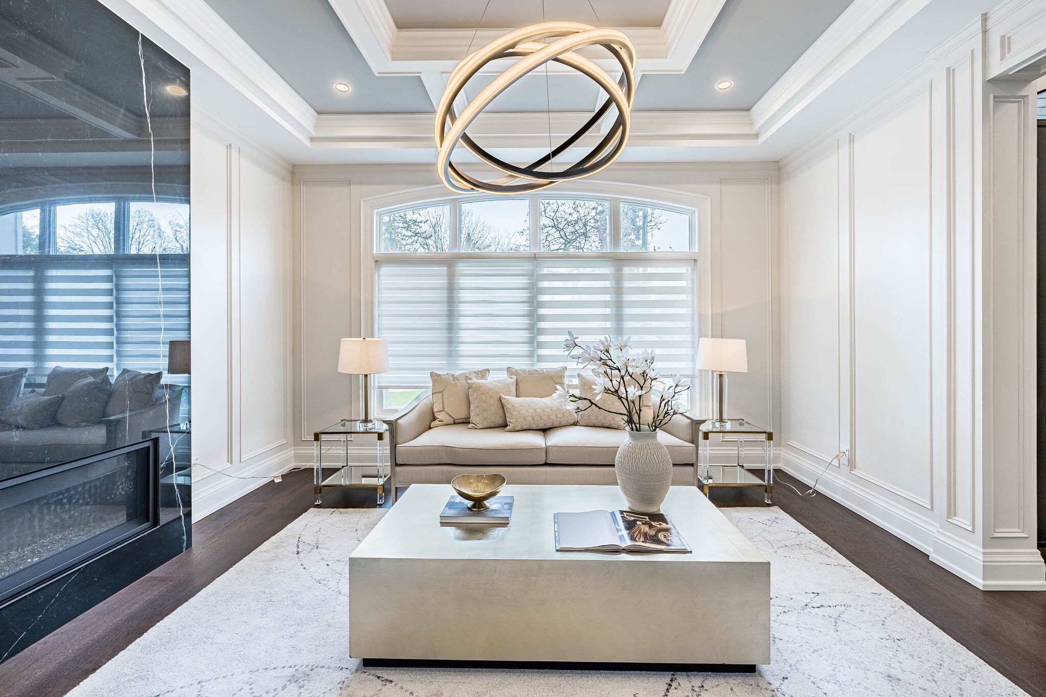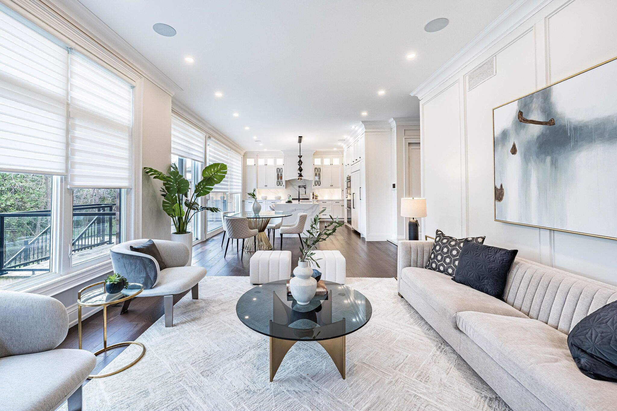 An exceptional custom-built masterpiece in prestigious newtonbrook east. Welcome to this remarkable custom-built (2022) residence set on a rare irregular lot with 65 ft frontage expanding to 124 ft deep. Offering approx. 7,000 sq. Ft. Of total living space, this home blends timeless elegance with modern luxury. A striking indiana stone façade, grand precast entrance, and custom double doors create a commanding presence, complemented by a double-car garage and an extended driveway accommodating up to 6 vehicles. Inside, a breathtaking 20-ft foyer and soaring 10-ft ceilings on the main and second floors (9-ft in basement) create a grand, airy atmosphere. An in-home elevator provides seamless access to all levels, enhancing both convenience and long-term comfort. Exquisite craftsmanship is showcased throughout with full panelled walls, extensive wainscoting, and detailed trim work. The main floor offers a refined walnut-paneled library-ideal for a private office or study. This home is equipped with a fully integrated control4 smart home system featuring an 8-zone audio amplifier, allowing effortless control of lighting, climate, alarm, audio, garage doors, and smart locks directly from your phone or tablet. The chef-inspired kitchen boasts premium custom cabinetry, a separate pantry, and elegant calacatta quartz countertops and backsplash, complemented by top-of-the-line sub-zero and miele appliances. The space flows seamlessly into expansive living and family areas with designer fireplaces and custom wall units-perfect for both everyday living and entertaining. Oversized rear doors open to a spacious deck, creating a seamless indoor-outdoor experience. Upstairs, the primary suite offers a luxurious retreat with a custom makeup station and an expansive walk-in dressing room with built-ins. The spa-inspired ensuite features heated flooring and high-end finishes, while all additional bedrooms include their own ensuite bathrooms and ample closet space