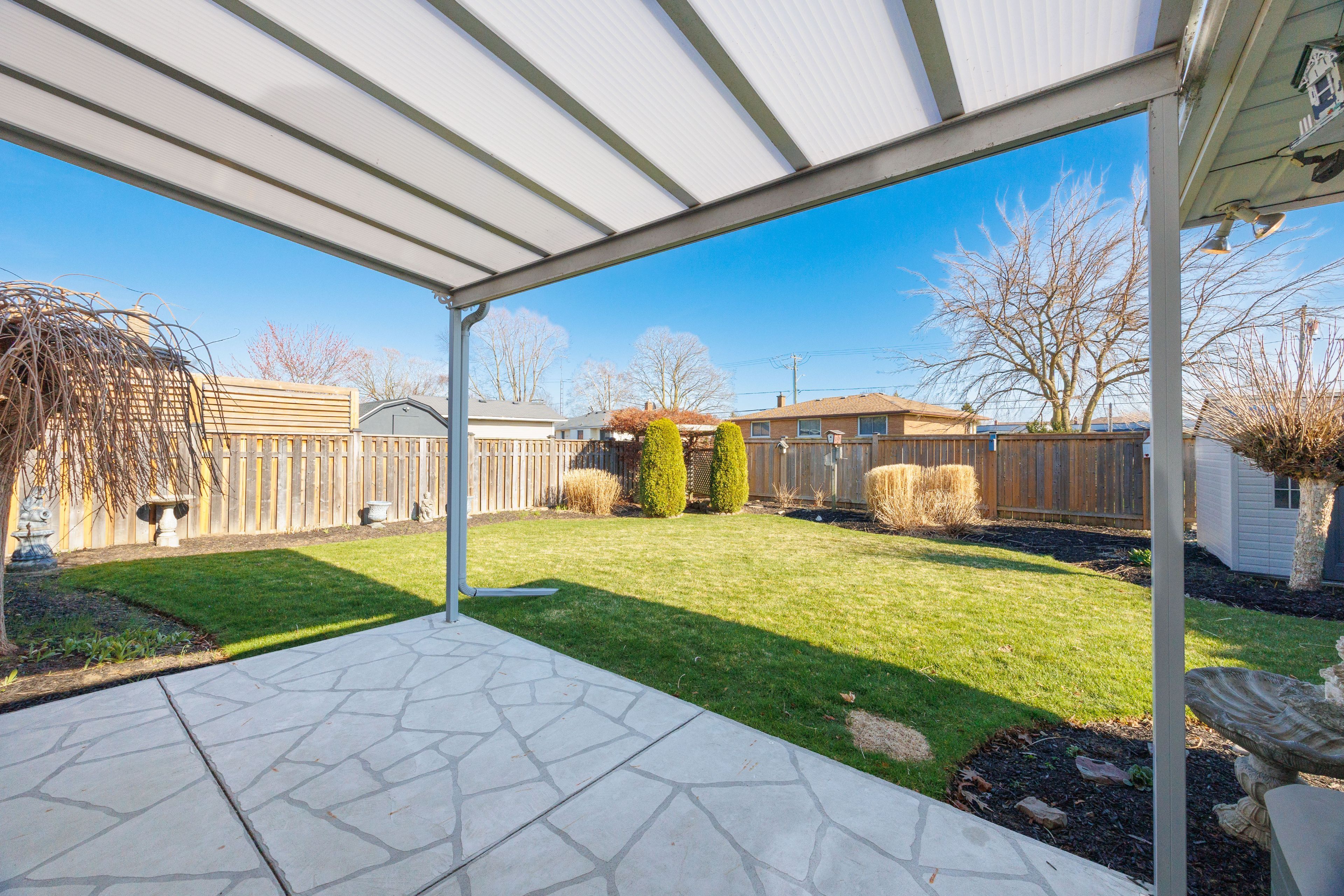 • Fenced backyard with covered patio and beautiful perennial gardens.