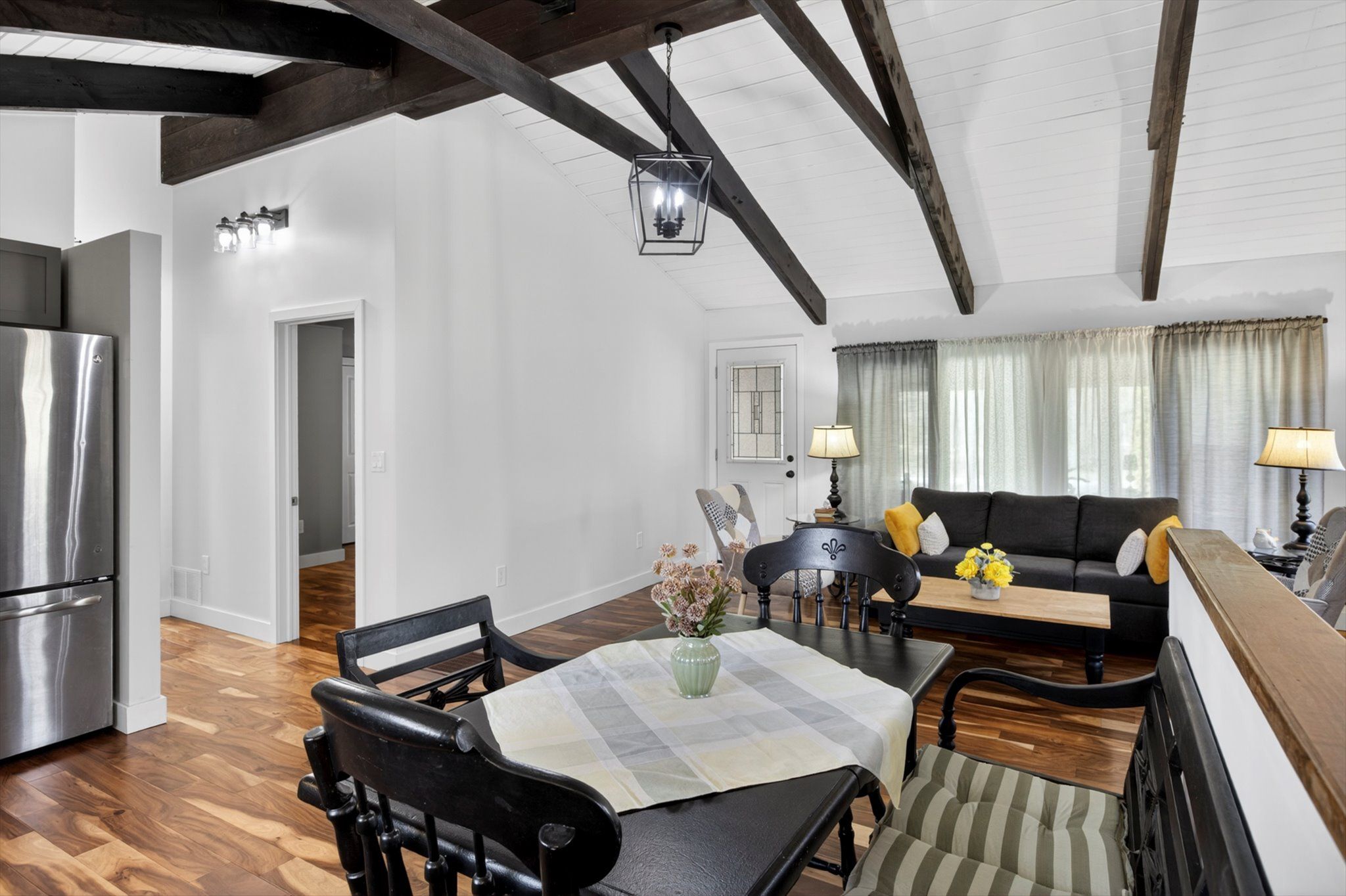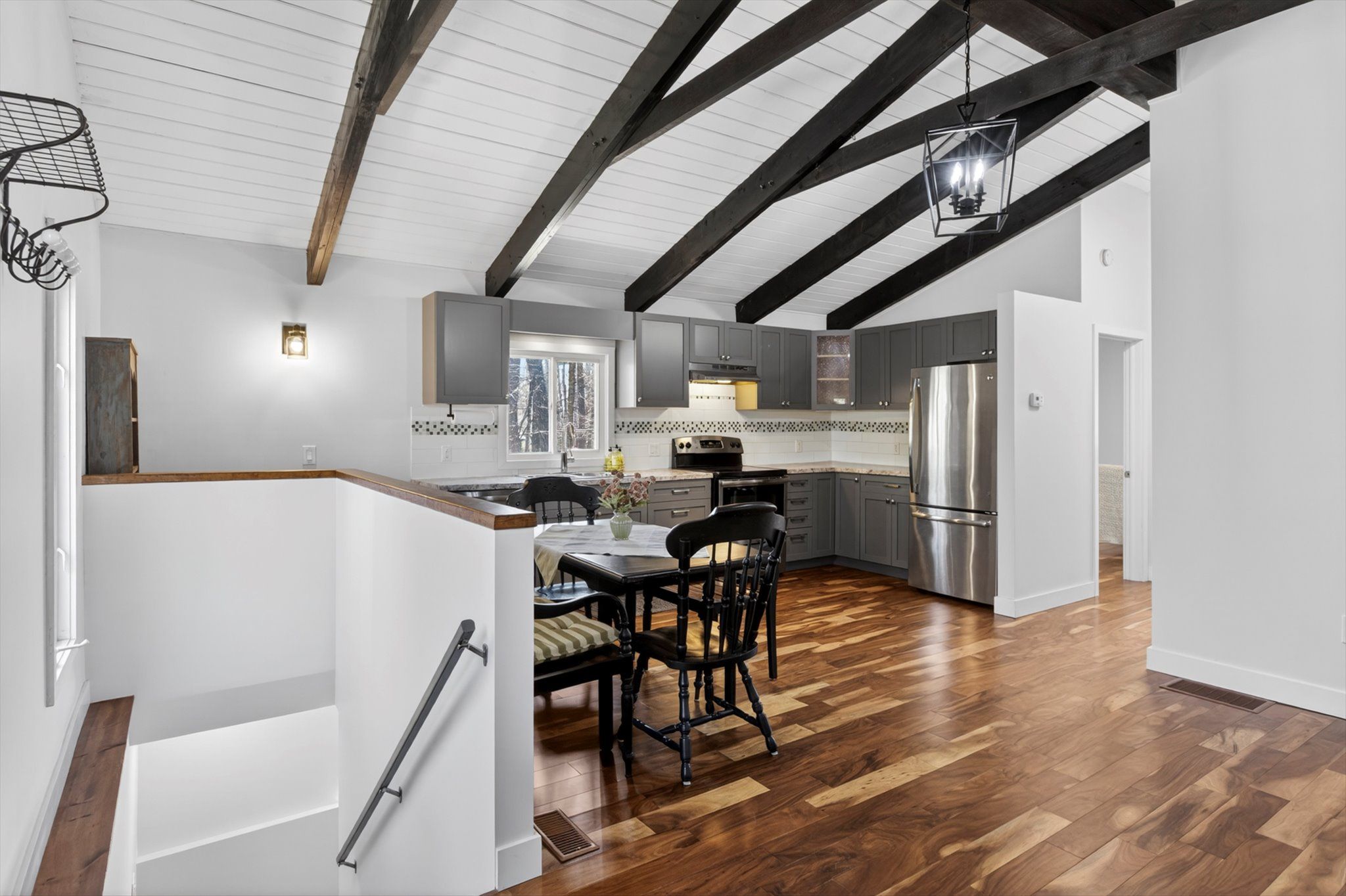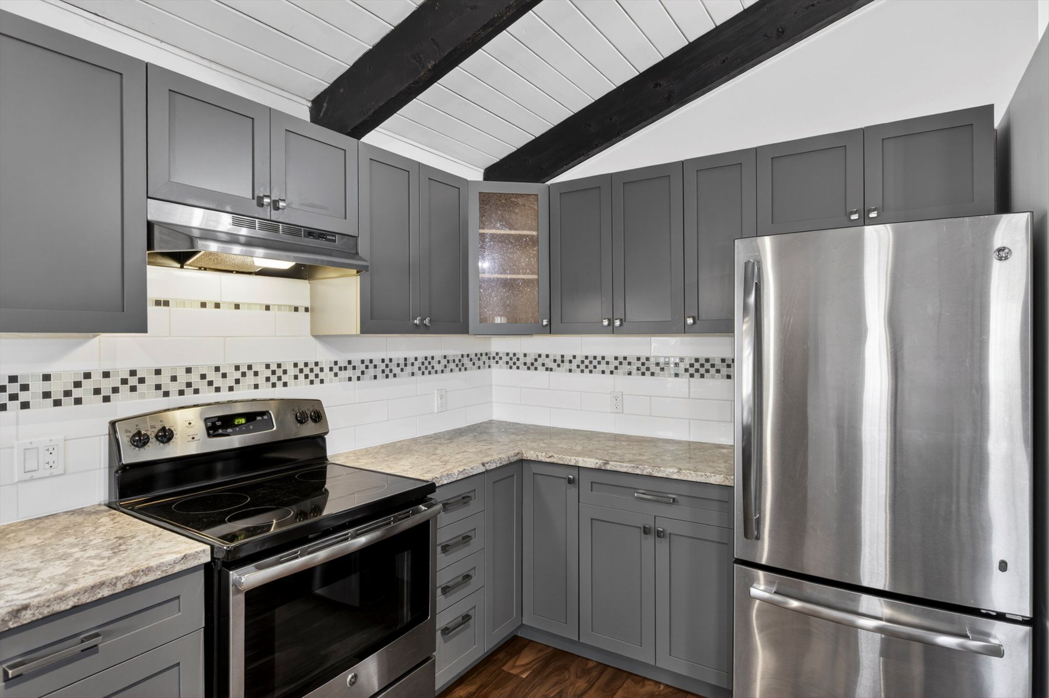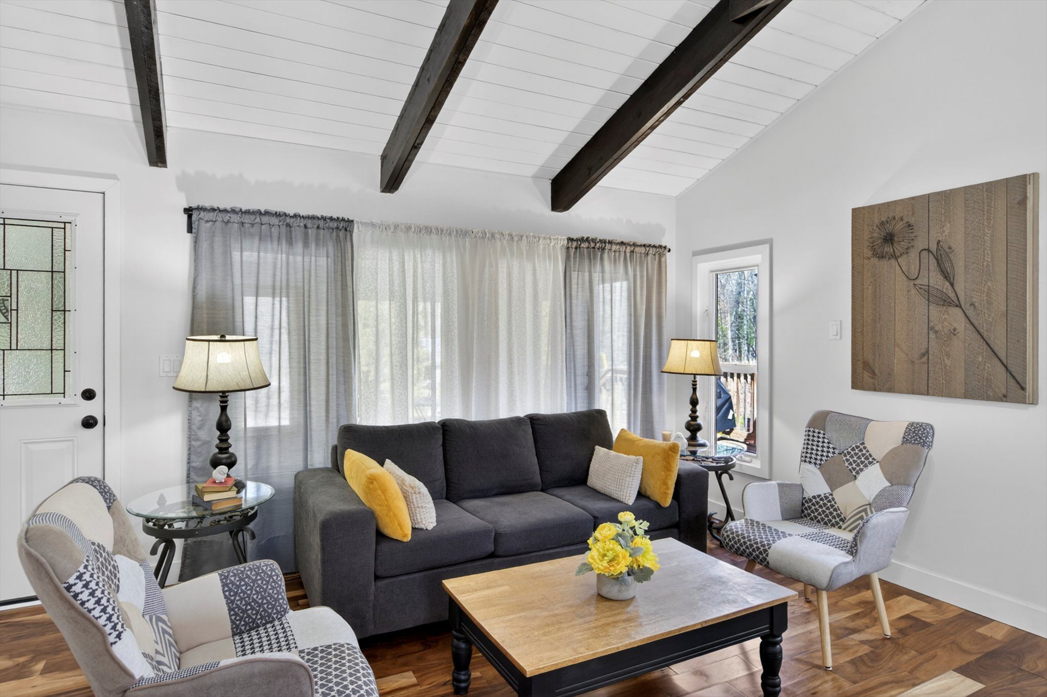 • Bright open-concept main floor with vaulted ceilings and a modern kitchen.