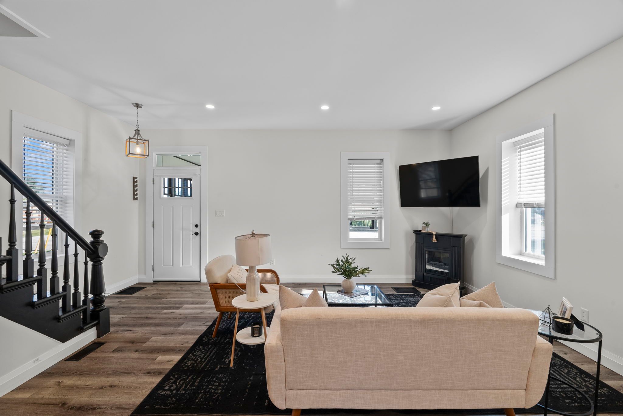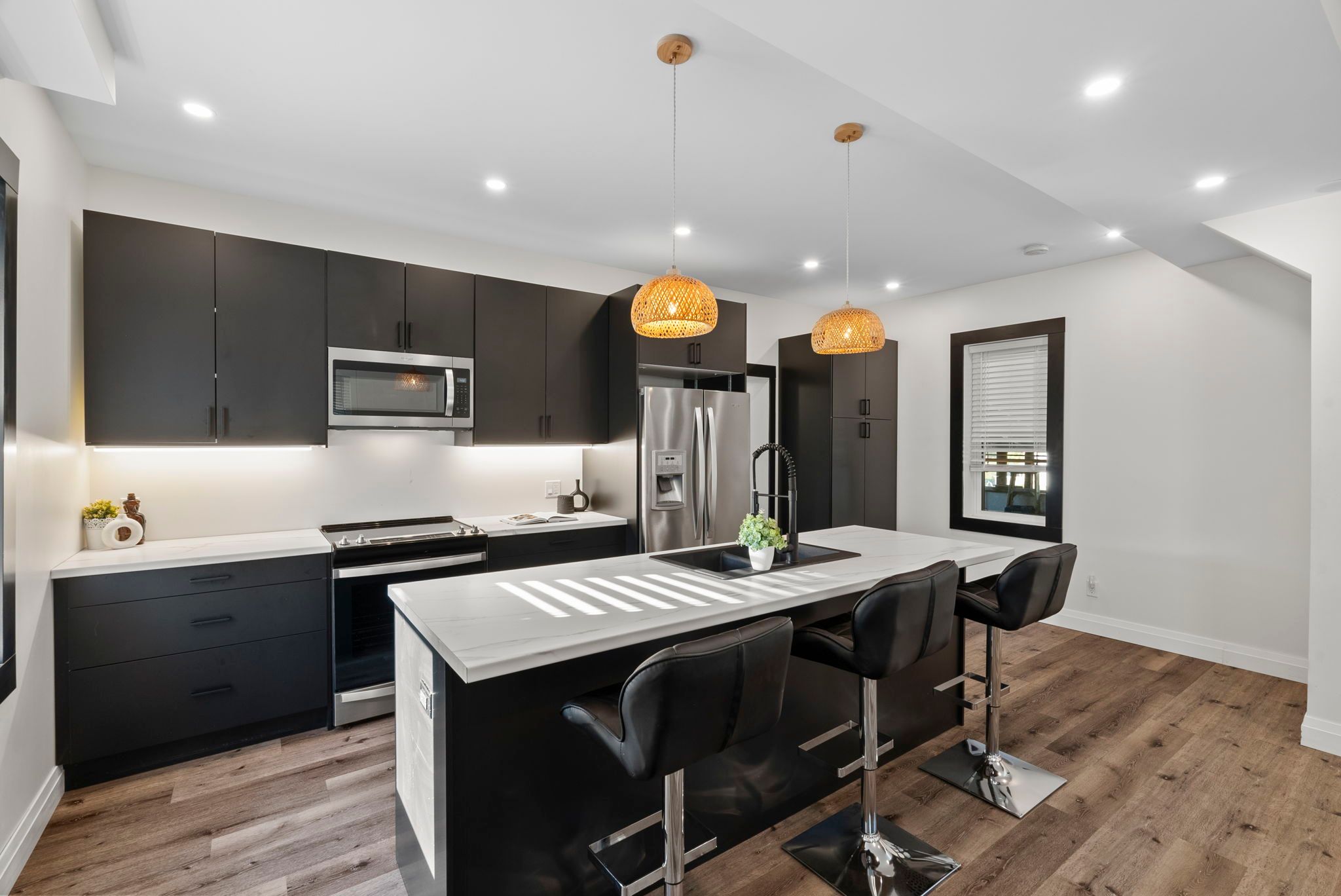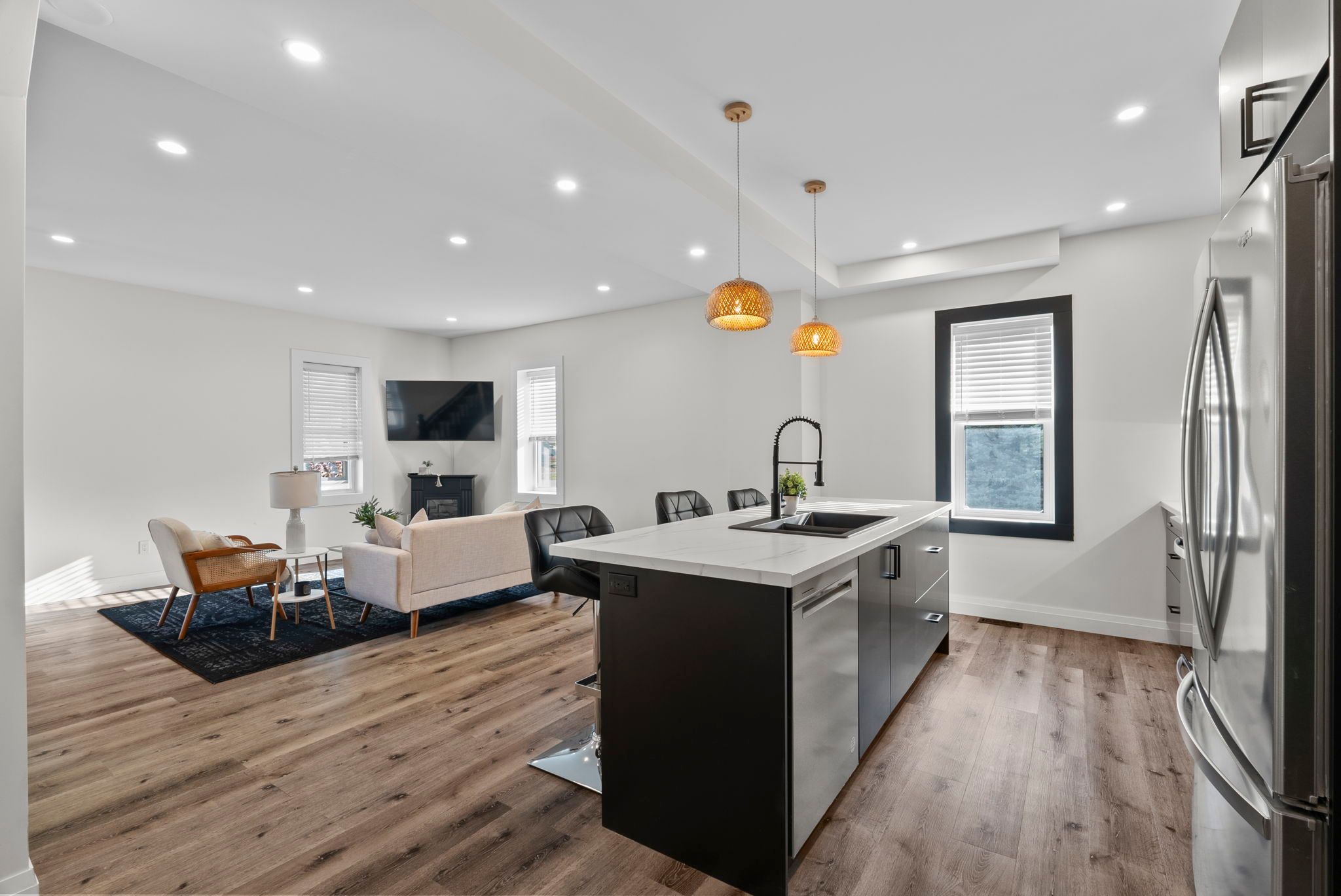 • Renovated yellow brick home with modern open-concept design and luxury vinyl flooring.