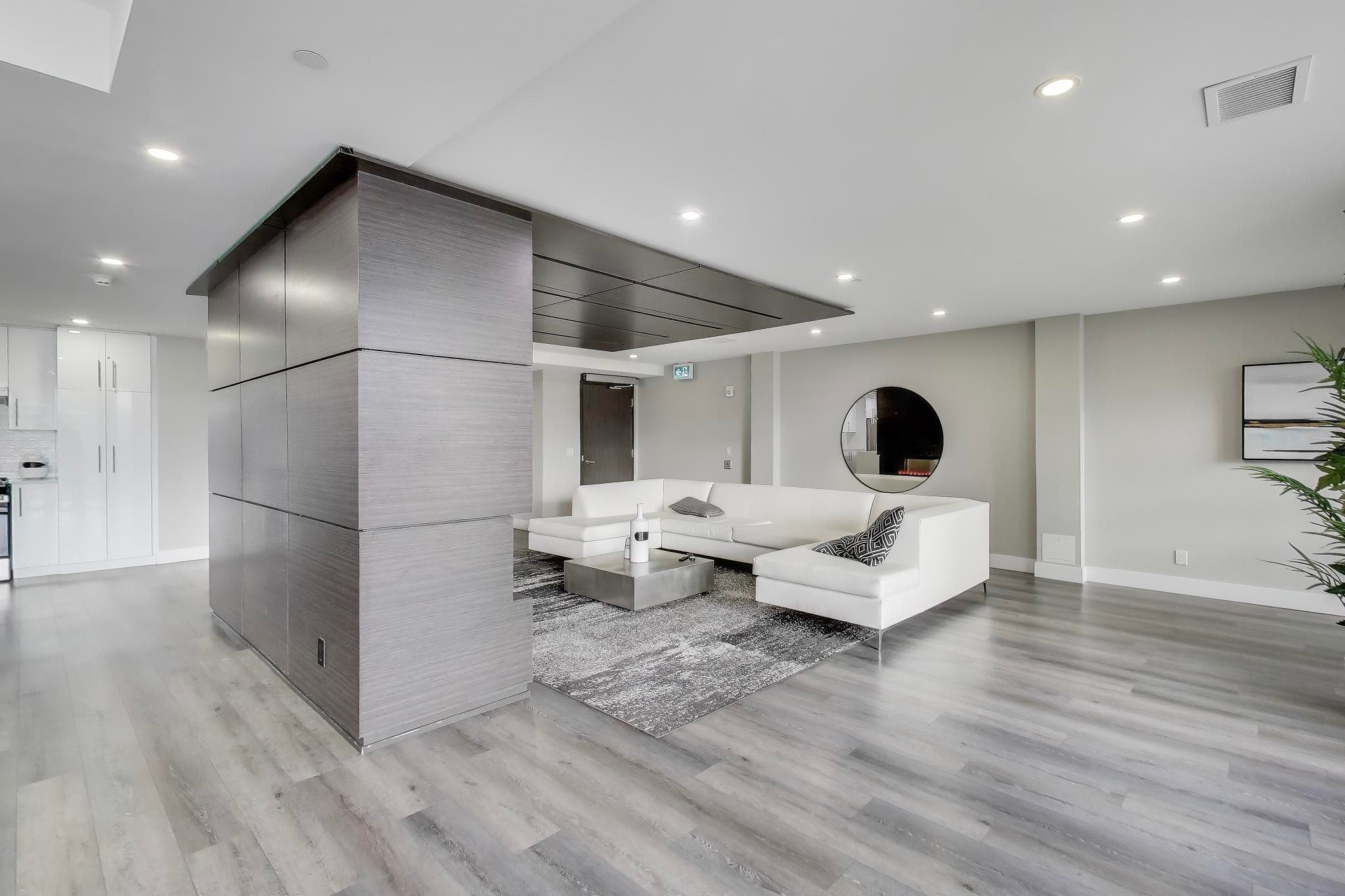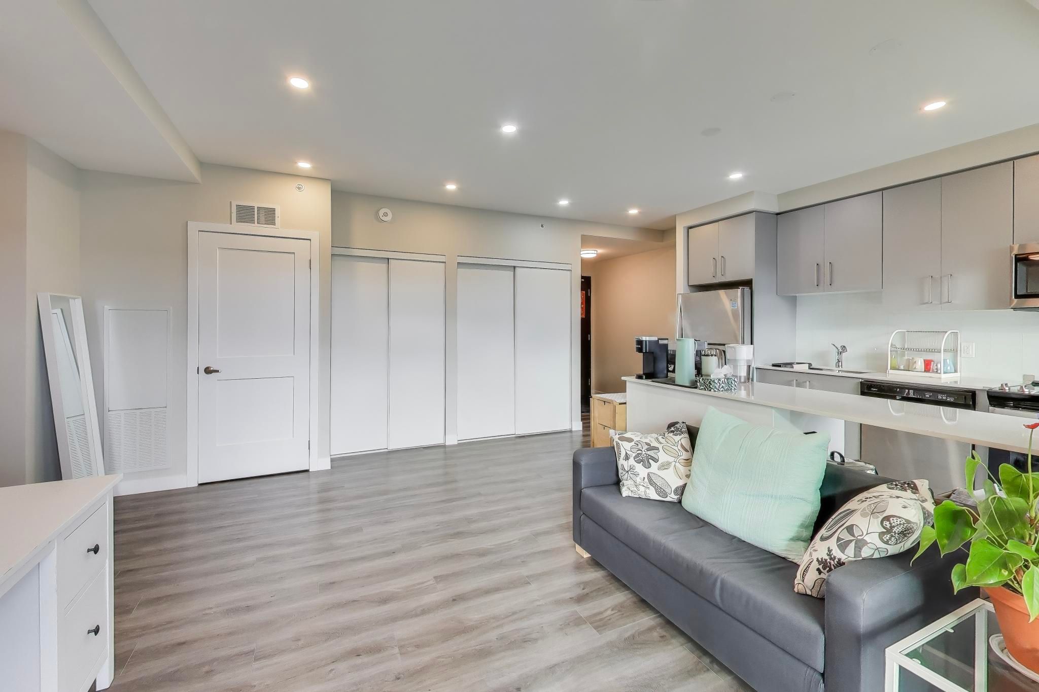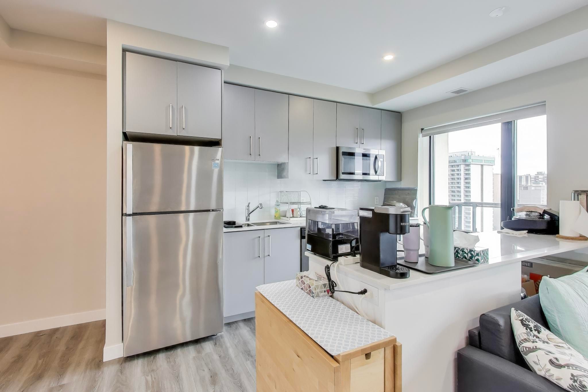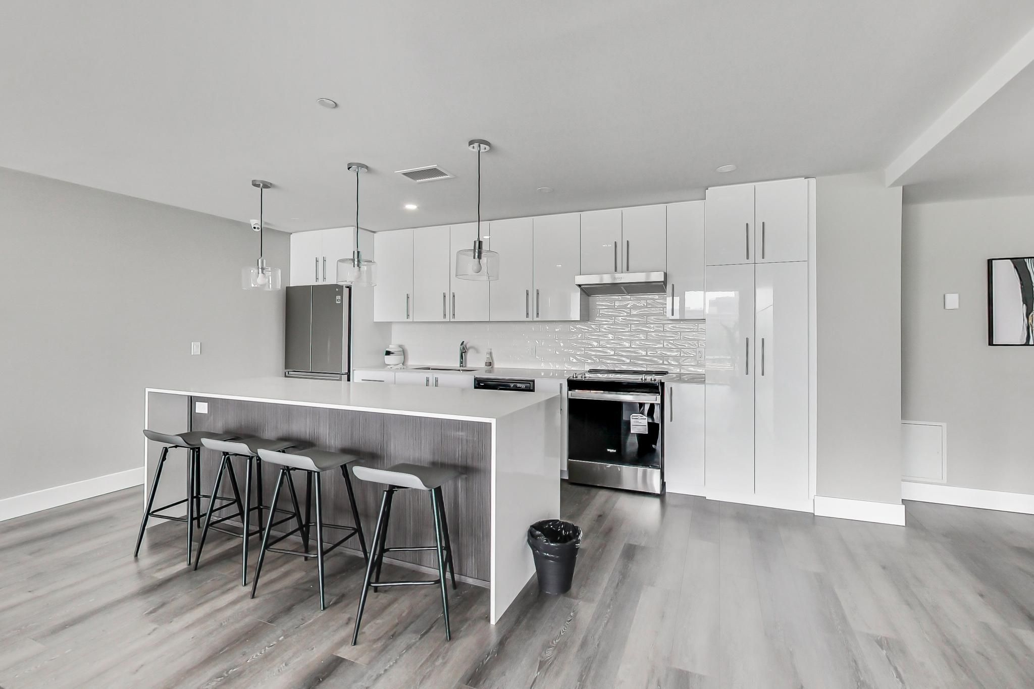 • Stylish open-concept layout with 9-foot ceilings and laminate flooring throughout.