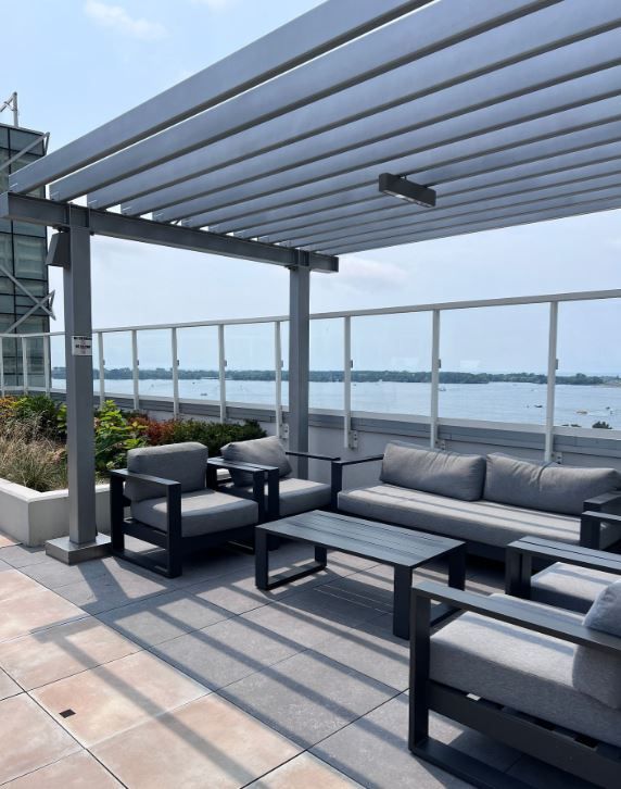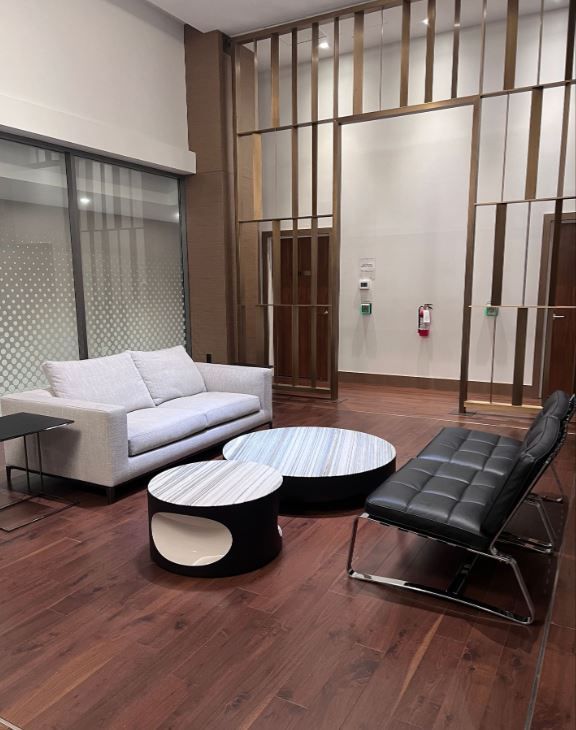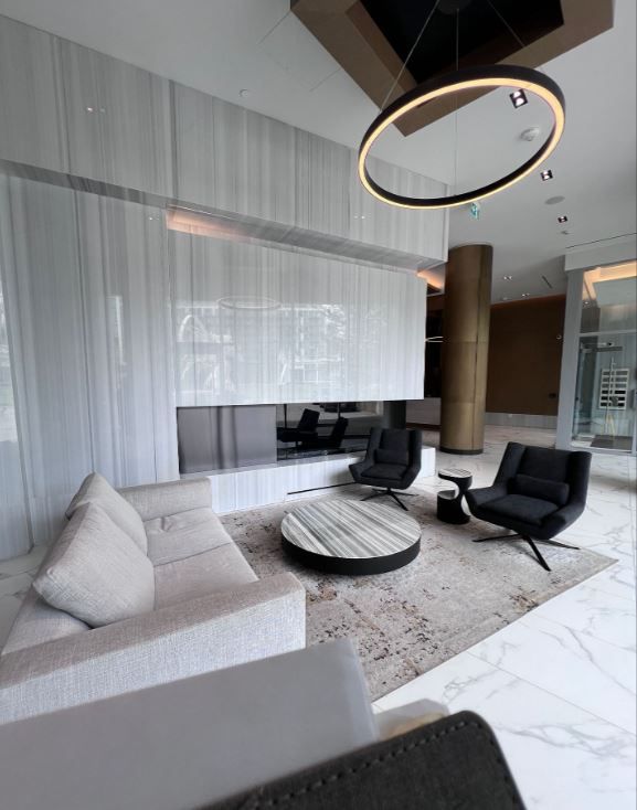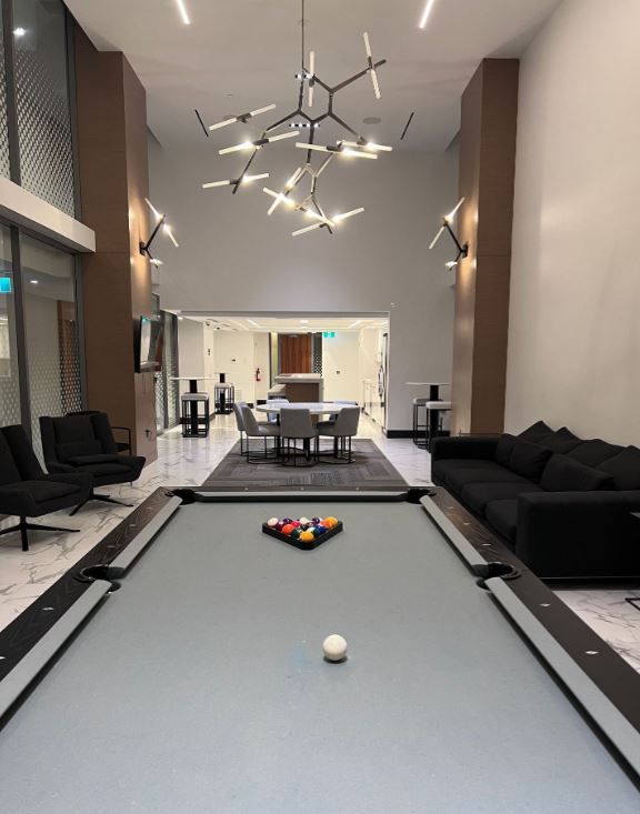 • Building amenities include a pool, gym, yoga room, and more.