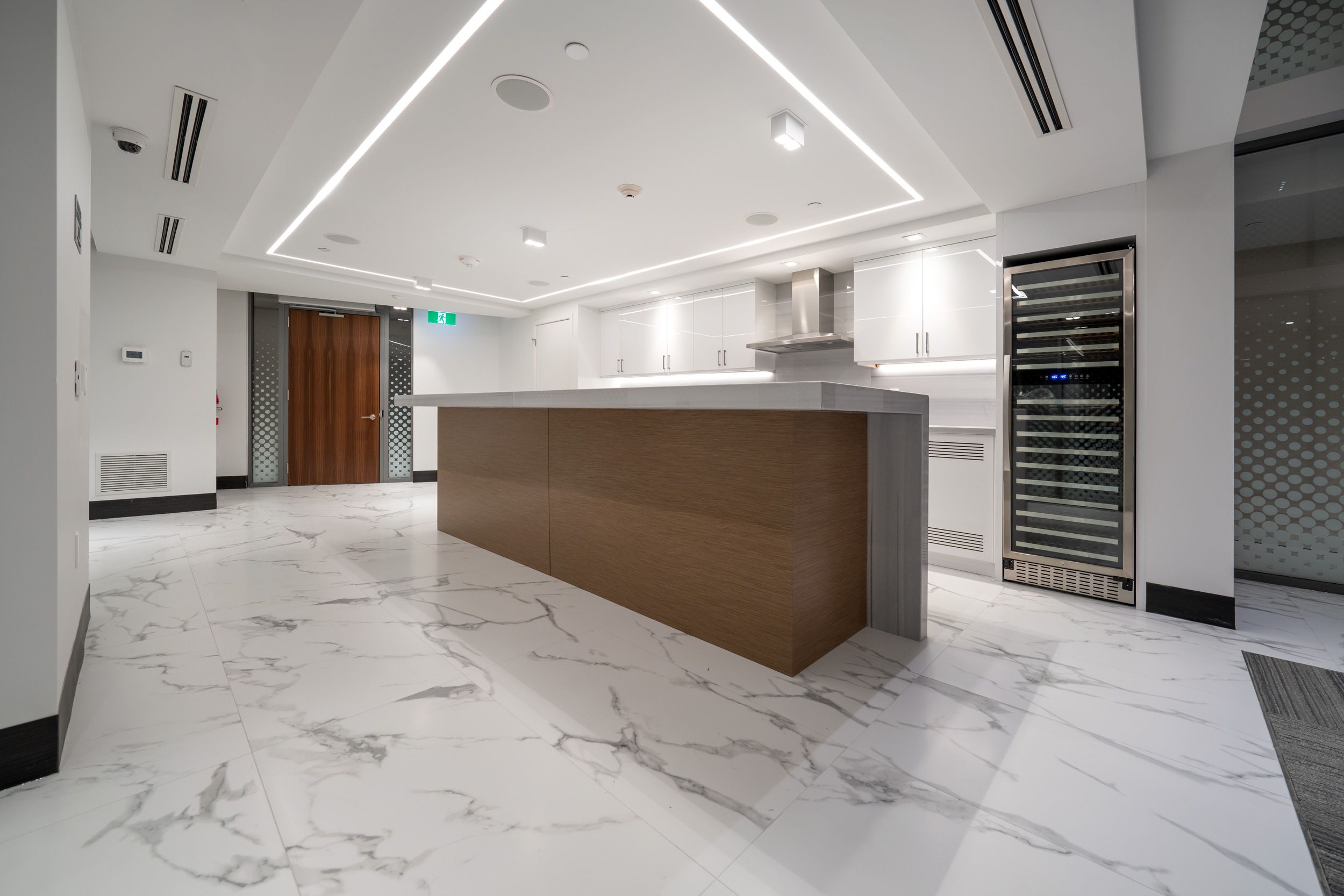 • Bright floor-to-ceiling windows offer stunning lake views.