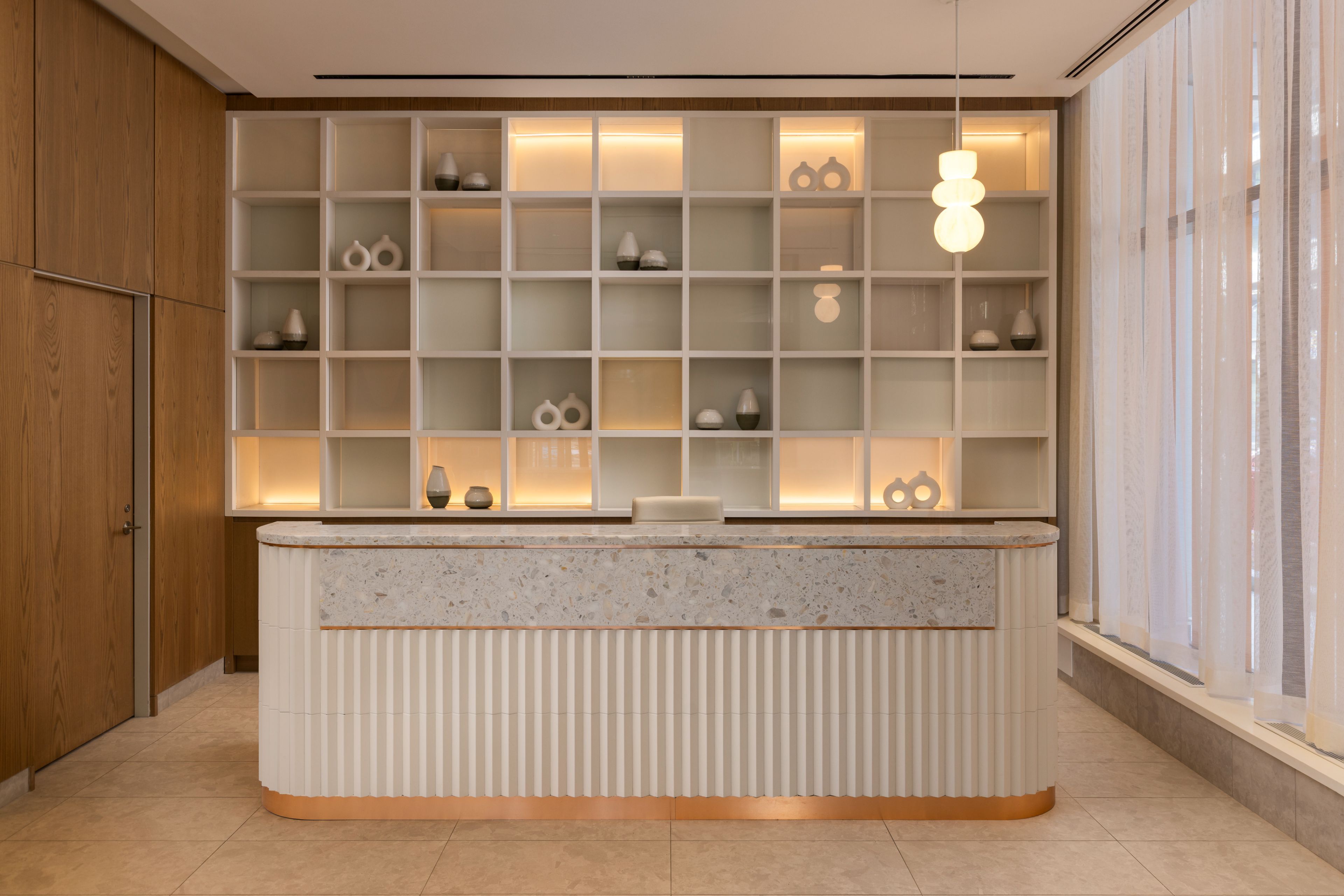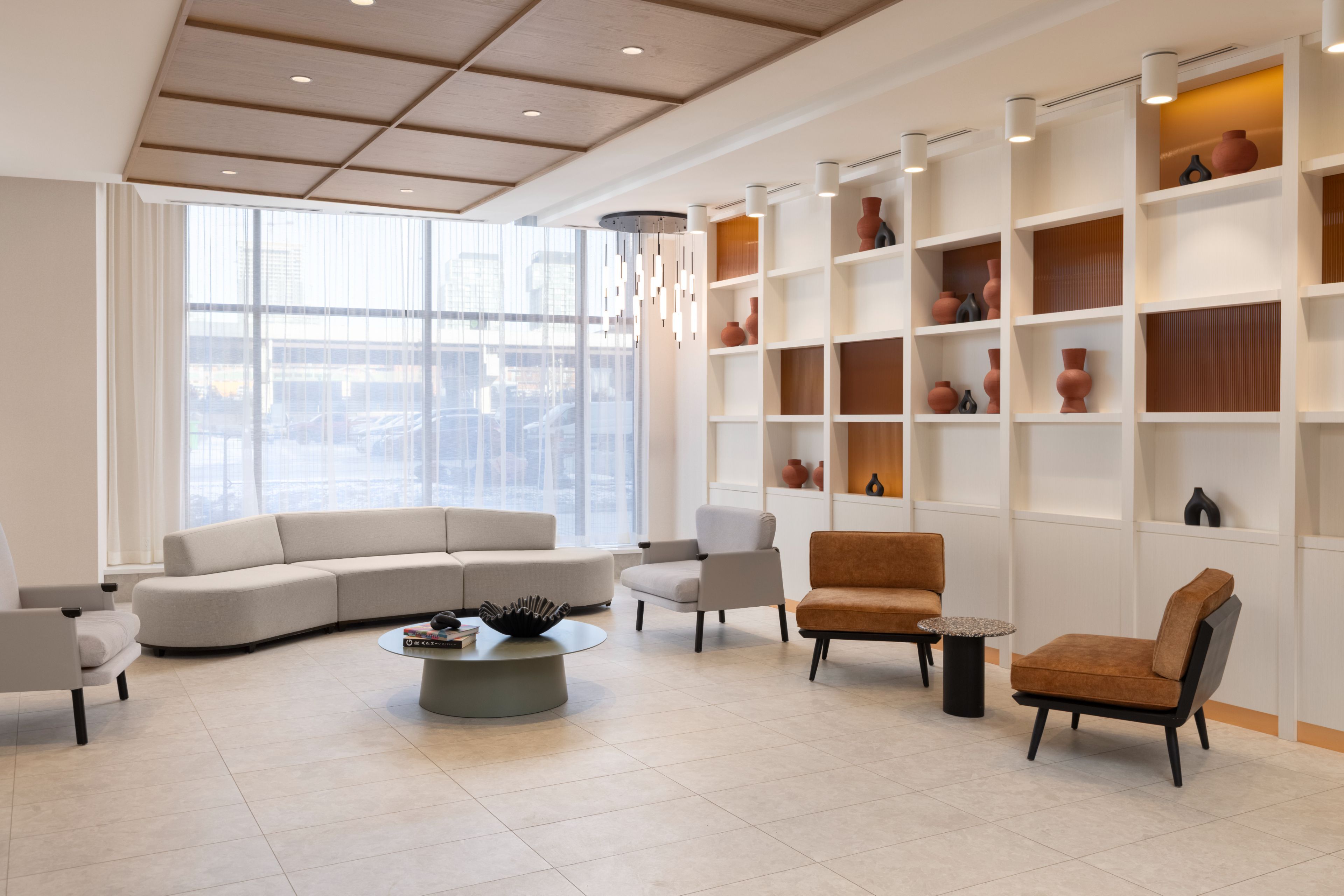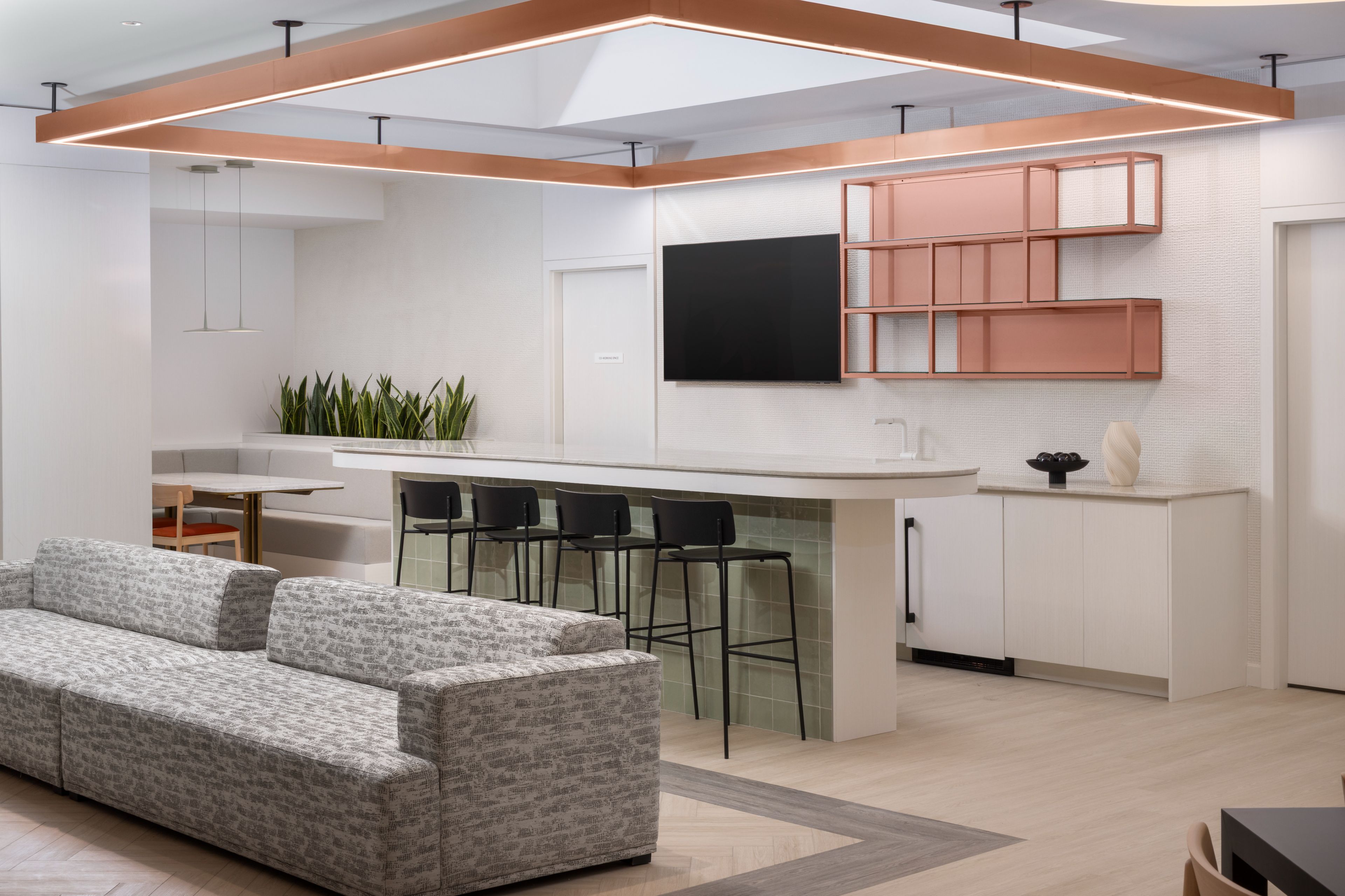 • Building features a gym, study lounge, and co-working space.